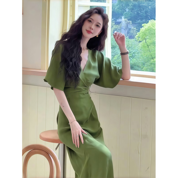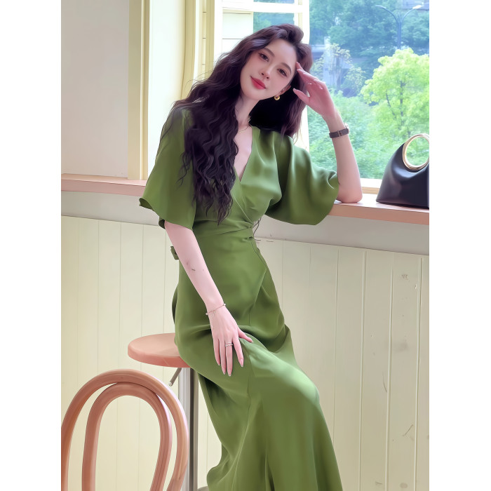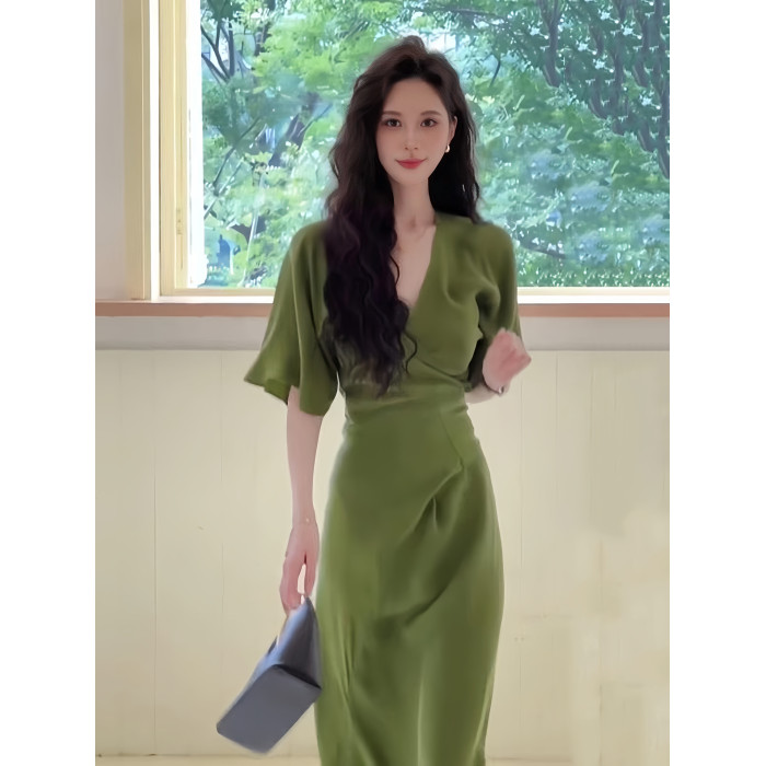 綠色連衣裙女2025年夏季新款今年流行爆款巨好看掐腰顯瘦V領長裙