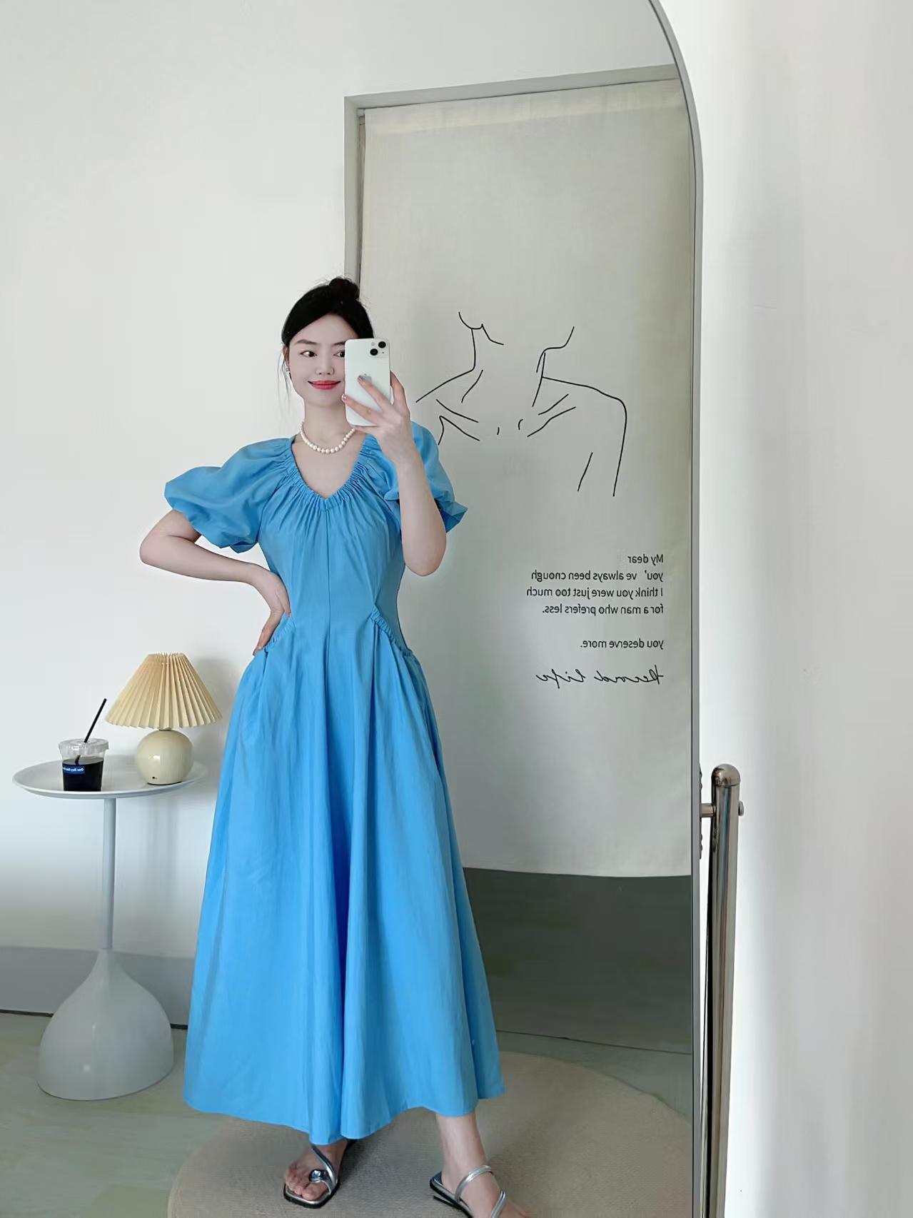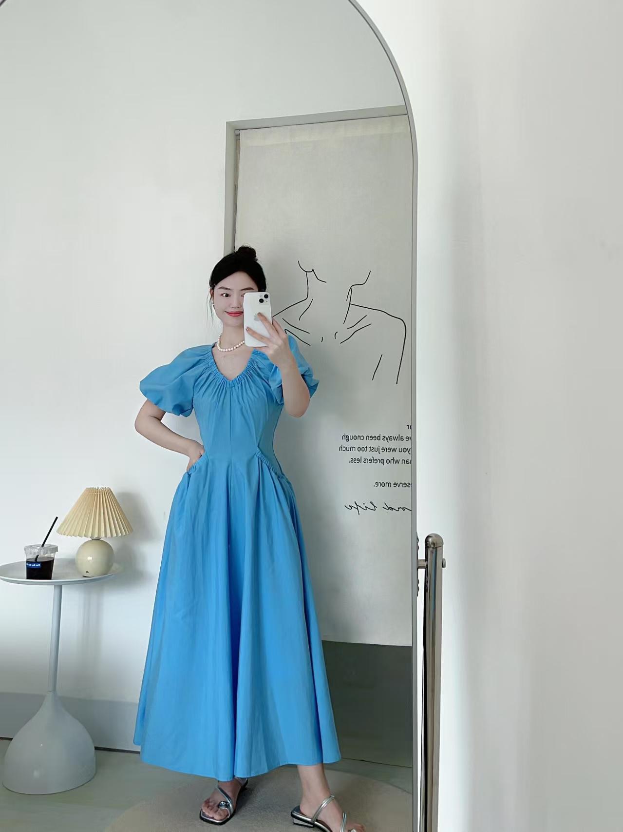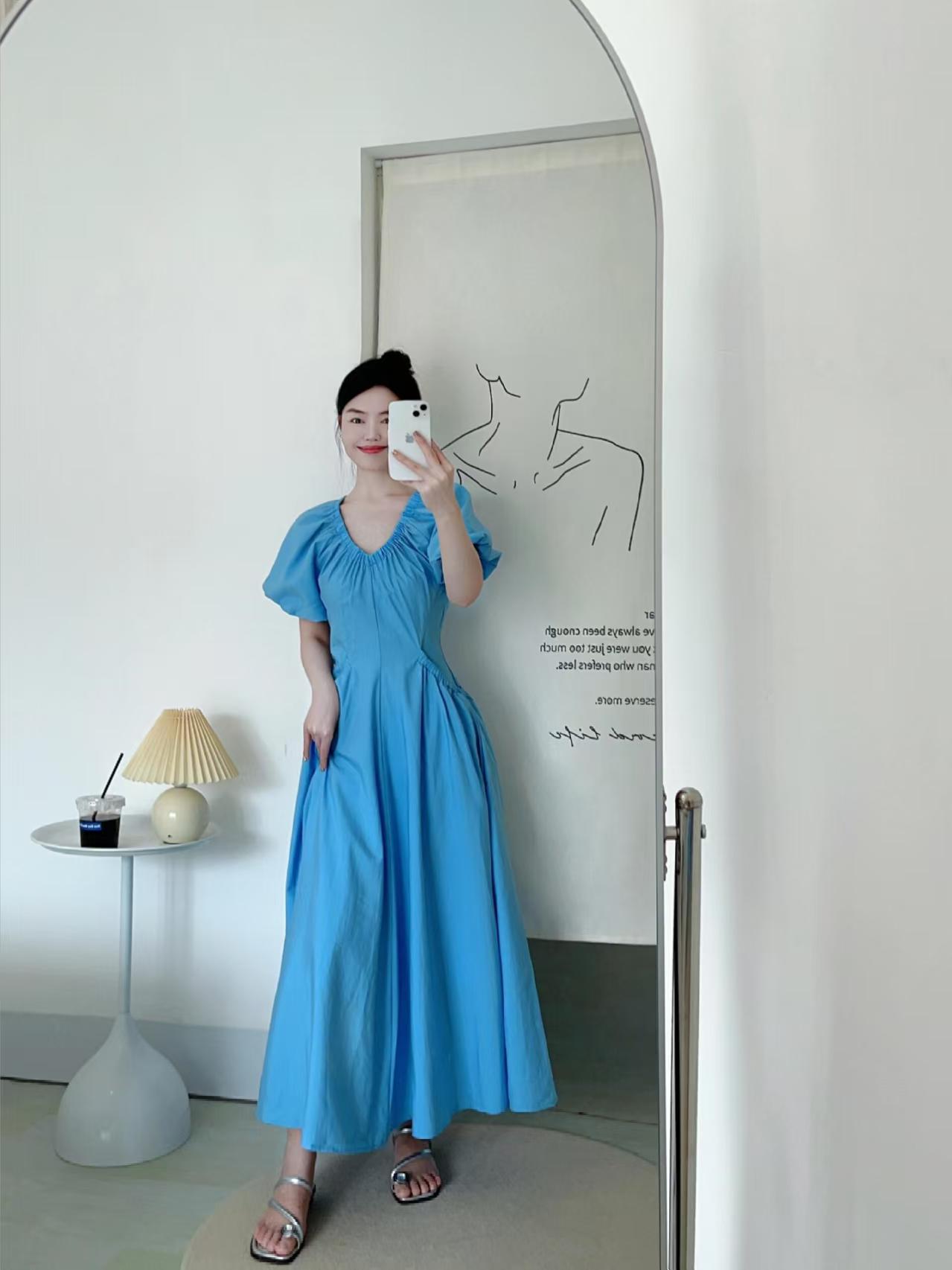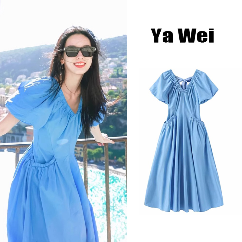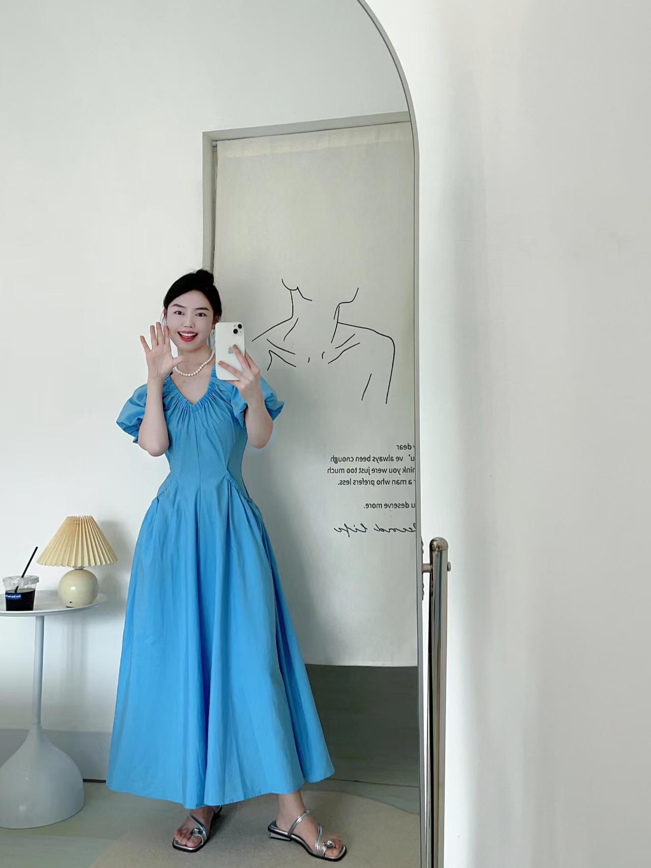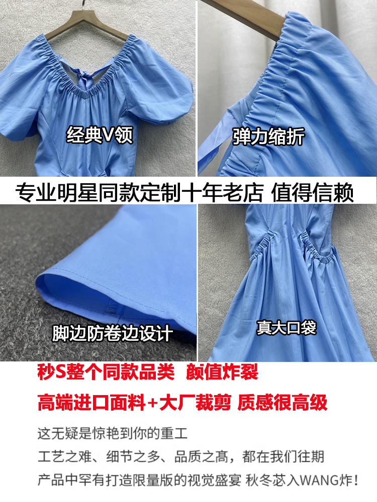 周也同款藍色短袖V領連衣裙女夏季2025新款收腰氣質度假風長裙子