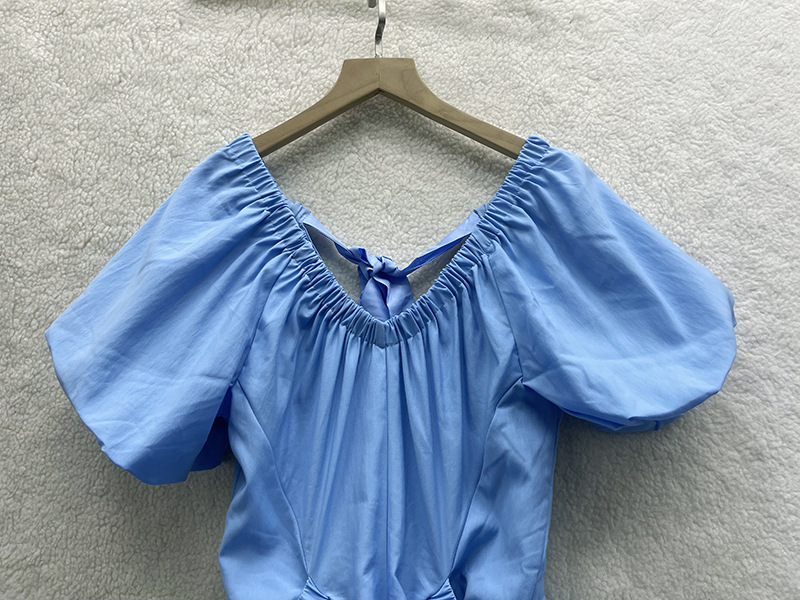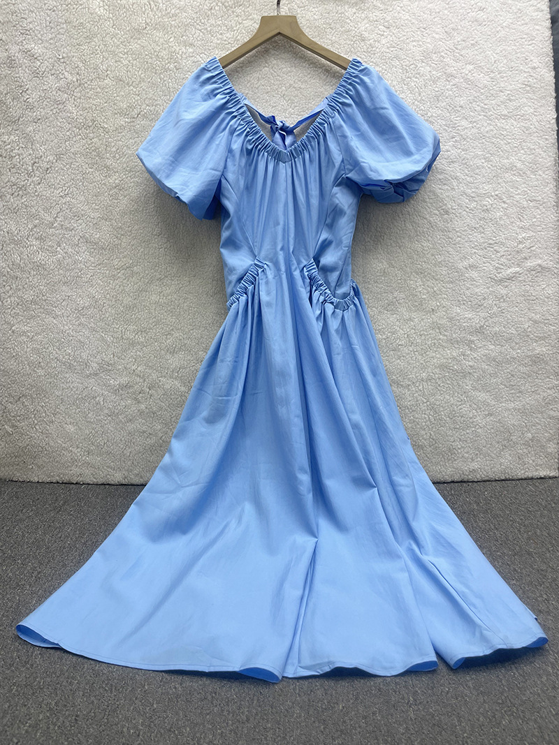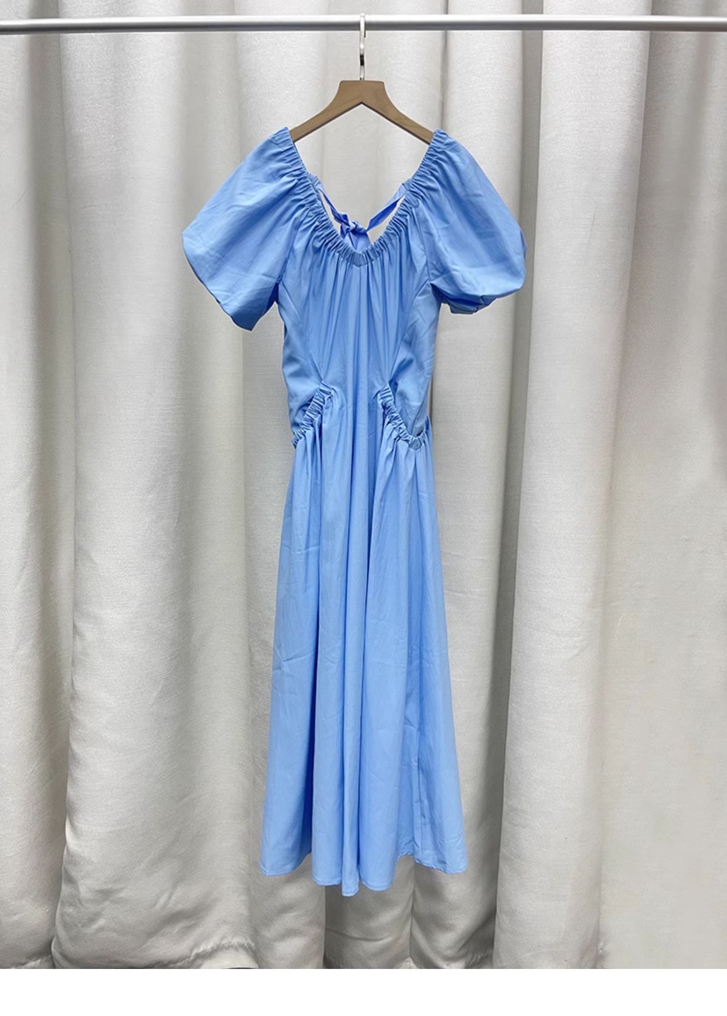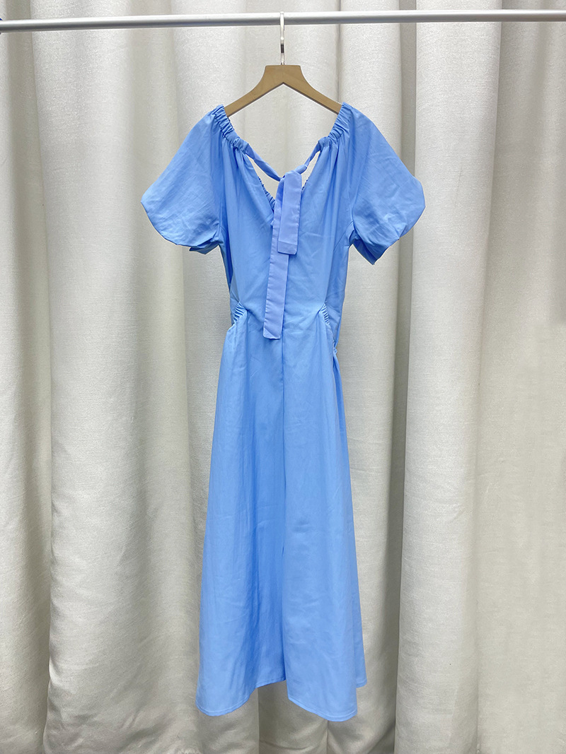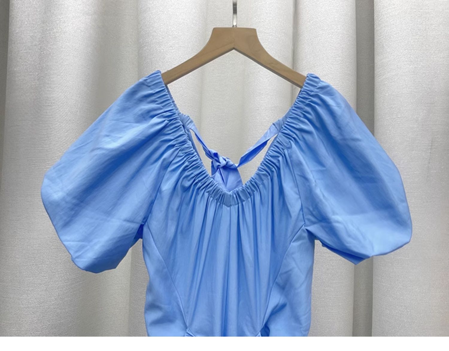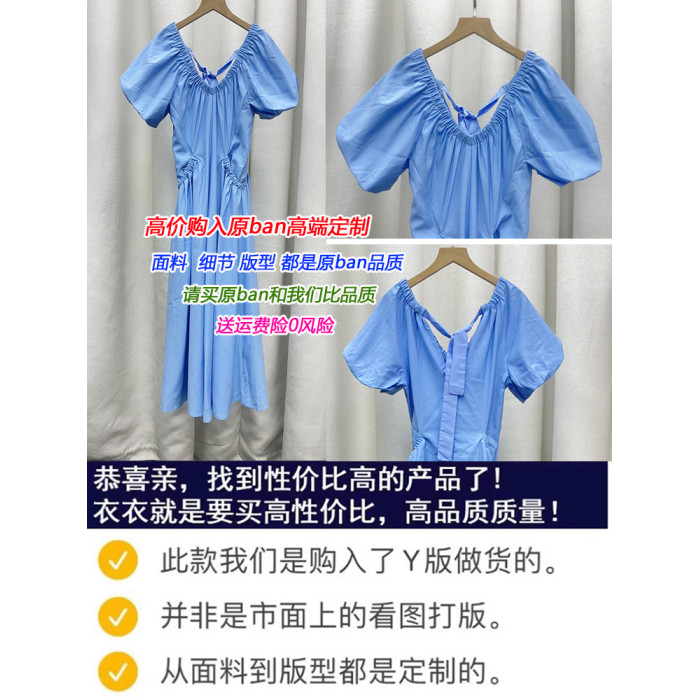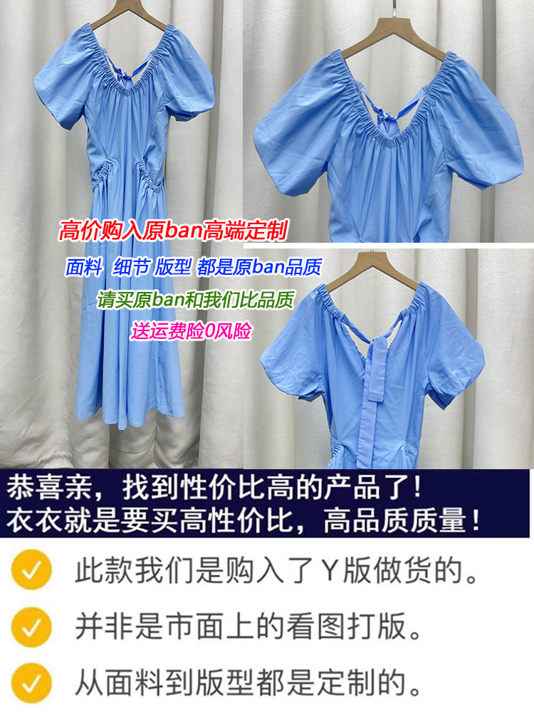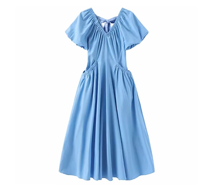 周也同款藍色短袖V領連衣裙女夏季2025新款收腰氣質度假風長裙子