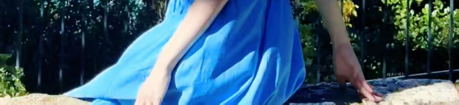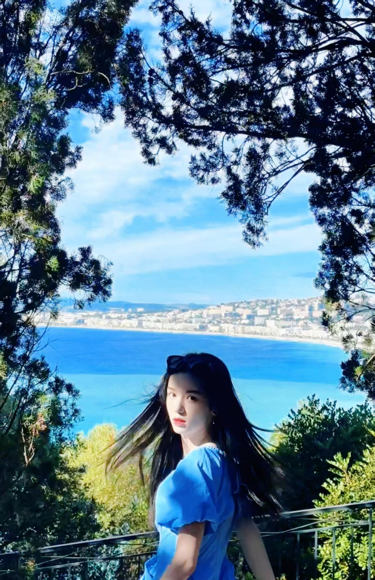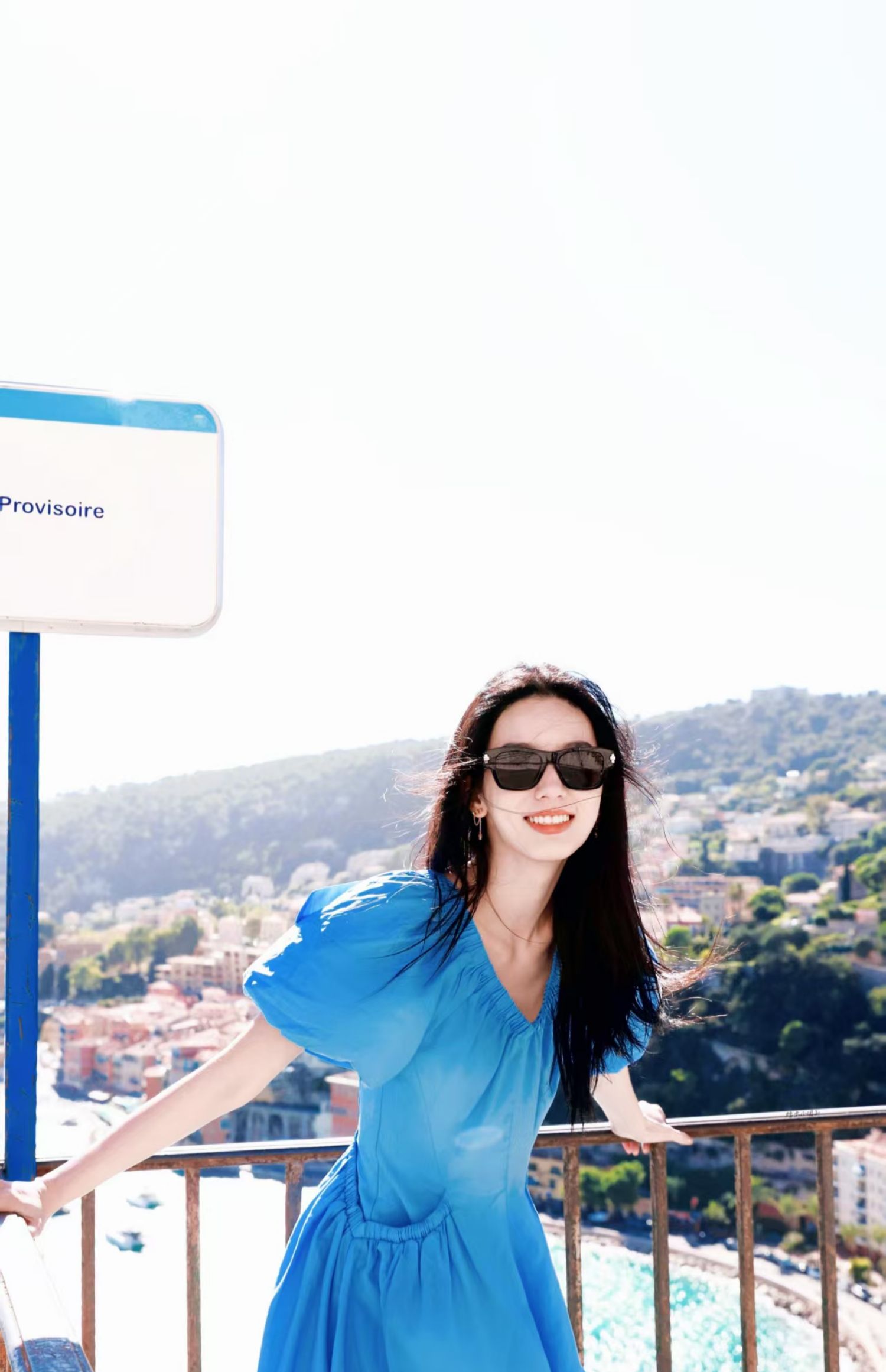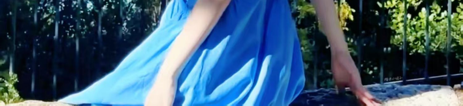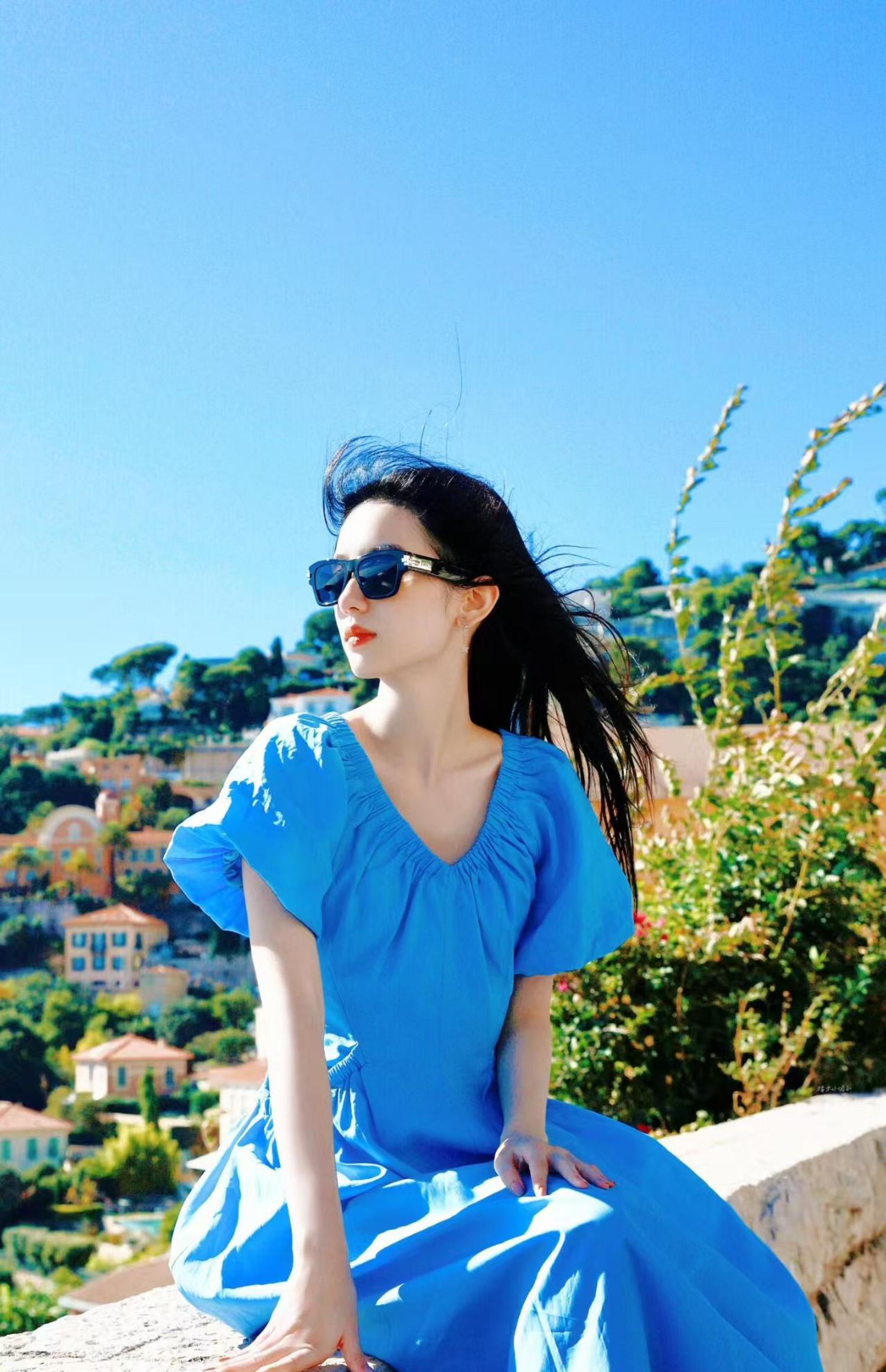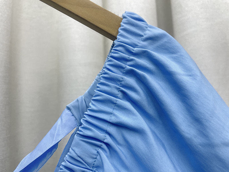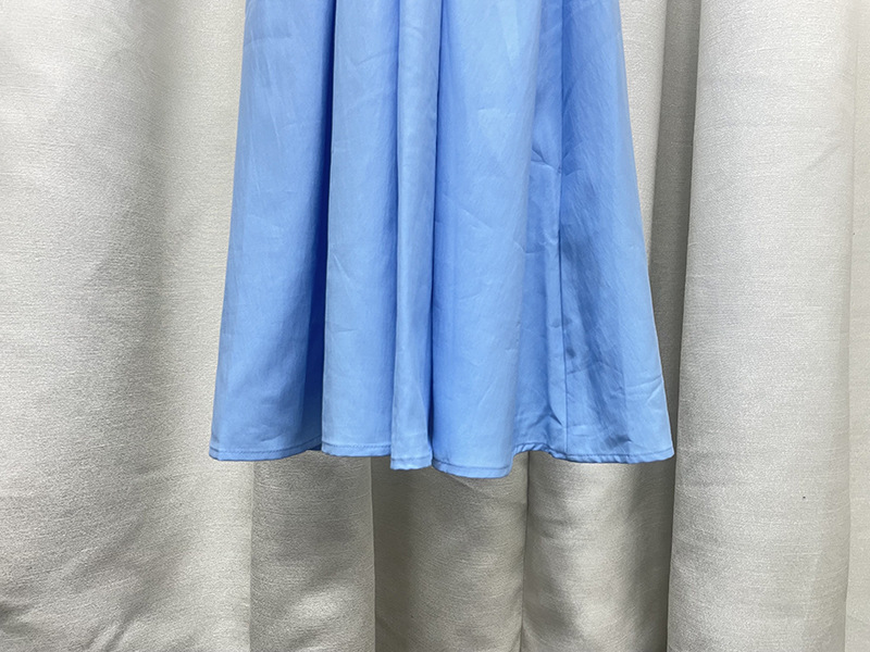 周也同款藍色短袖V領連衣裙女夏季2025新款收腰氣質度假風長裙子