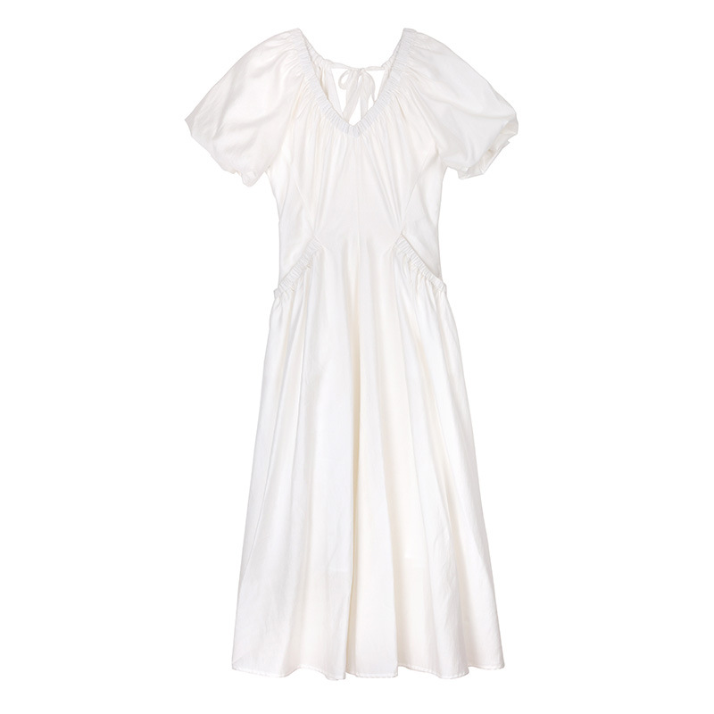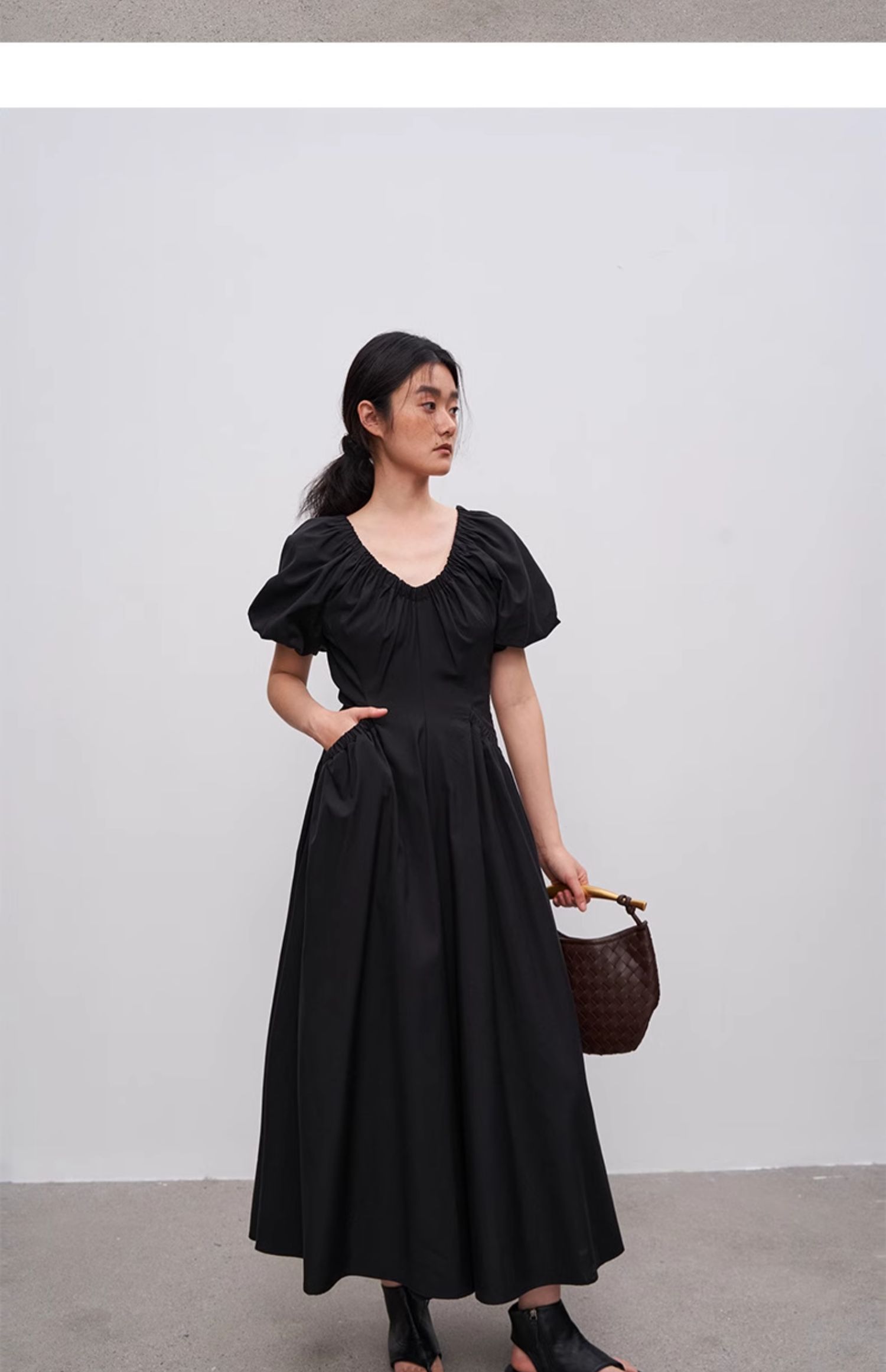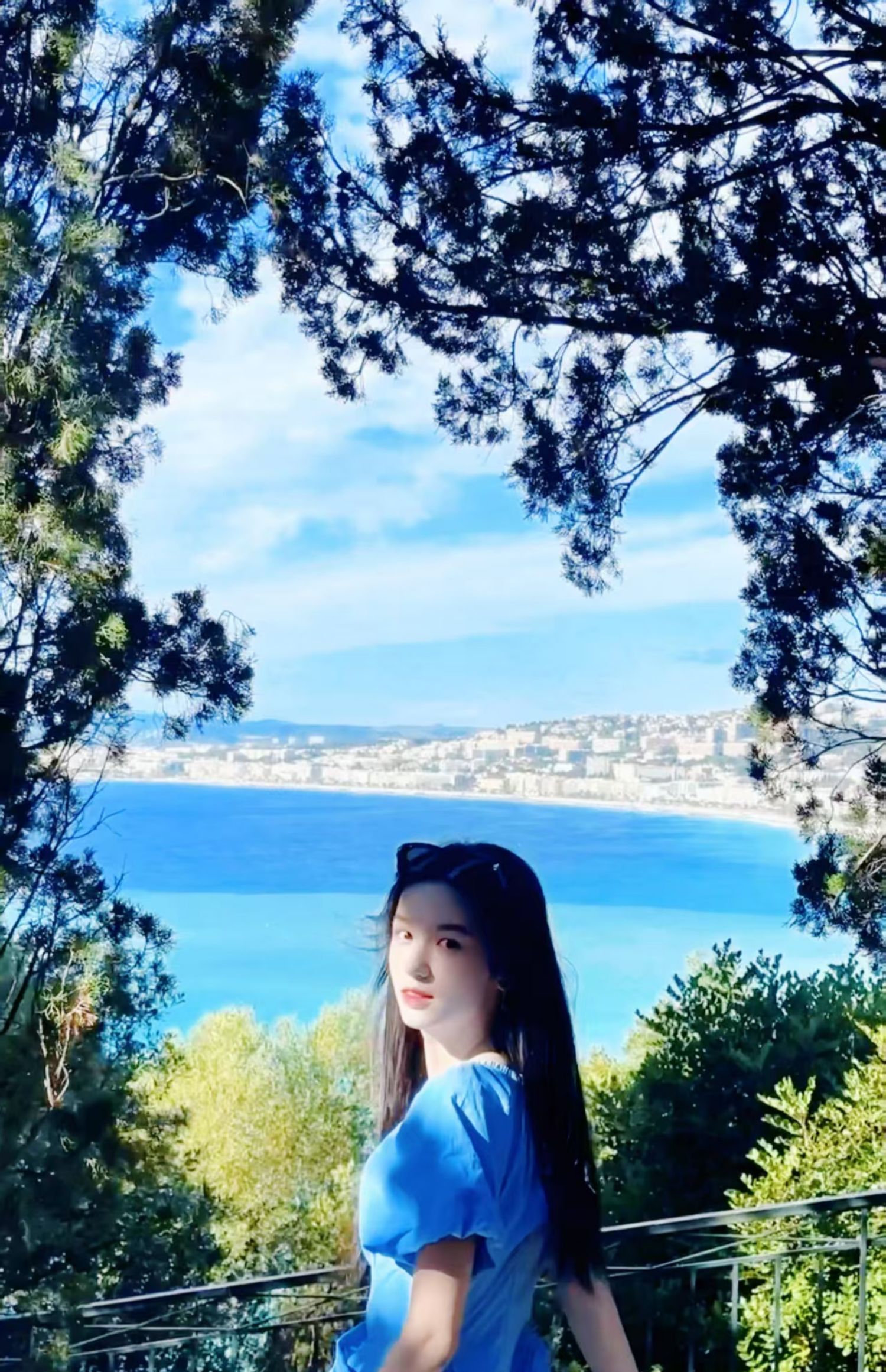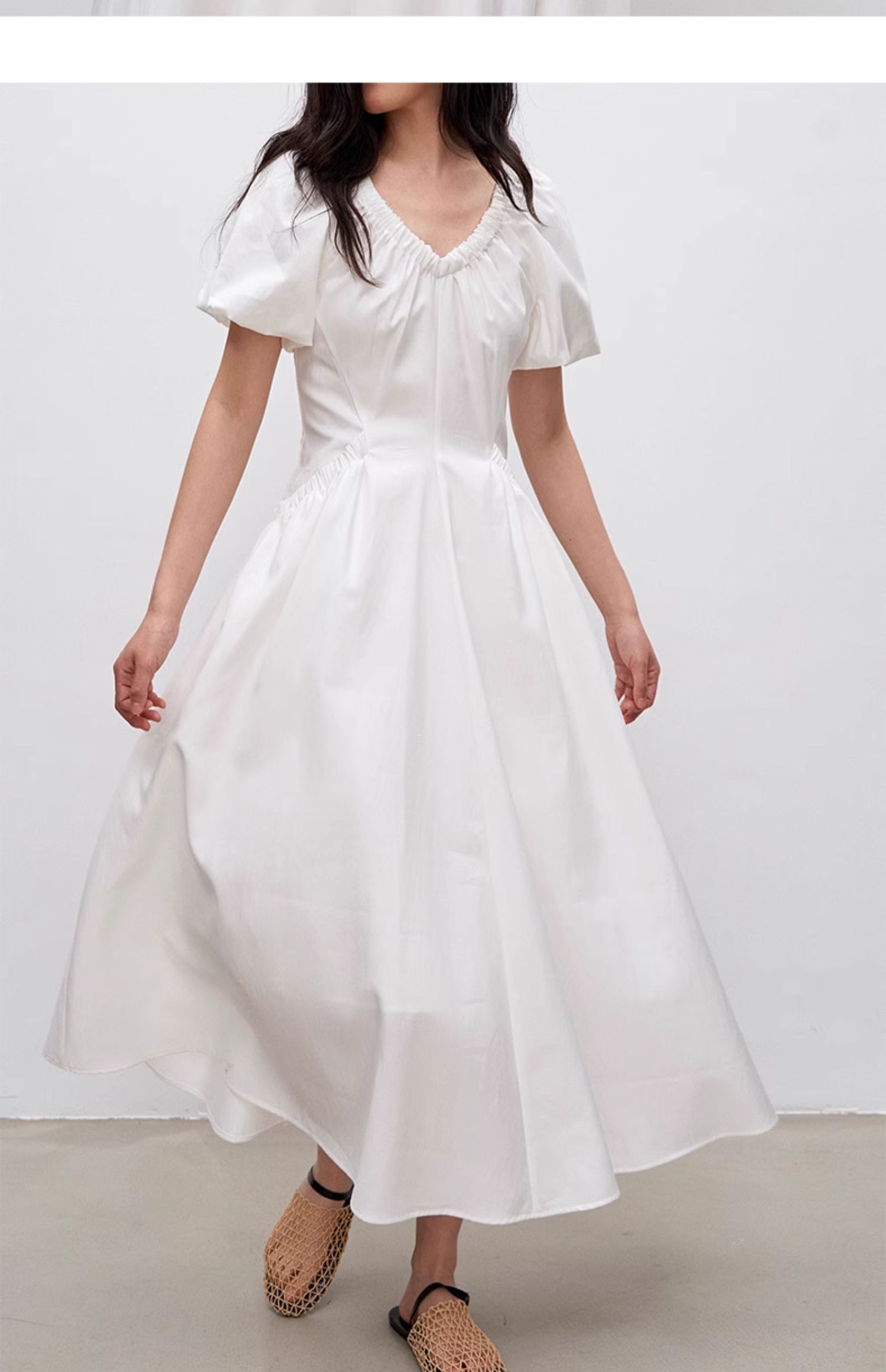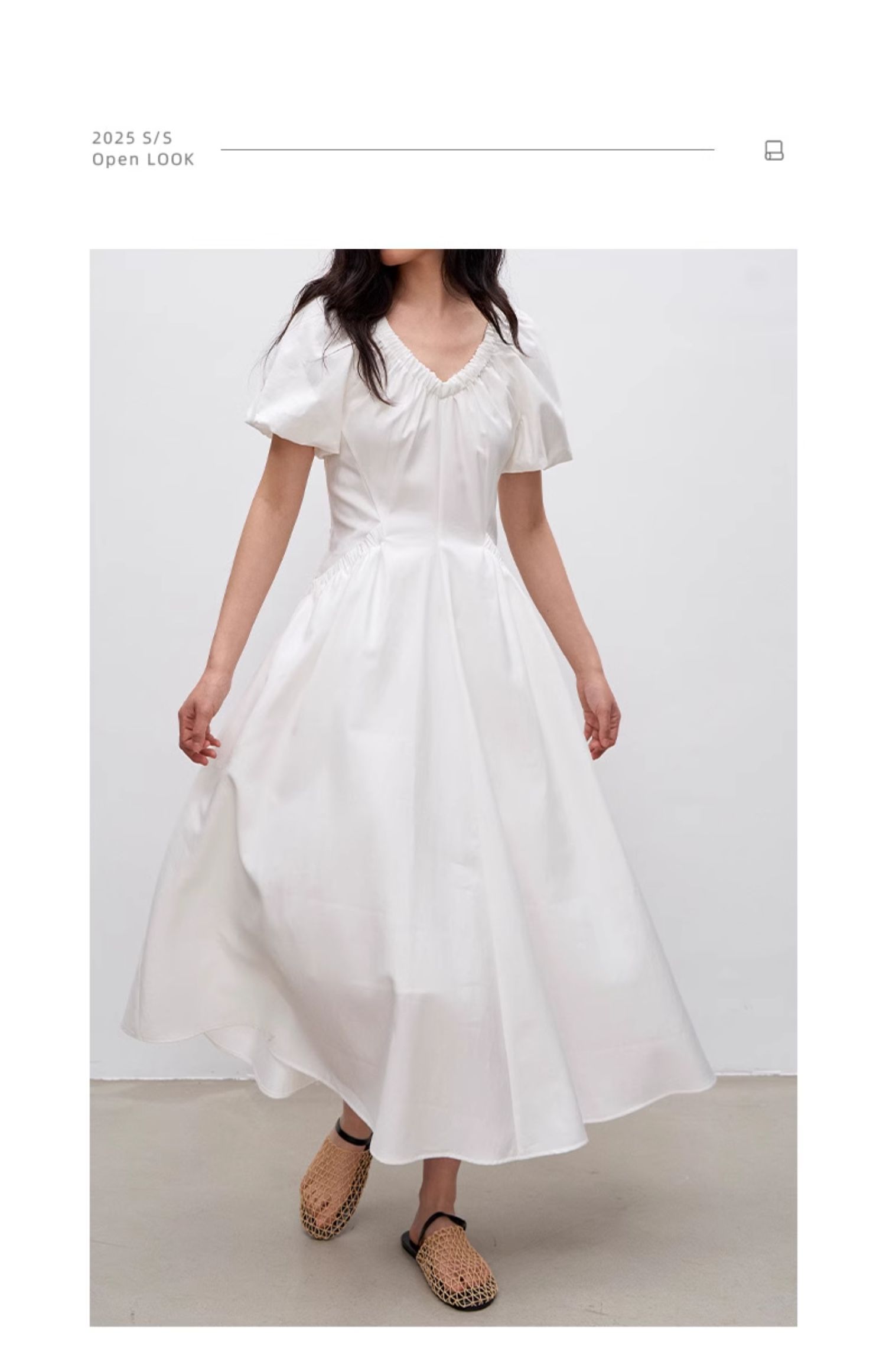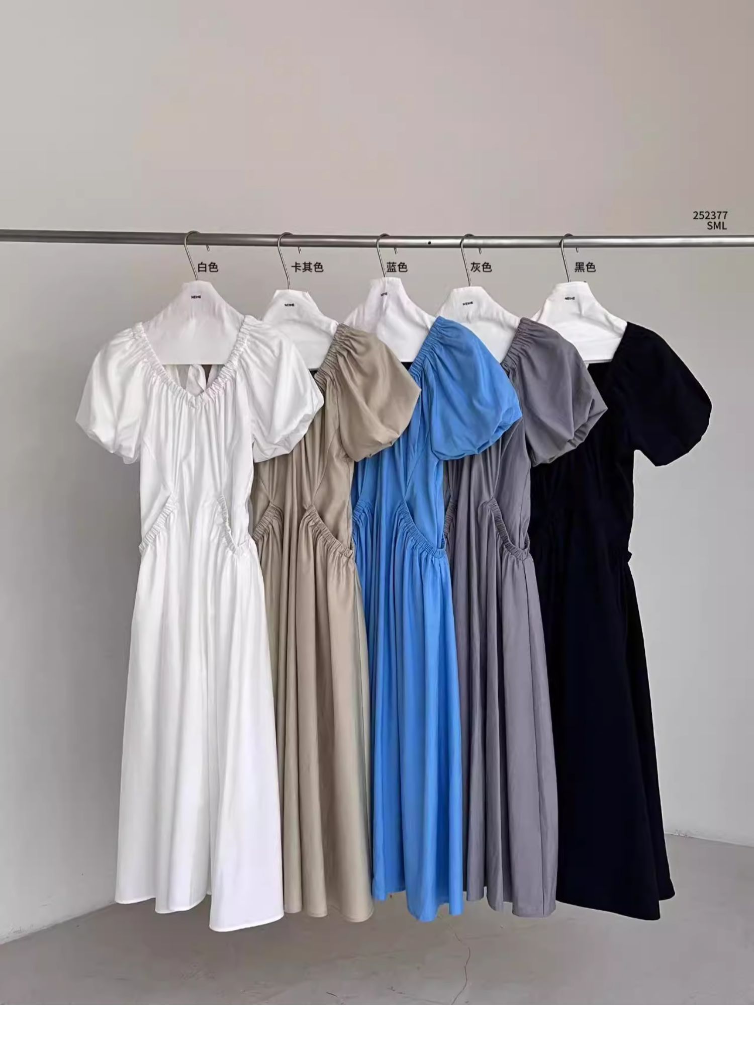 周也同款藍色短袖V領連衣裙女夏季2025新款收腰氣質度假風長裙子