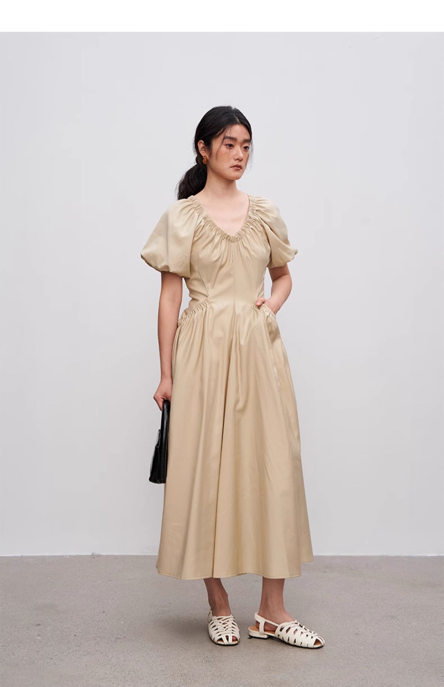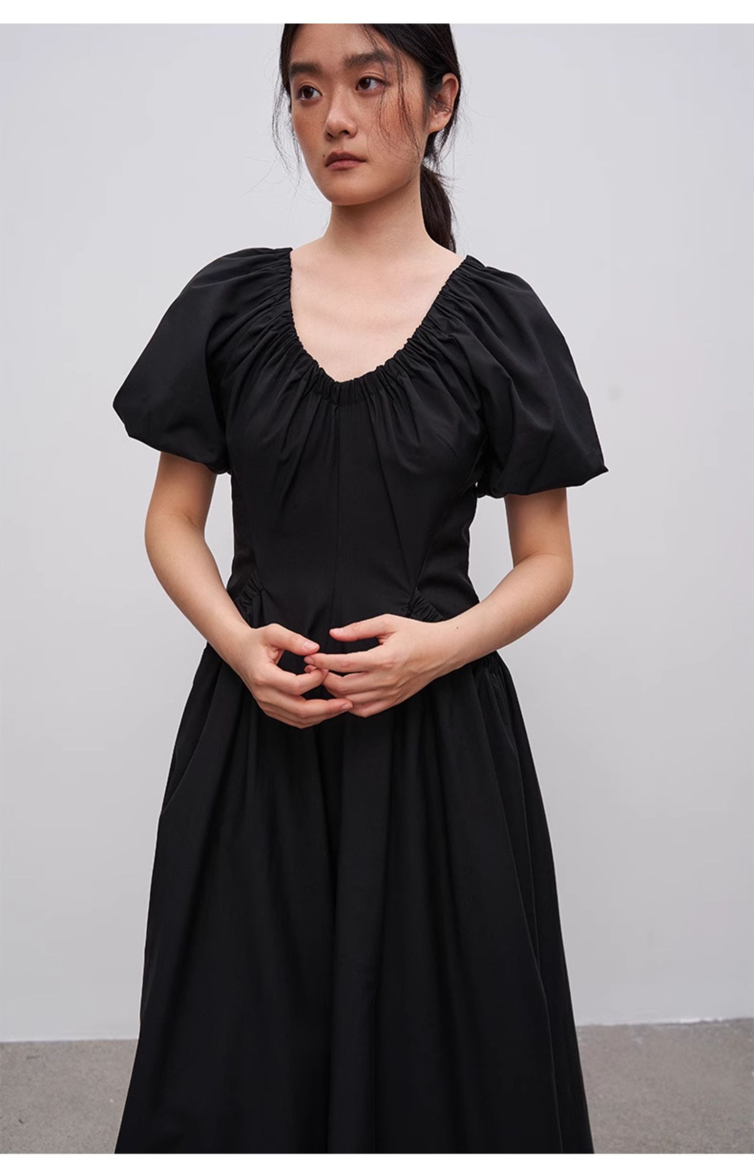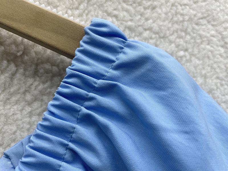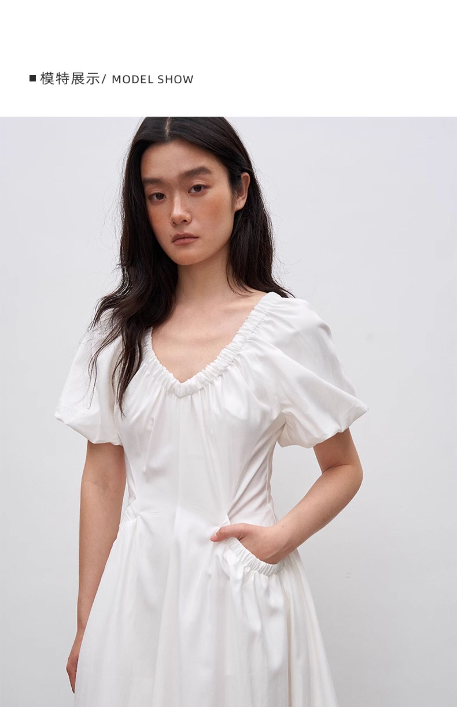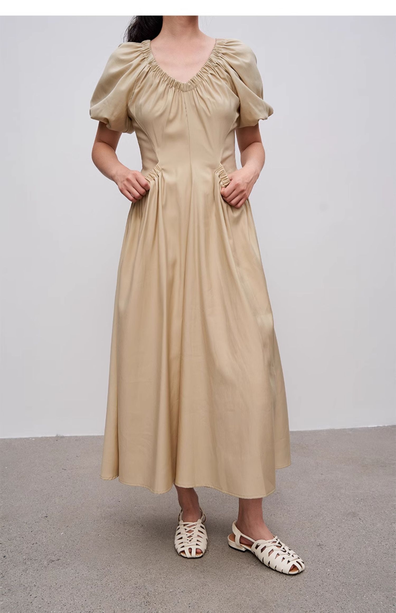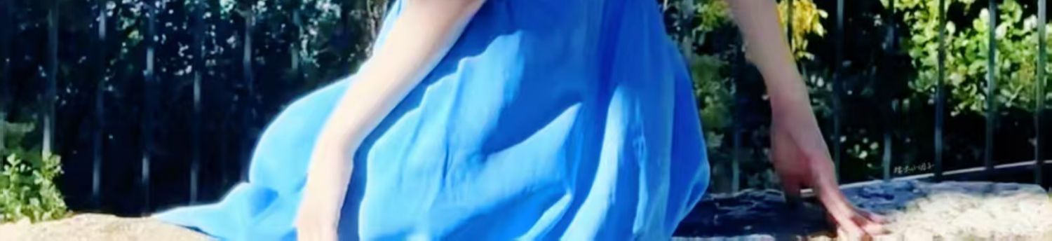 周也同款藍色短袖V領連衣裙女夏季2025新款收腰氣質度假風長裙子