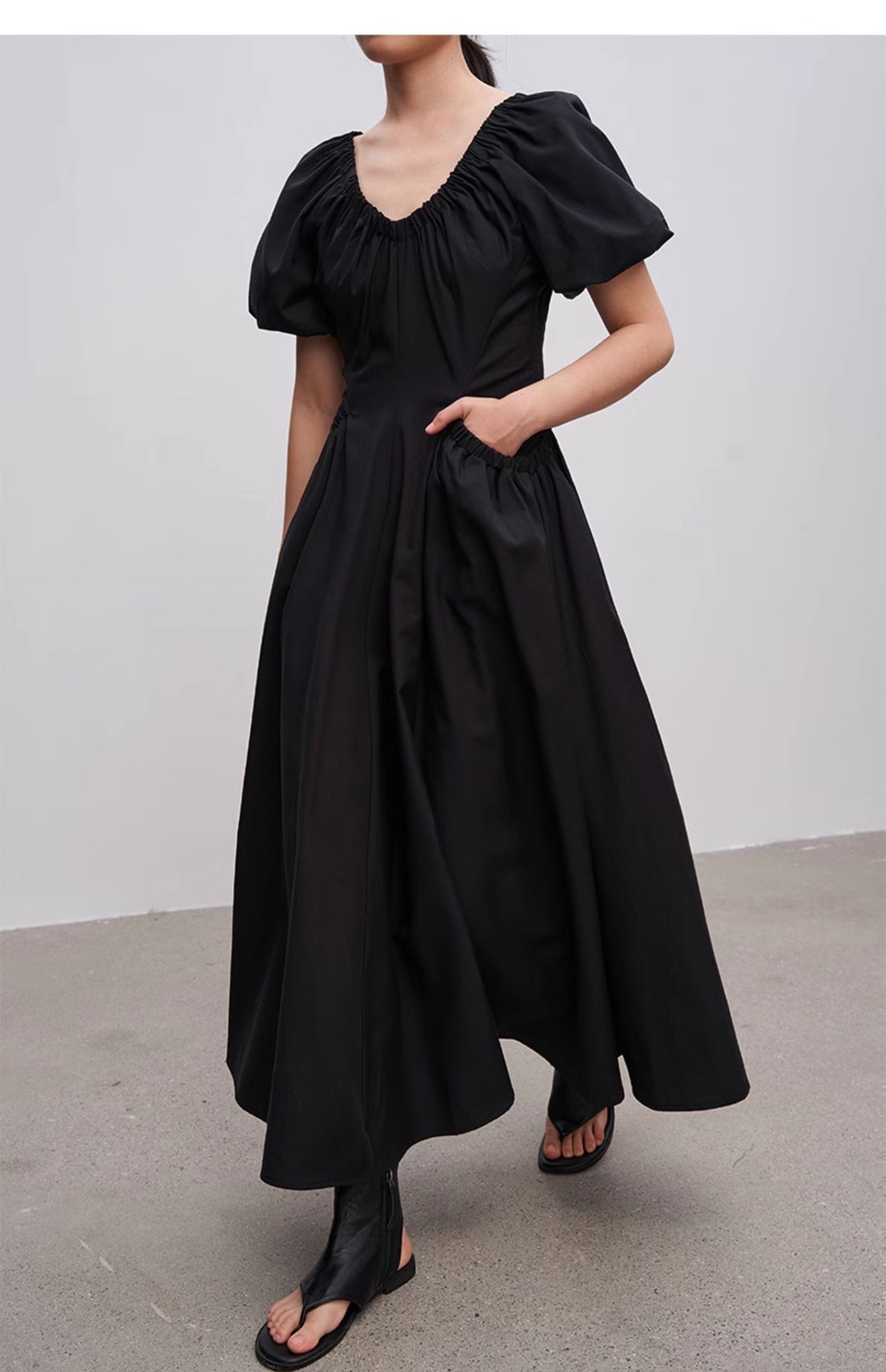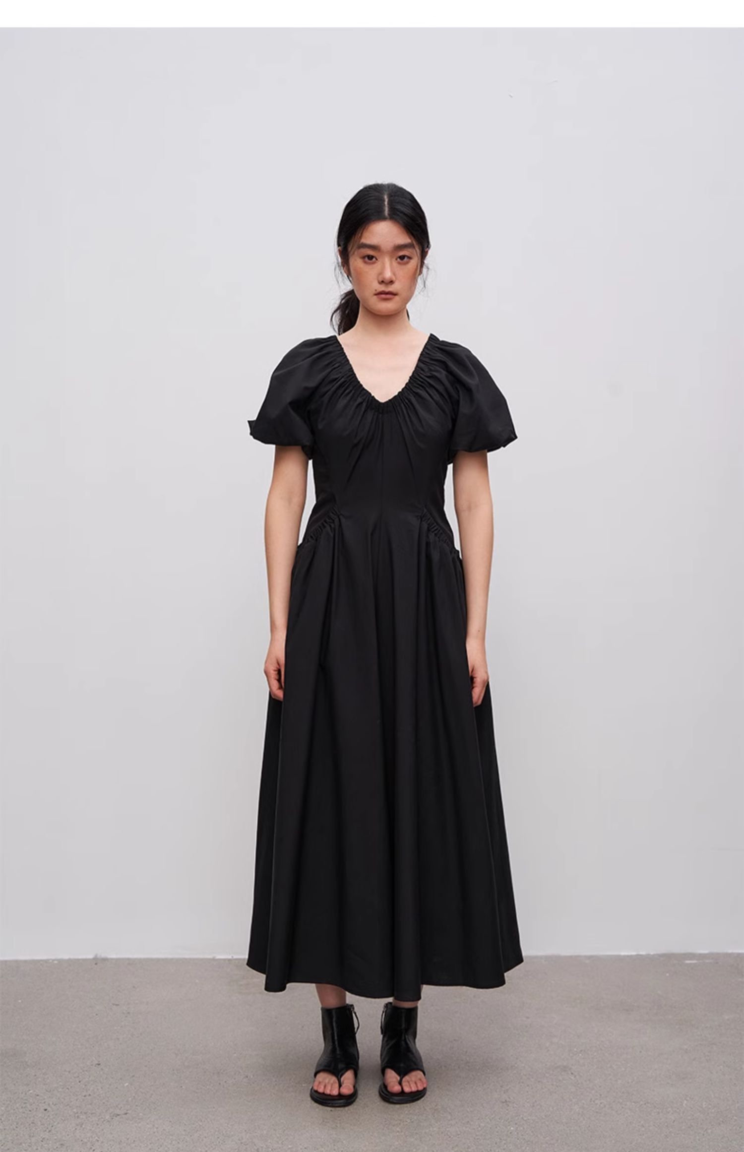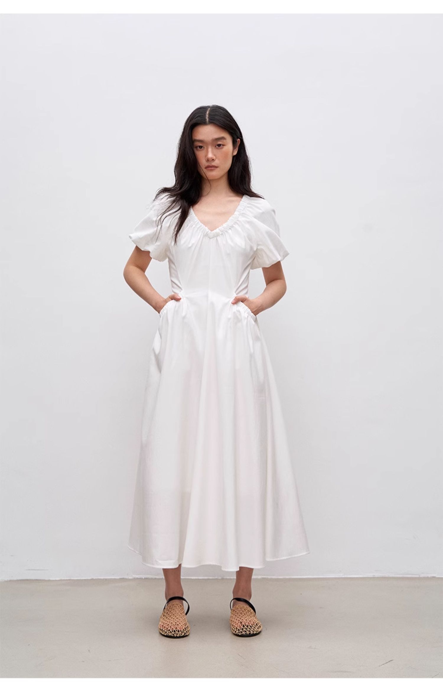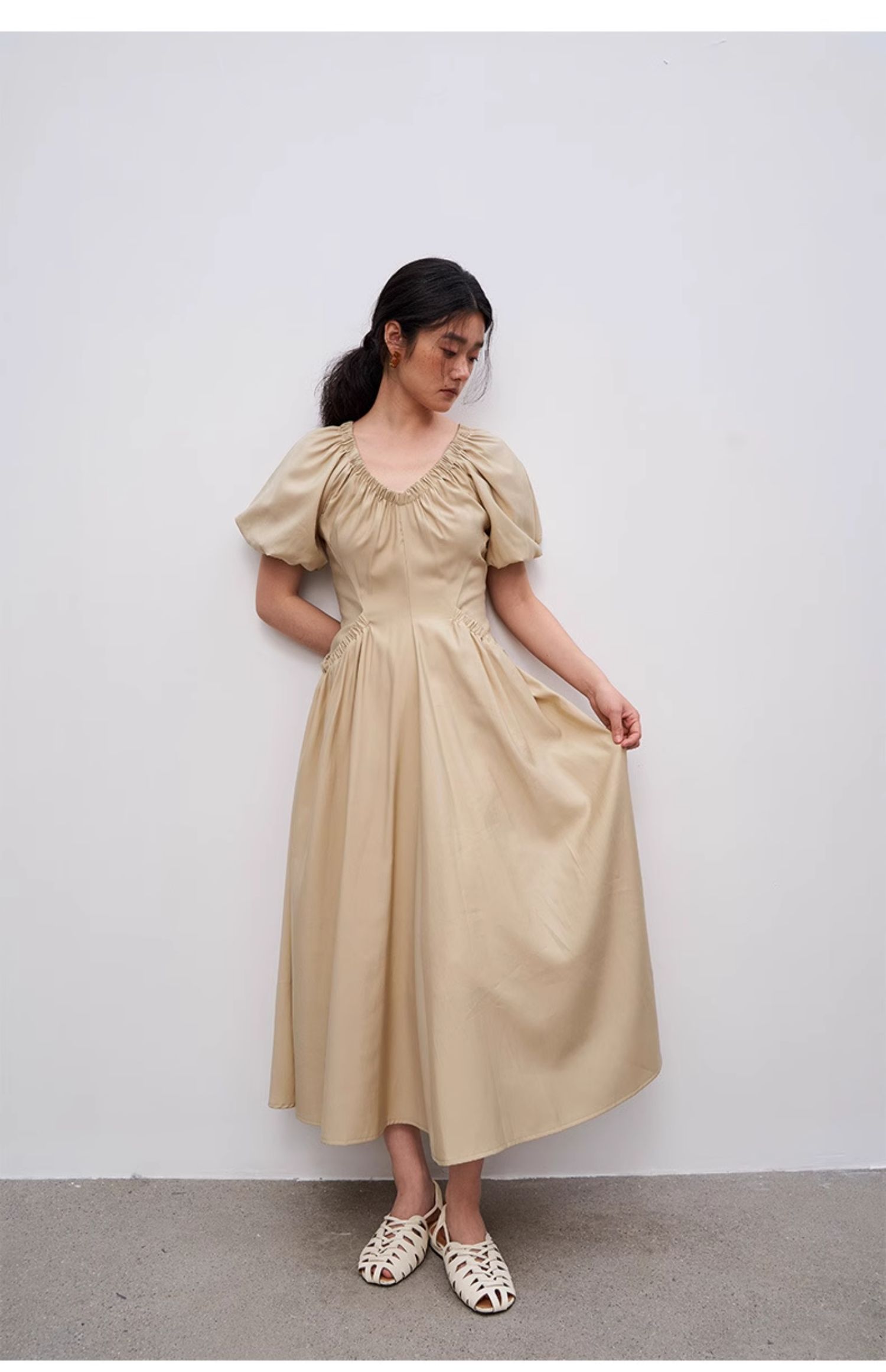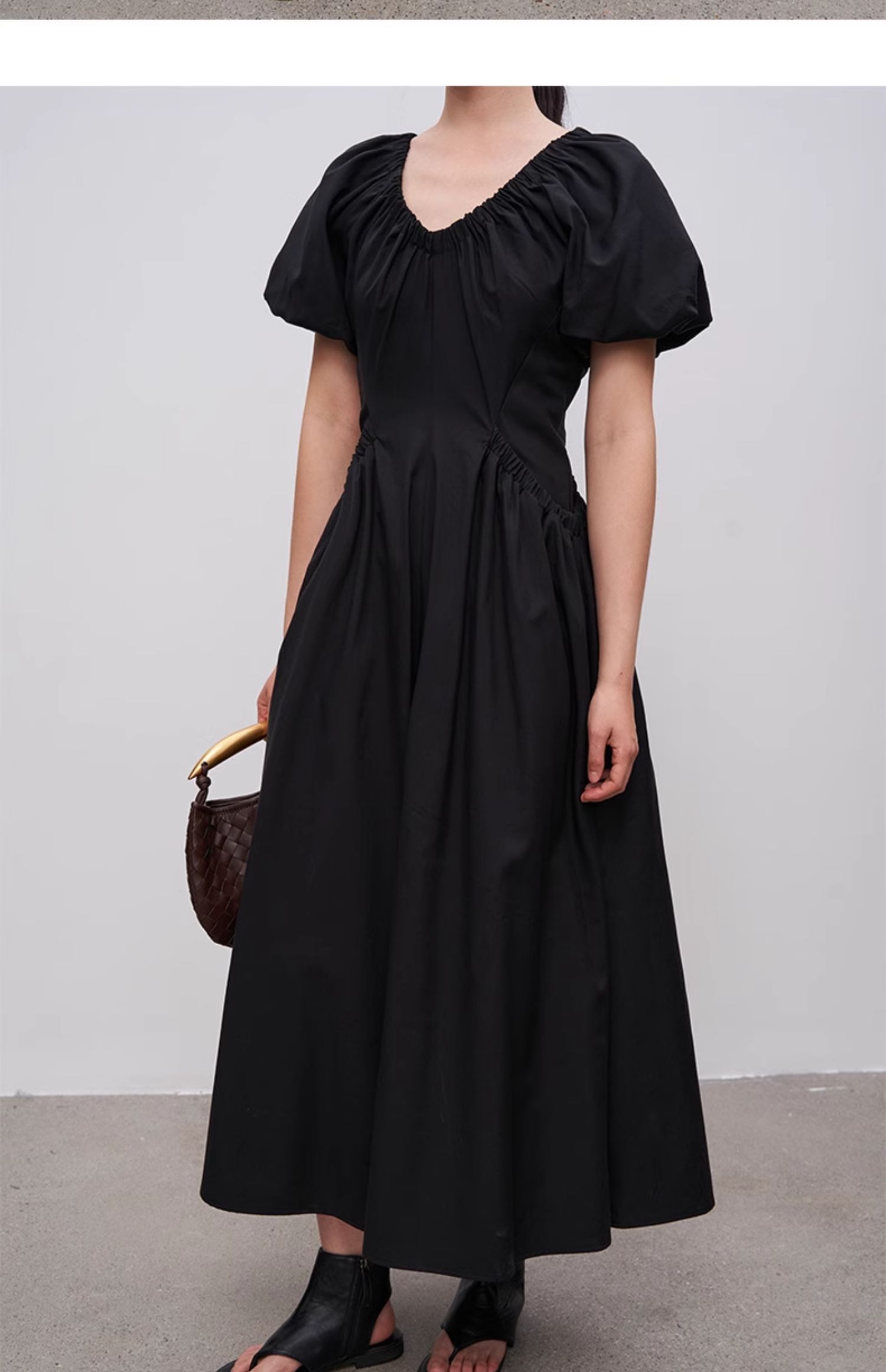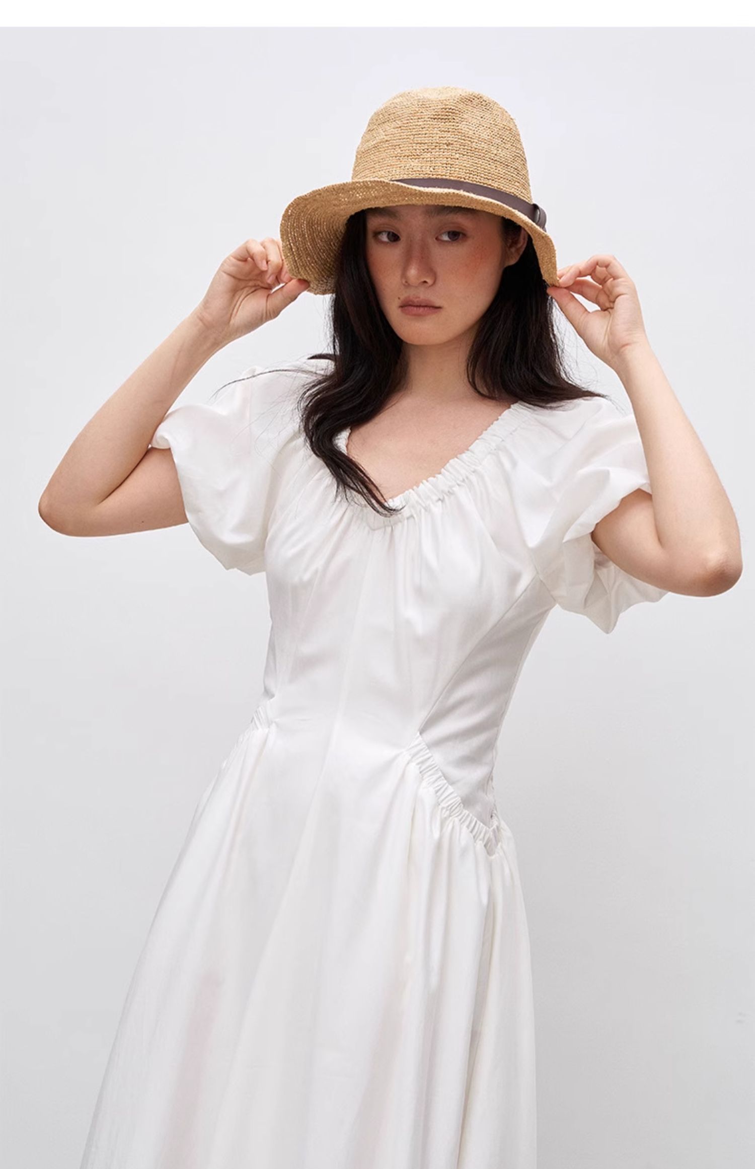 周也同款藍色短袖V領連衣裙女夏季2025新款收腰氣質度假風長裙子