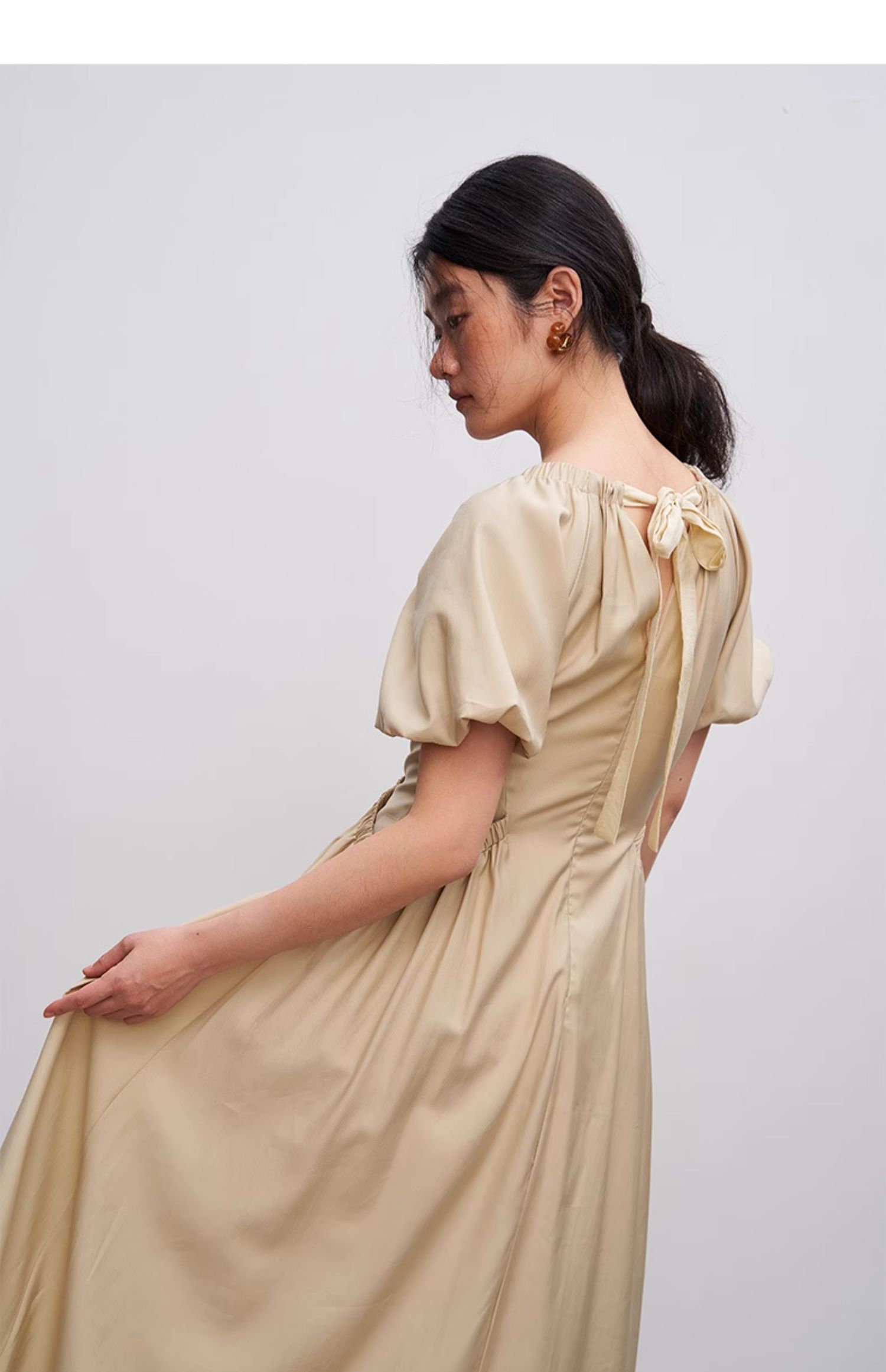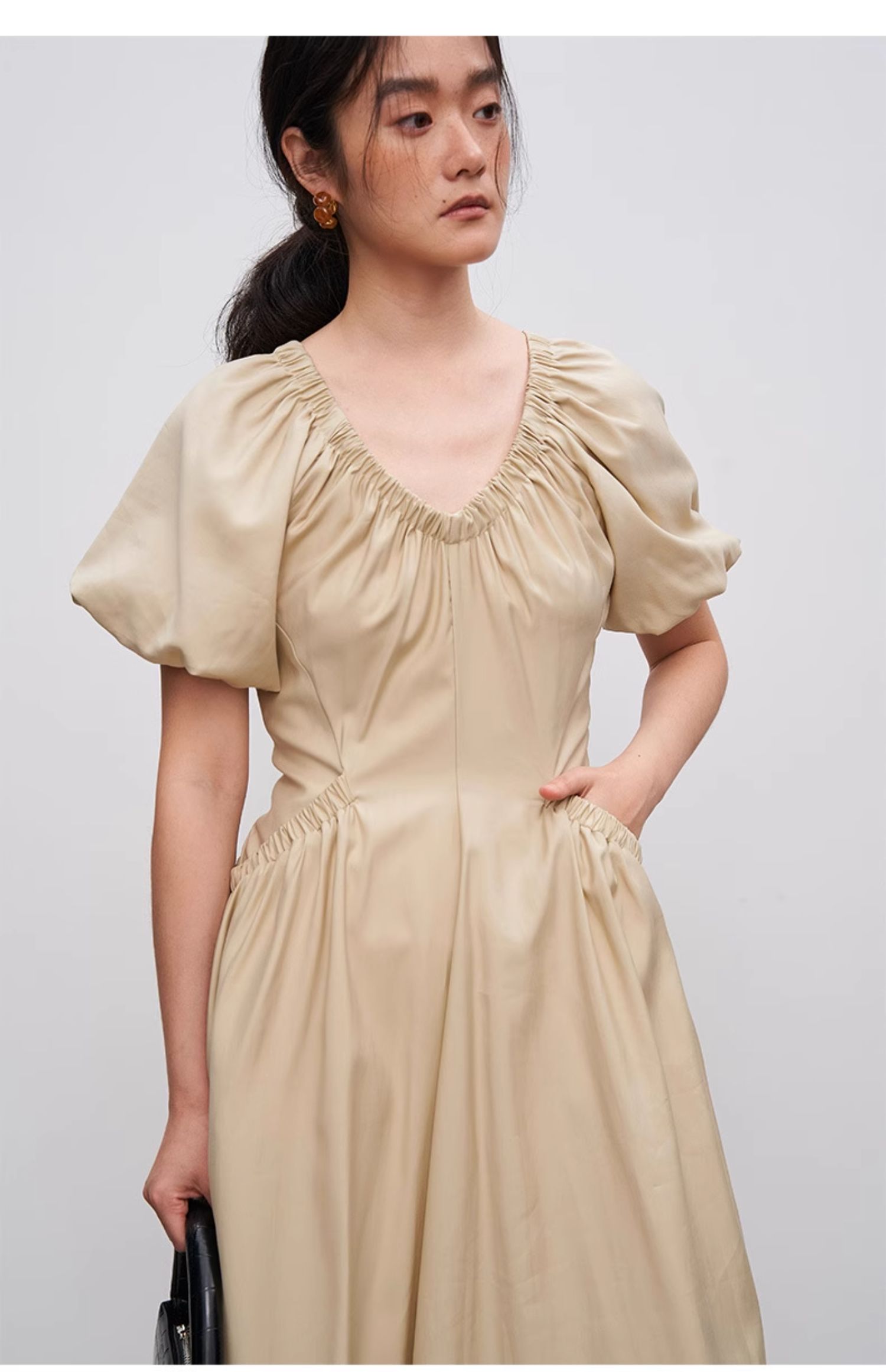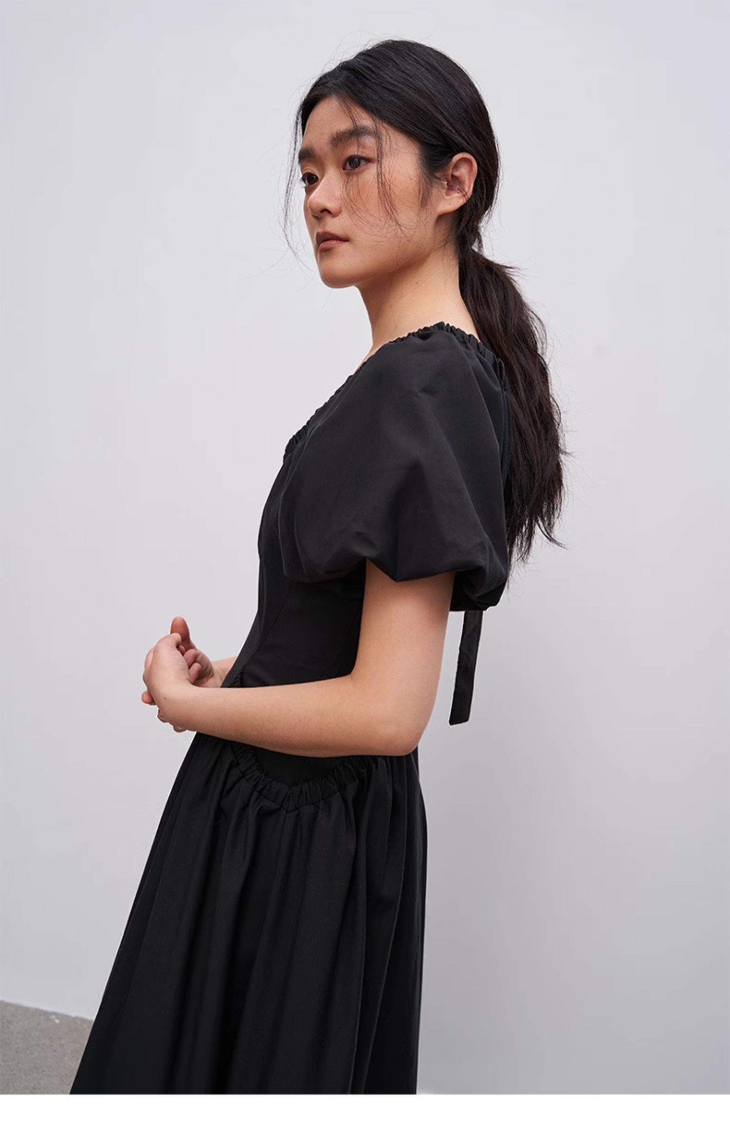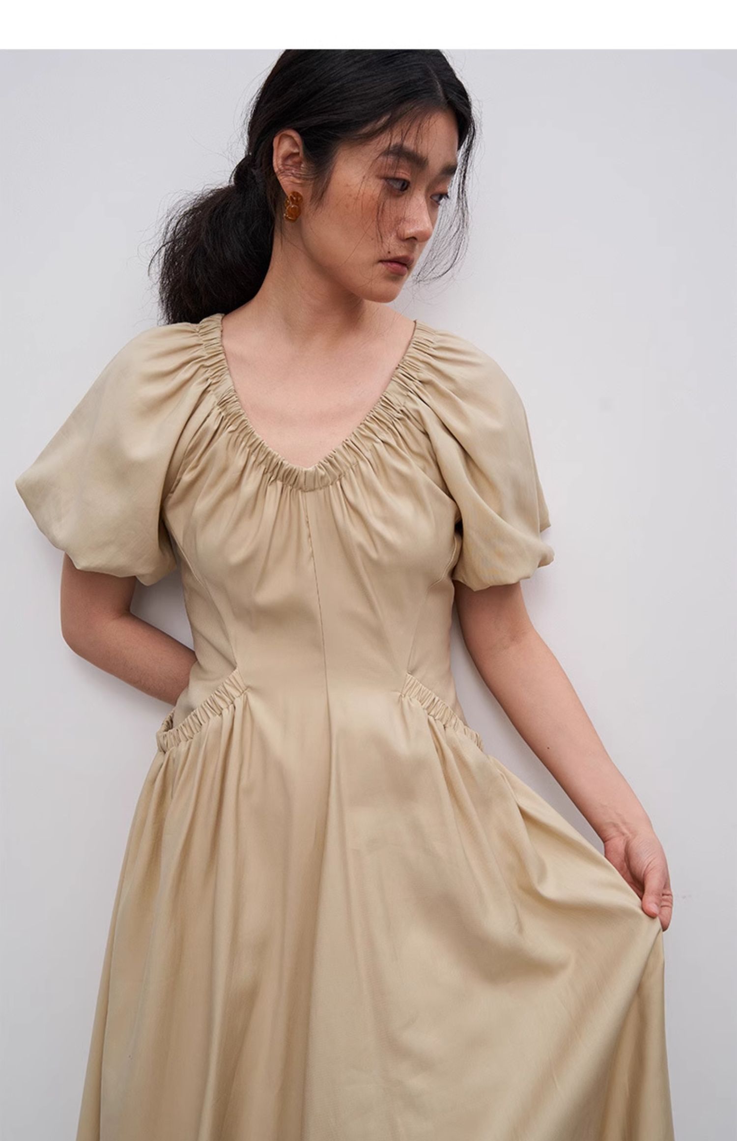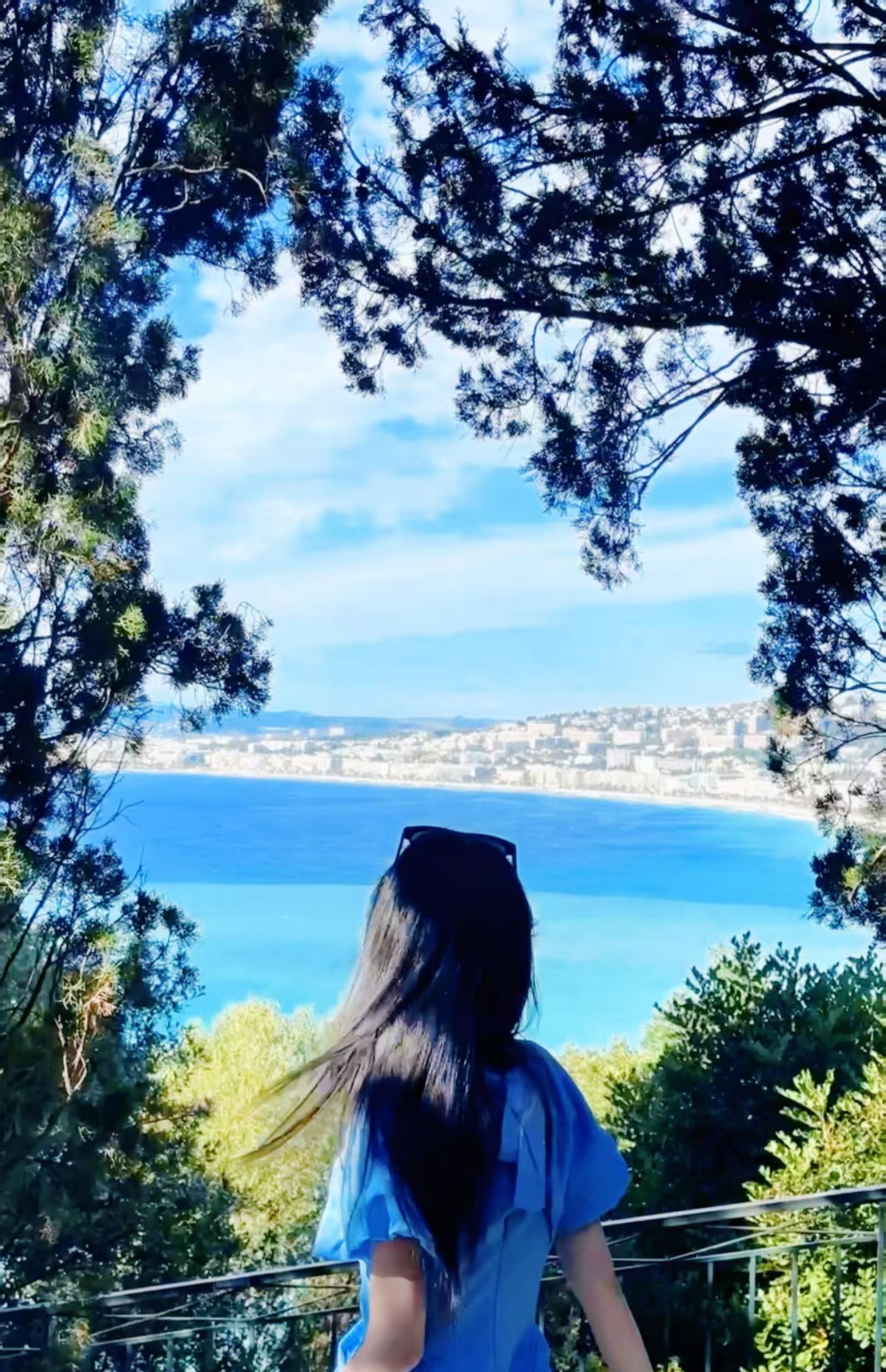 周也同款藍色短袖V領連衣裙女夏季2025新款收腰氣質度假風長裙子