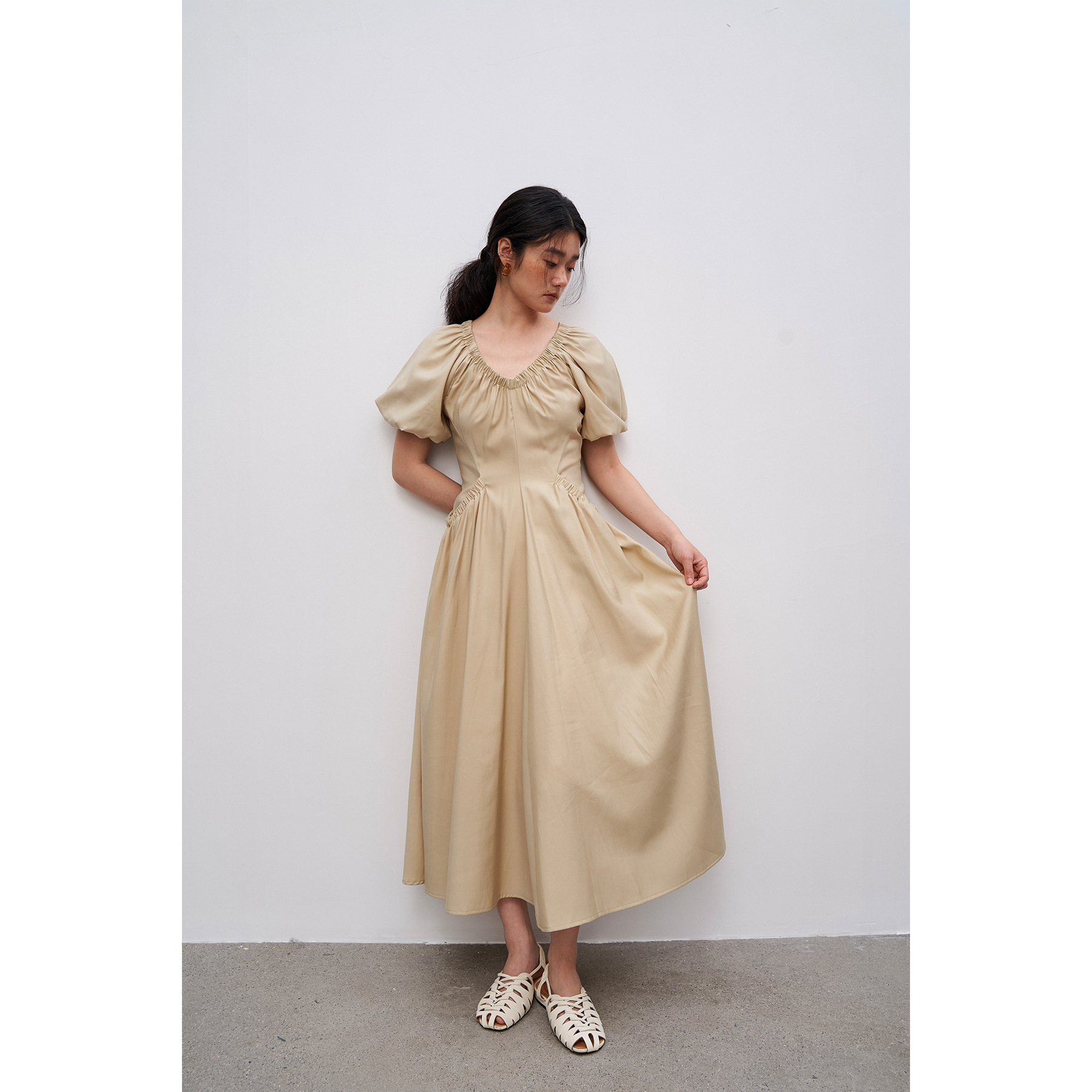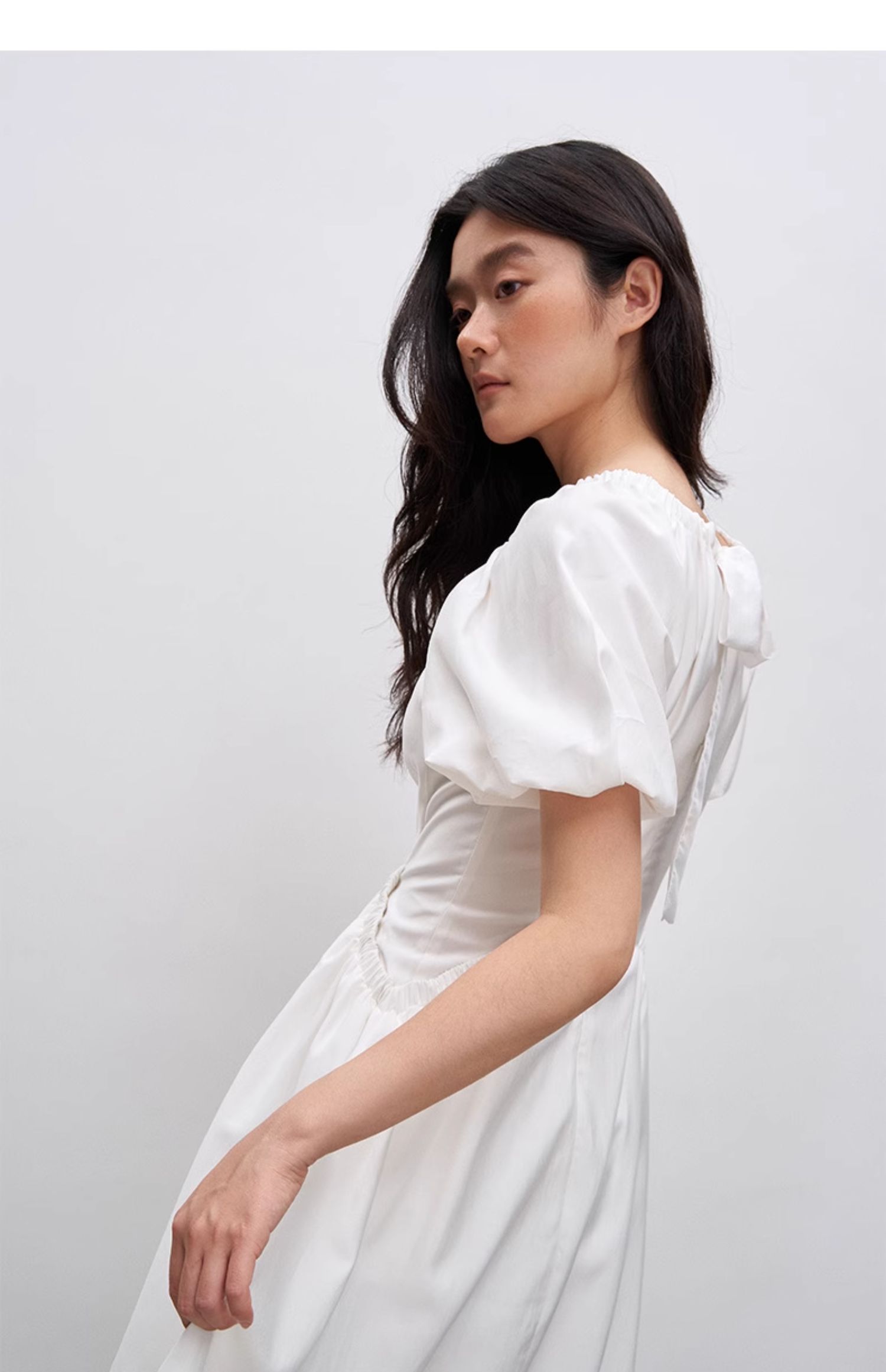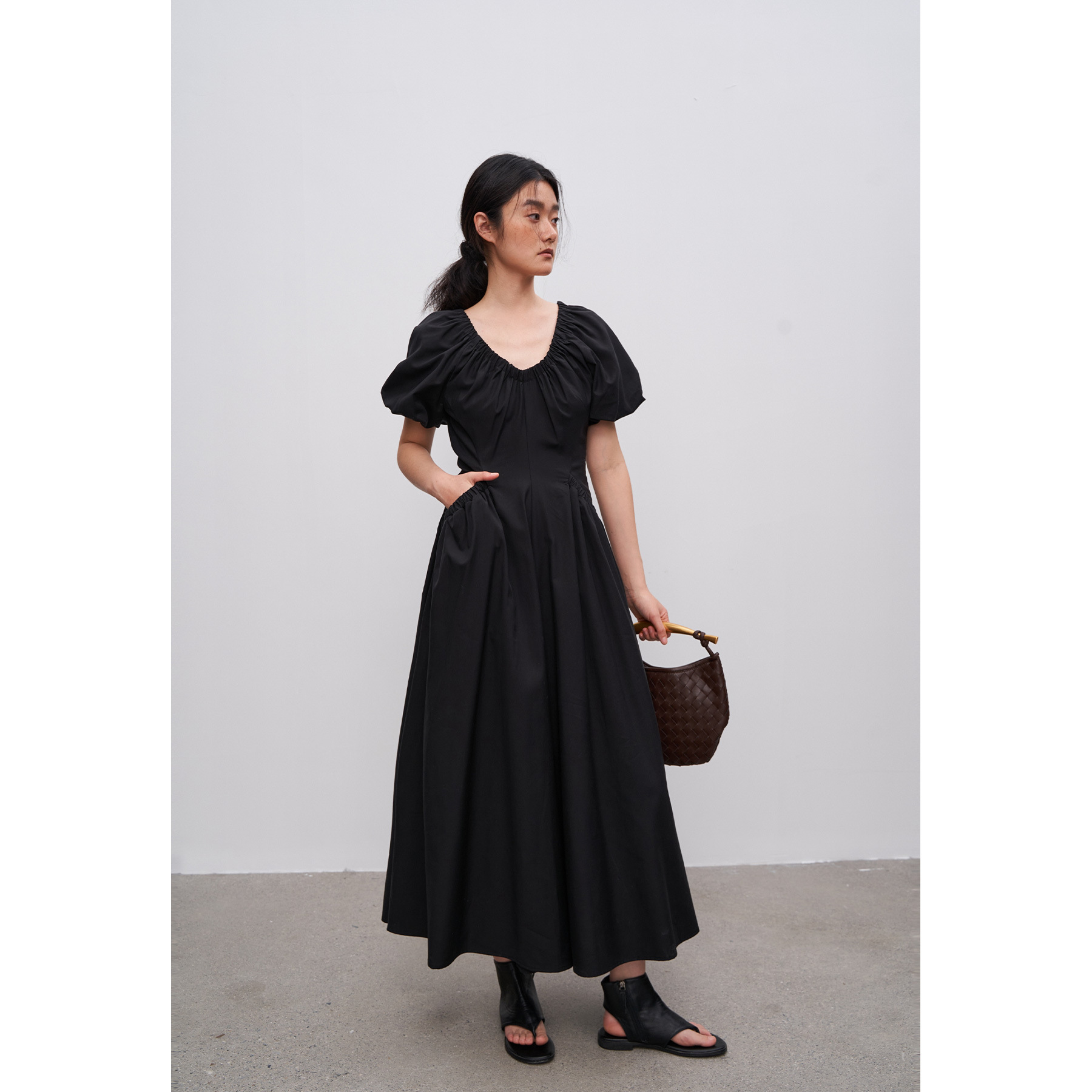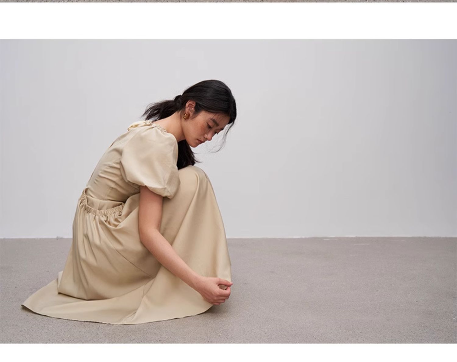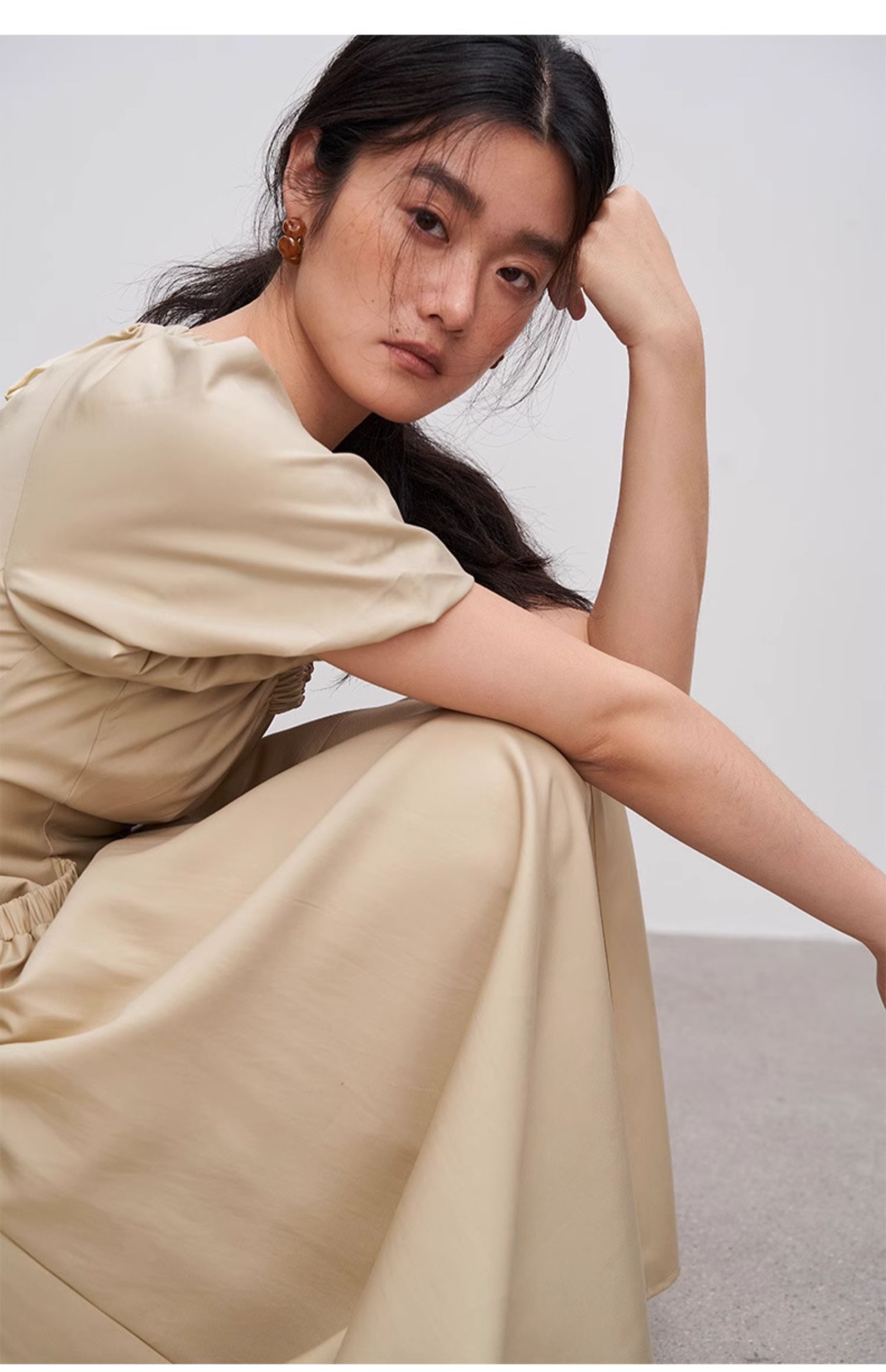 周也同款藍色短袖V領連衣裙女夏季2025新款收腰氣質度假風長裙子