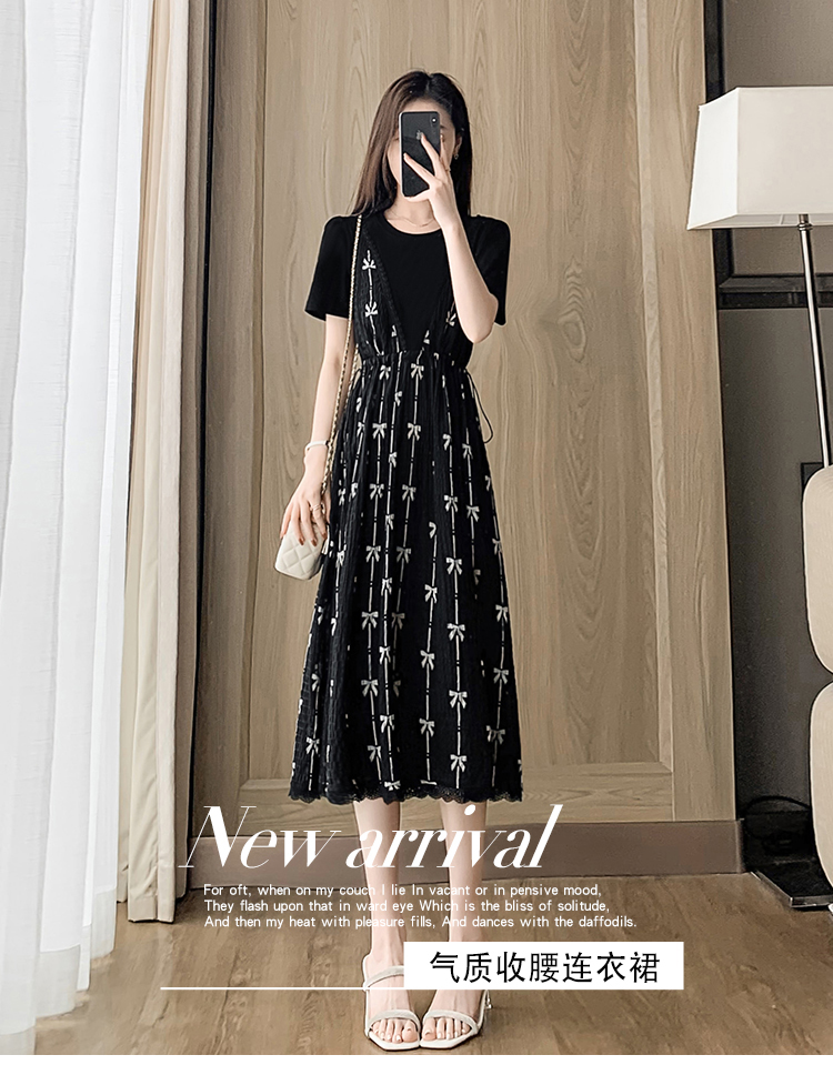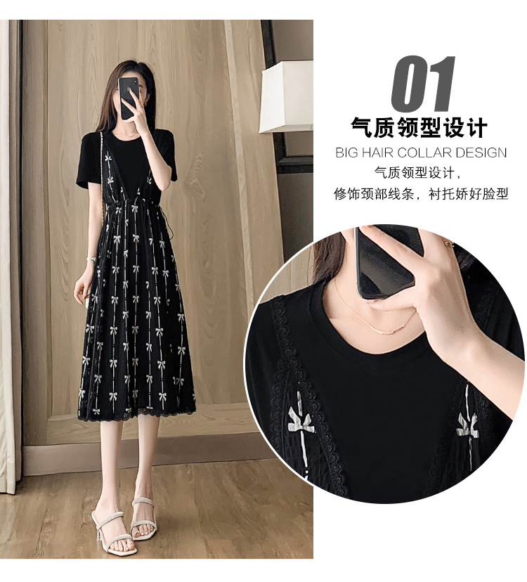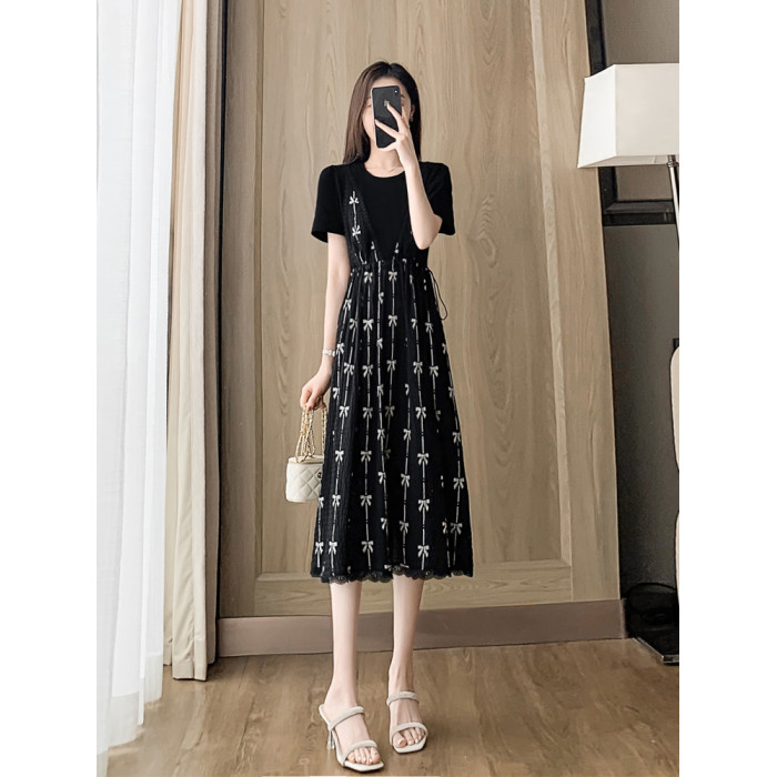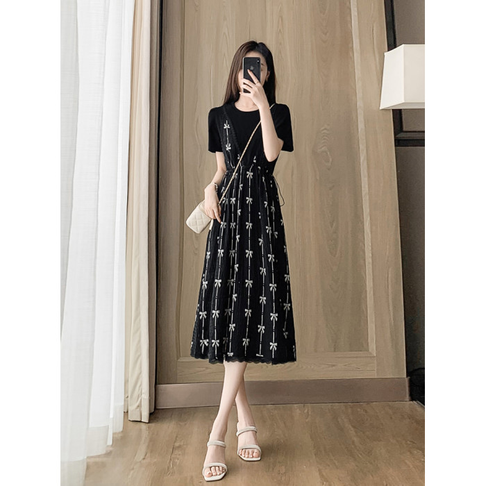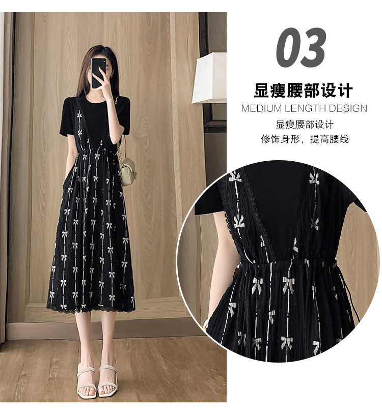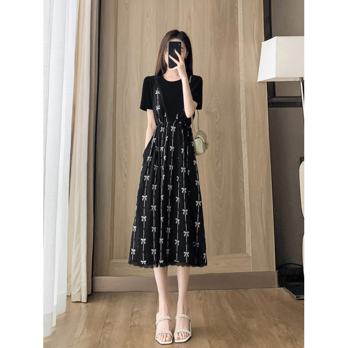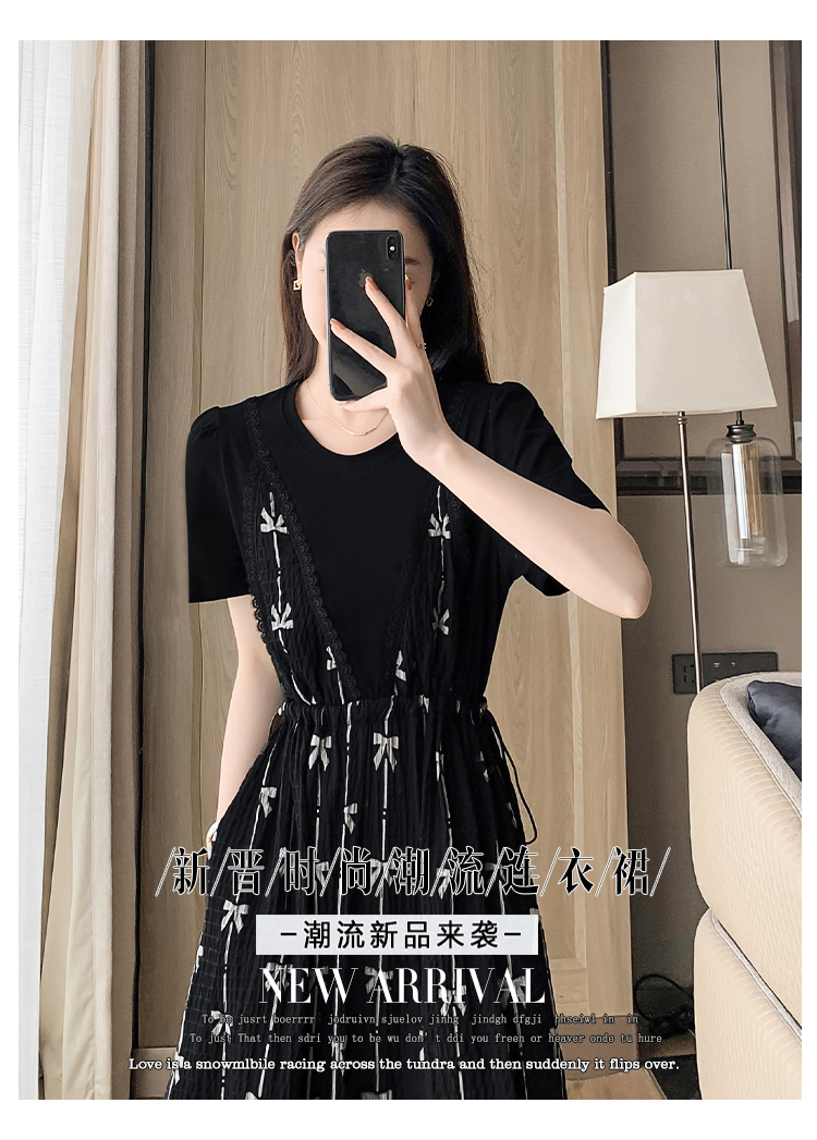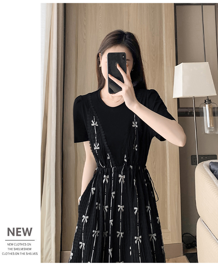 小個子黑色連衣裙女夏季2025新款假兩件套收腰顯瘦氣質a字裙子女