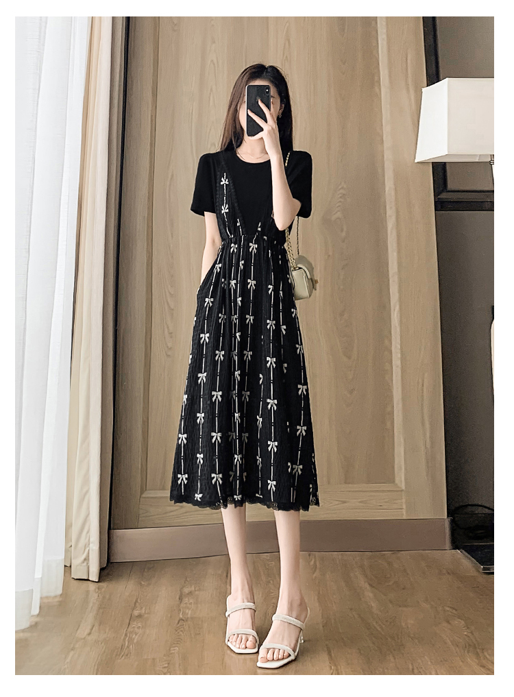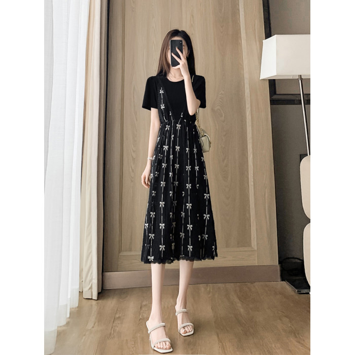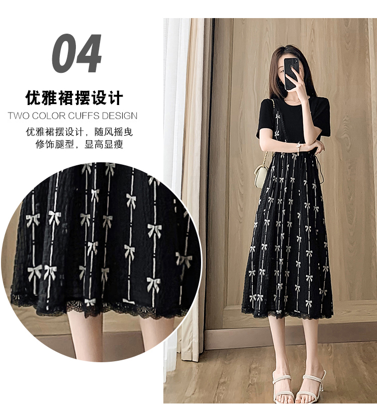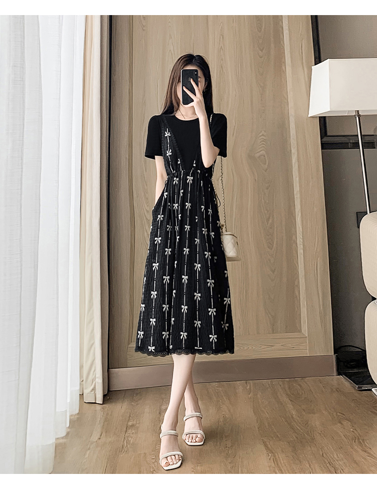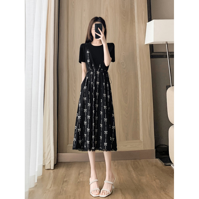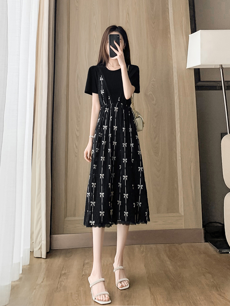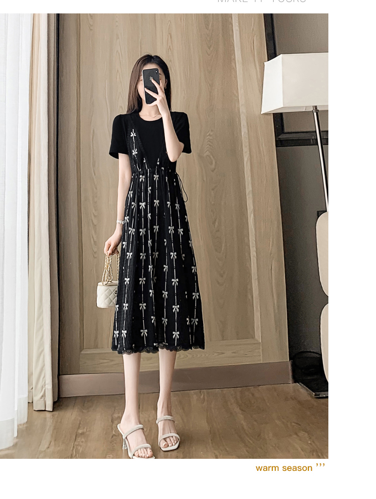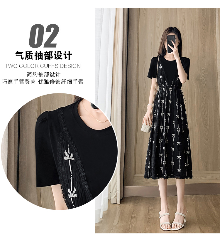 小個子黑色連衣裙女夏季2025新款假兩件套收腰顯瘦氣質a字裙子女