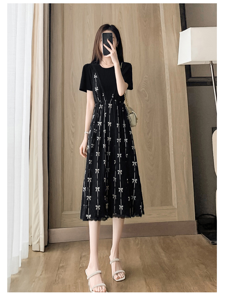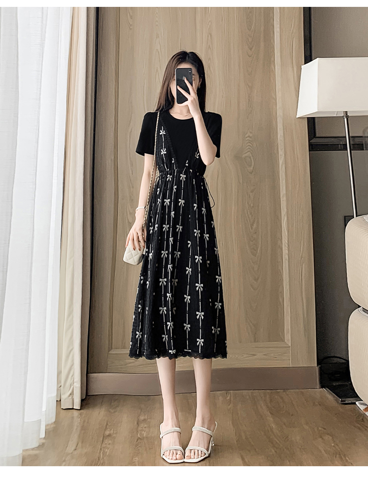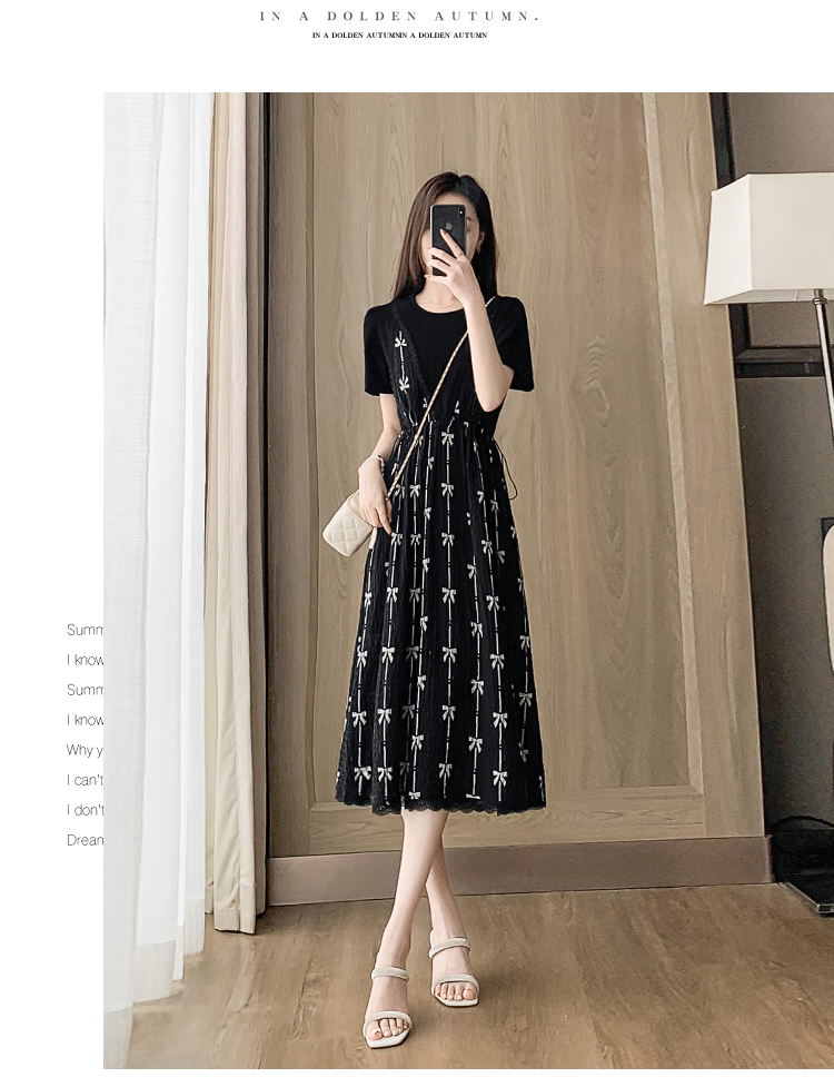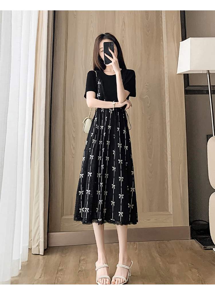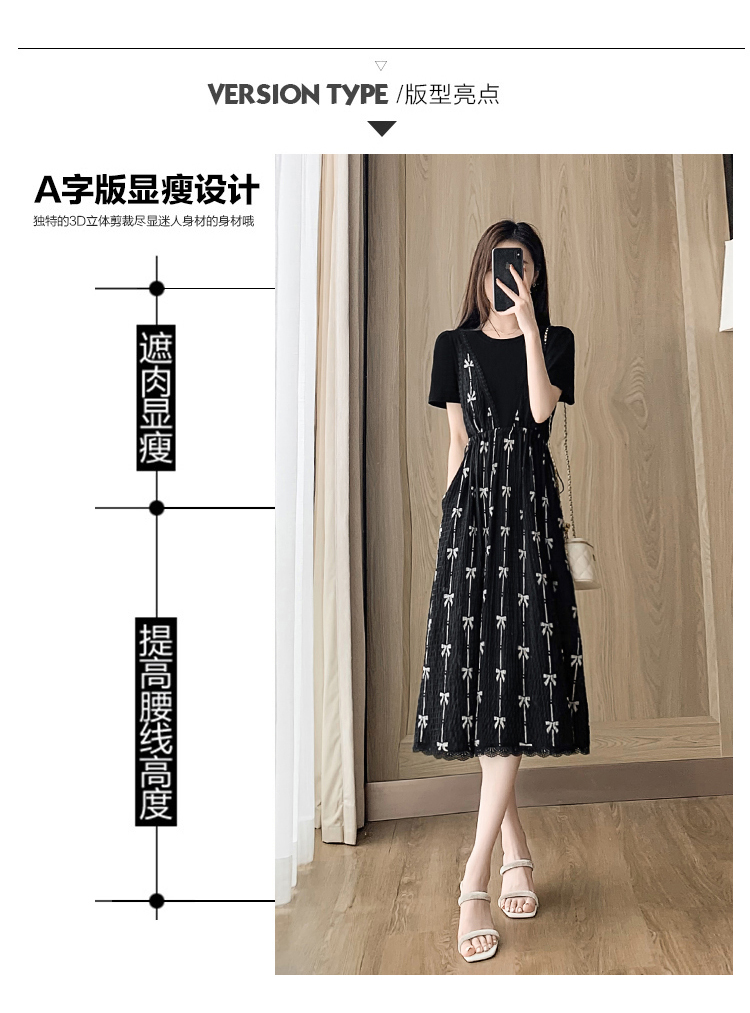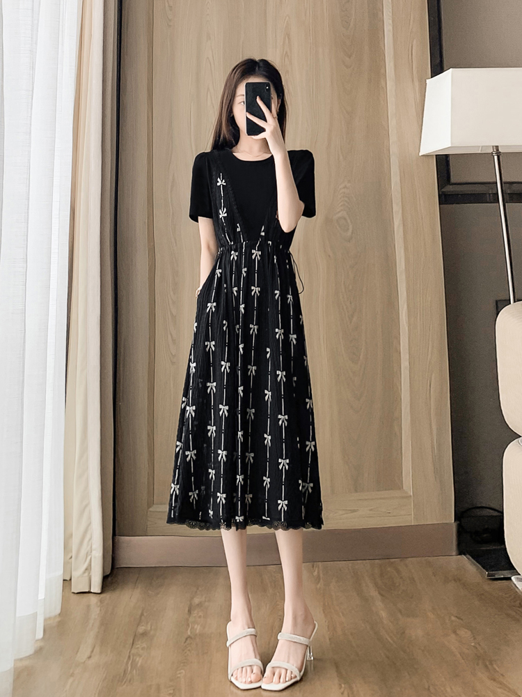 小個子黑色連衣裙女夏季2025新款假兩件套收腰顯瘦氣質a字裙子女
