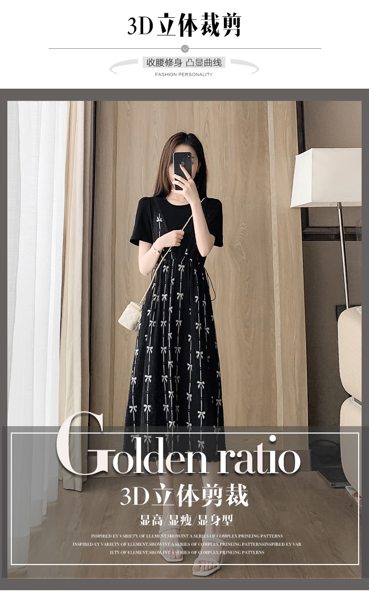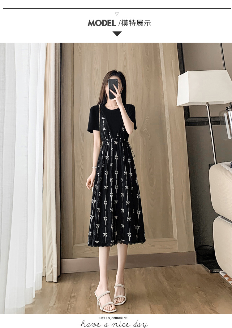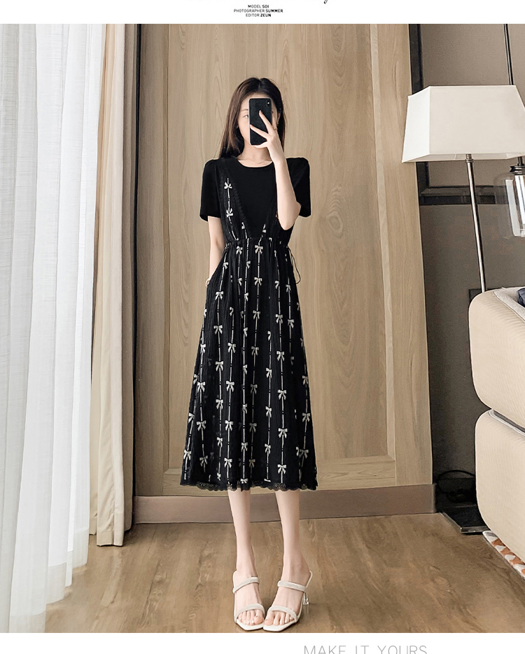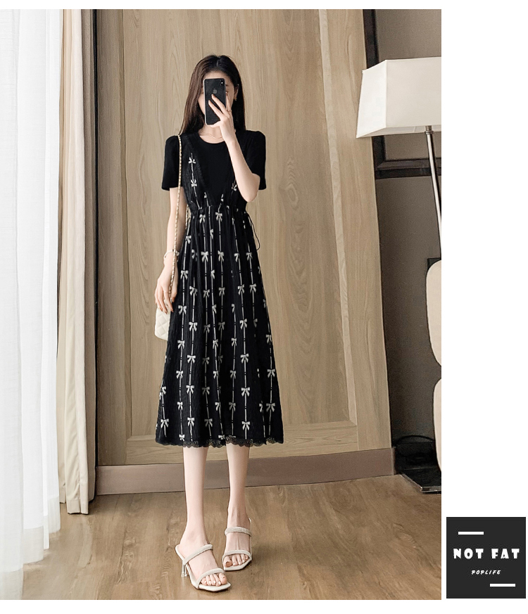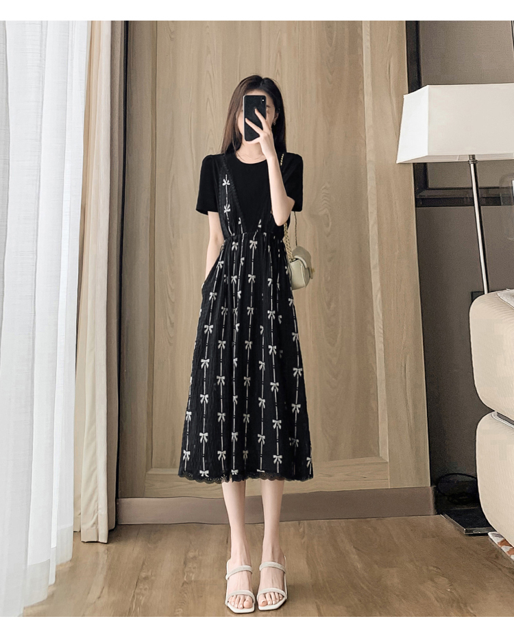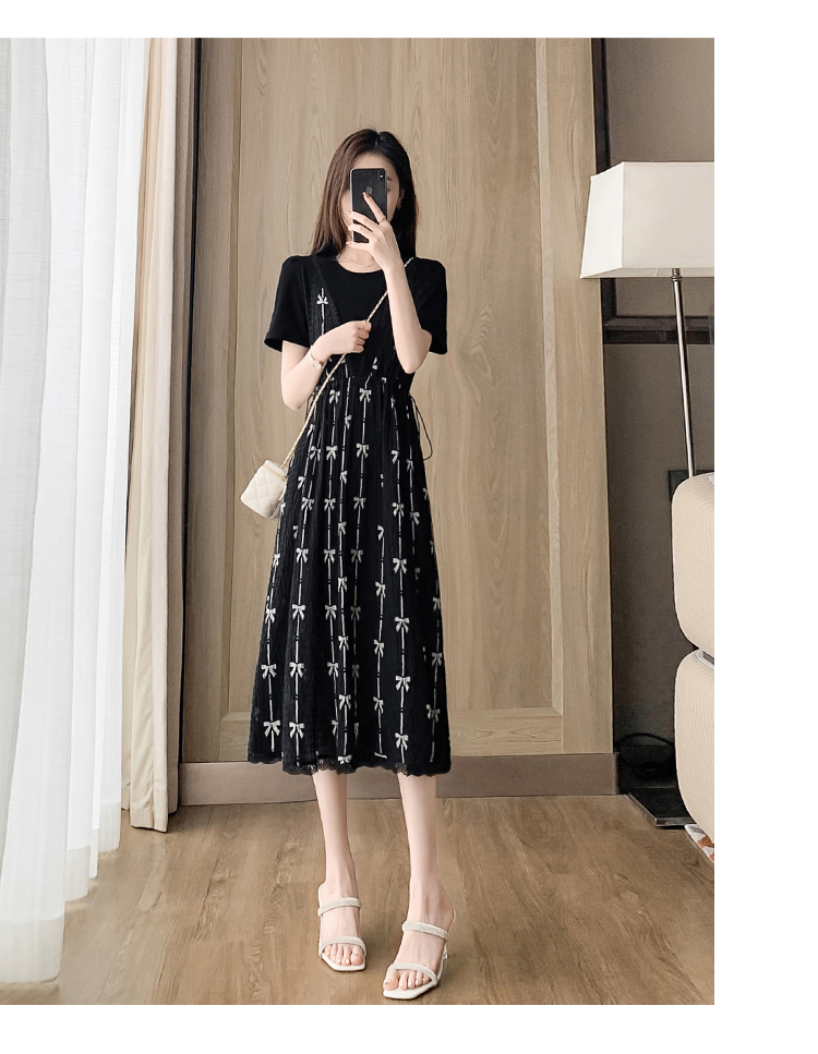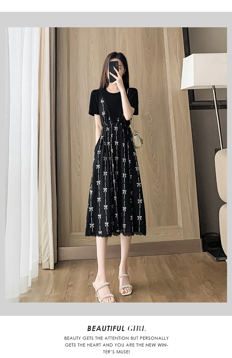 小個子黑色連衣裙女夏季2025新款假兩件套收腰顯瘦氣質a字裙子女