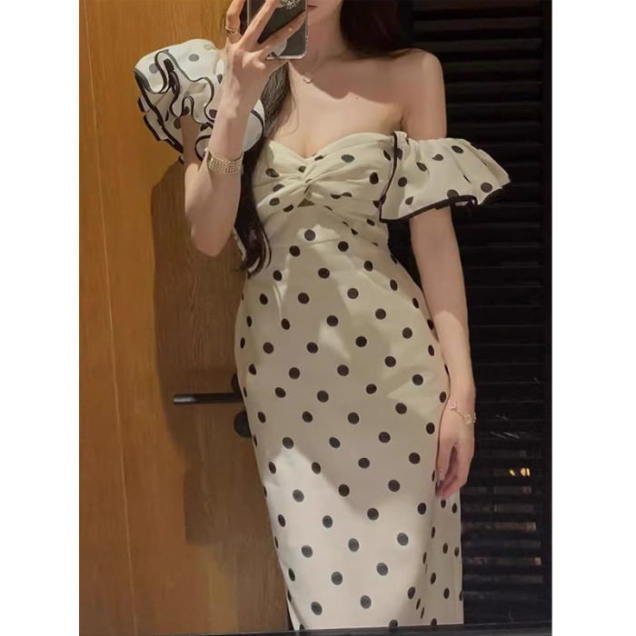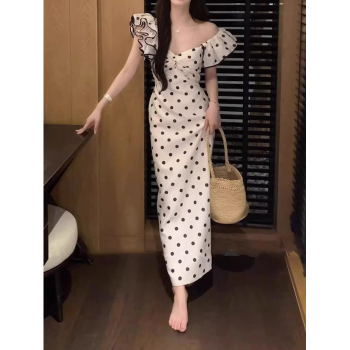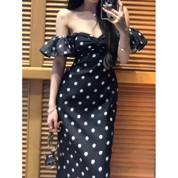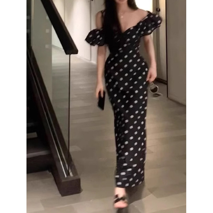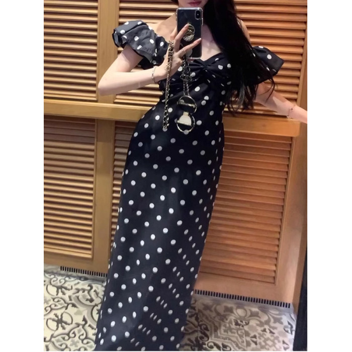 歐洲站高級復古修身氣質高級黑白波點抹胸生日禮服長裙連衣裙女夏