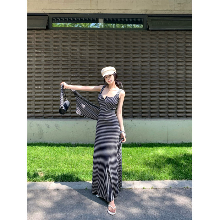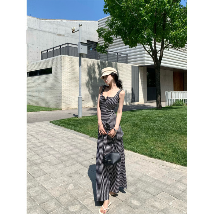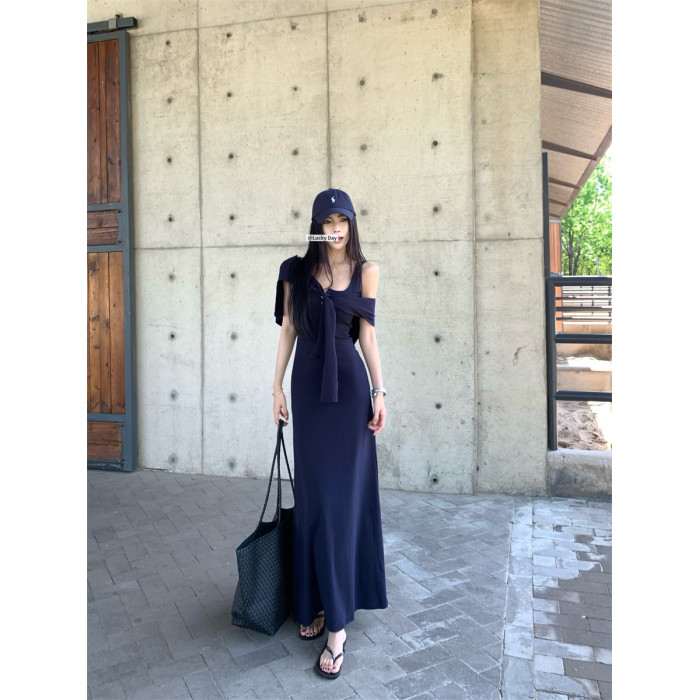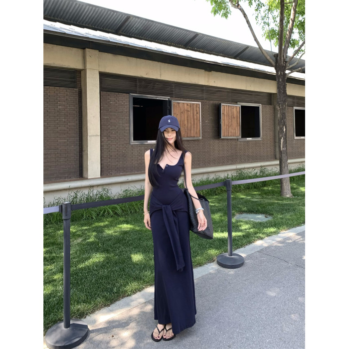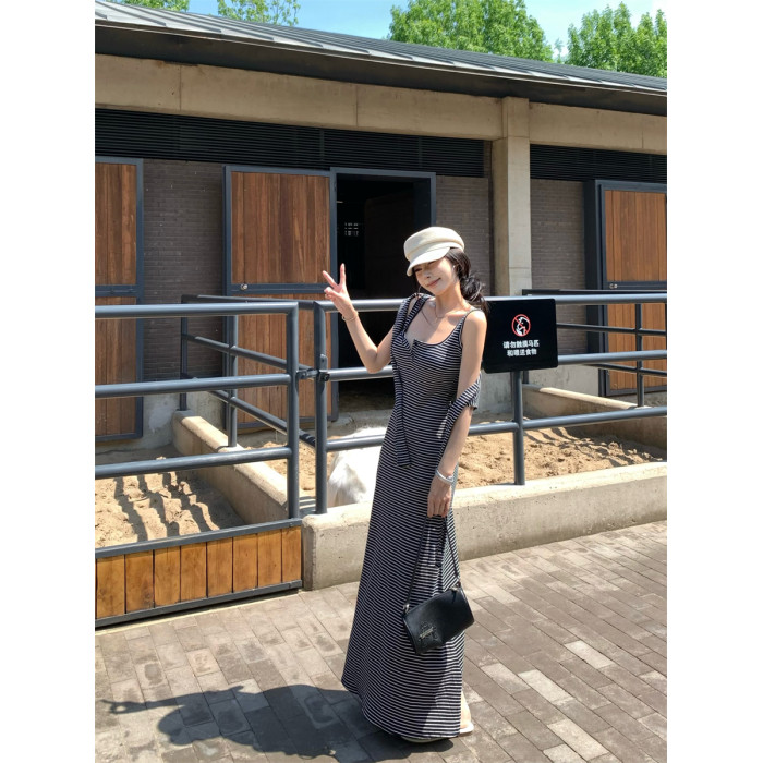 高個子加長版帶胸墊背心無袖針織連衣裙女夏季氣質披肩吊帶兩件套