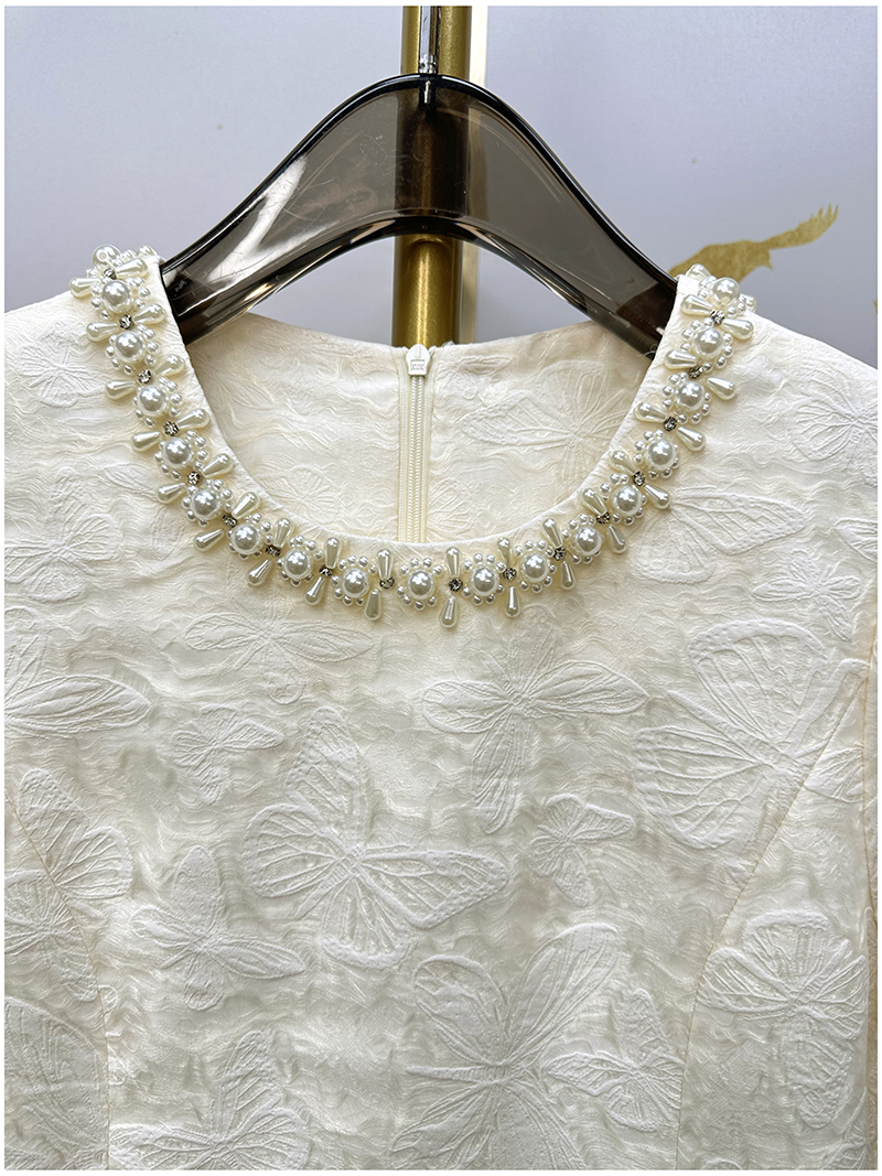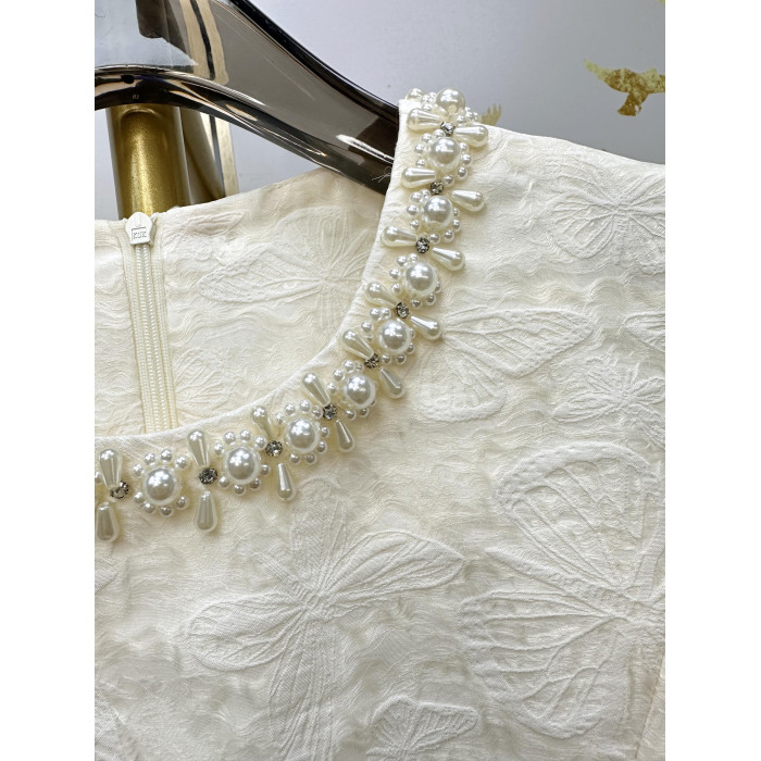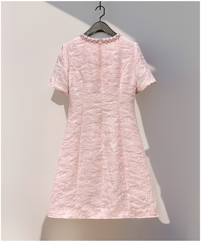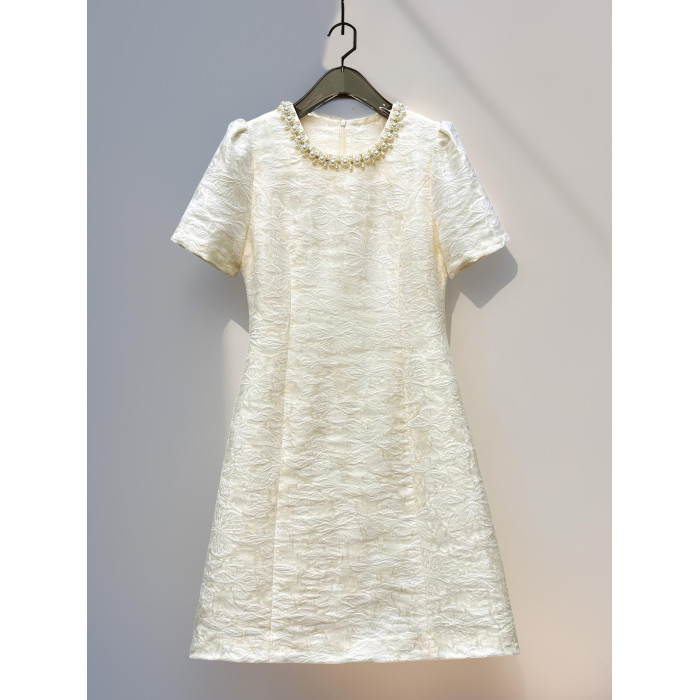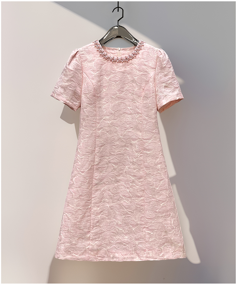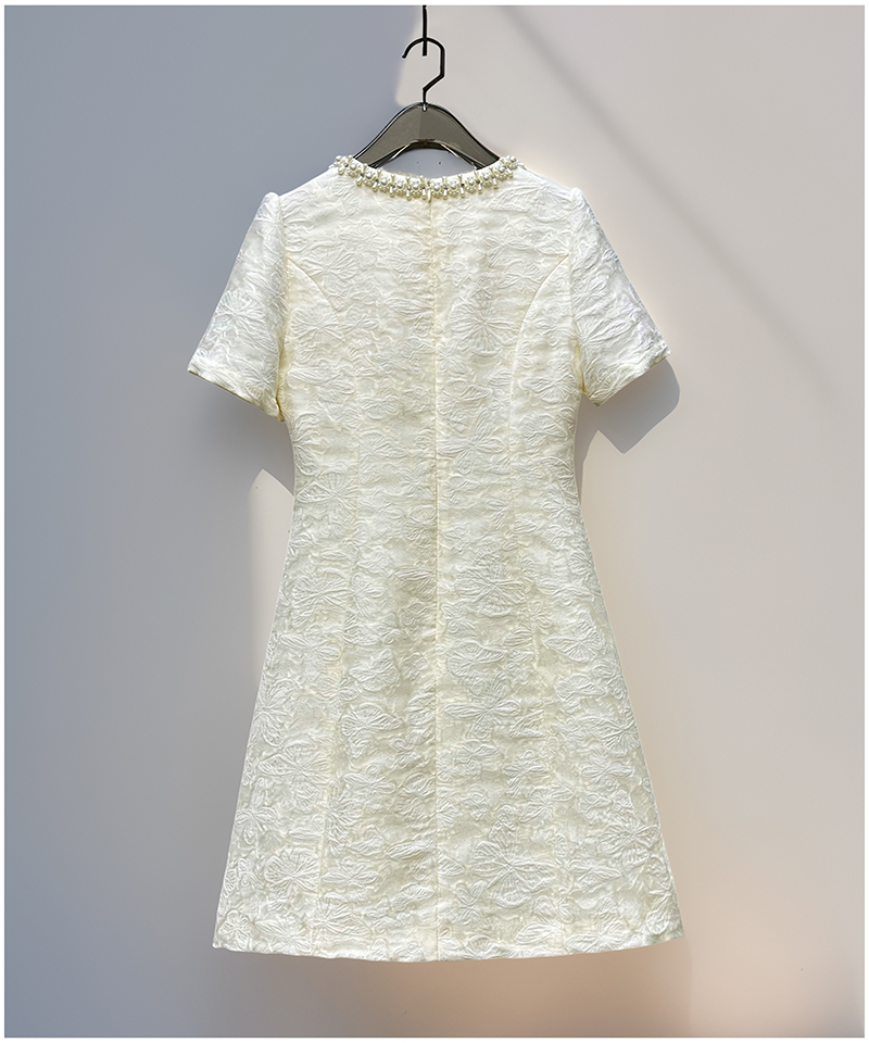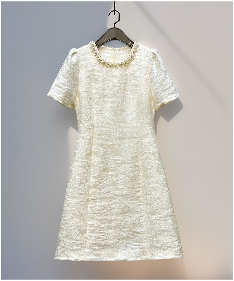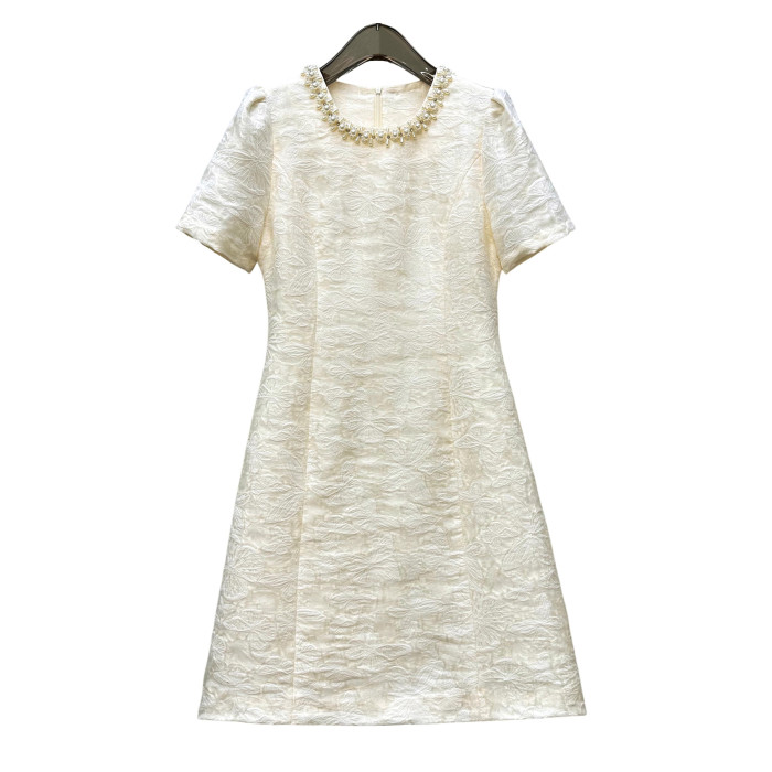 名媛通勤~進口天絲棉絨線刺綉釘珠圓領短袖a字裙高級感輕奢連衣裙