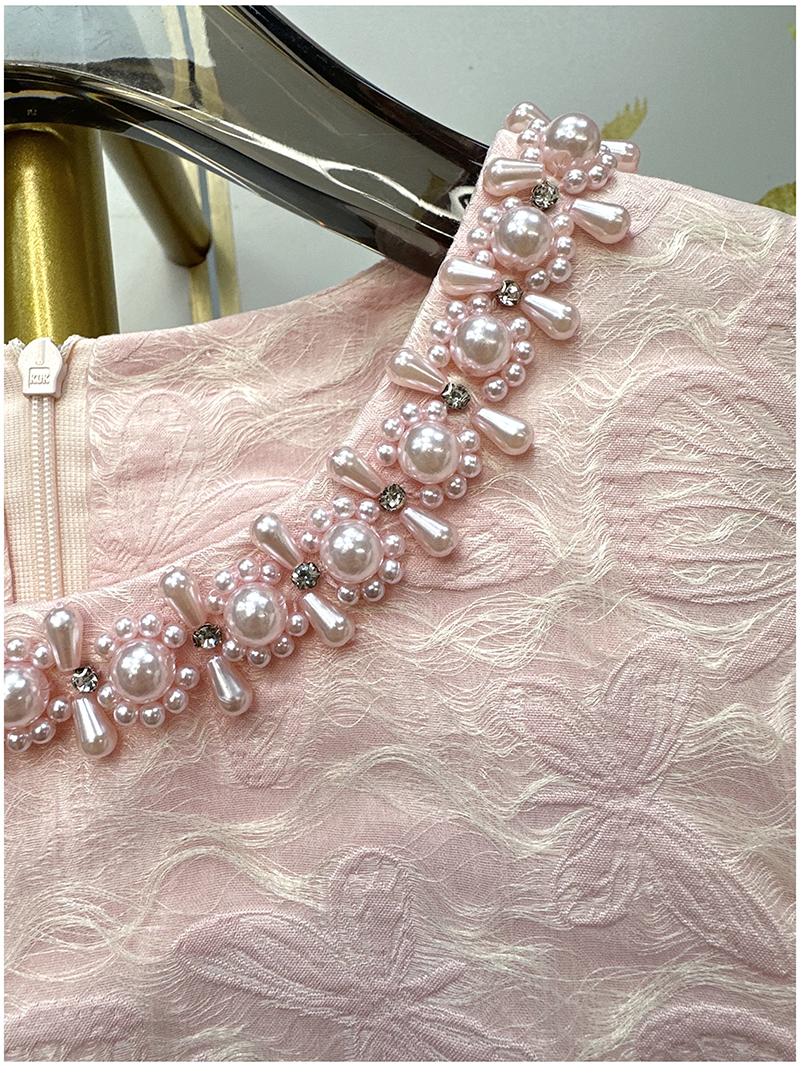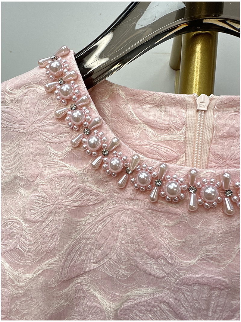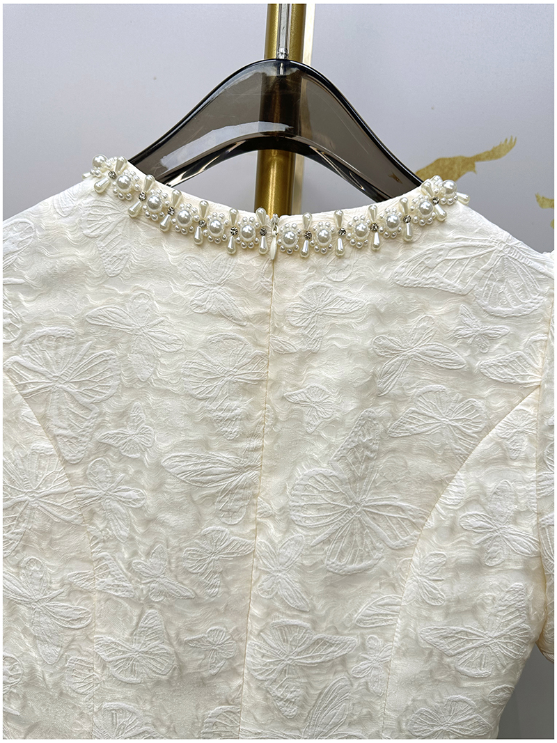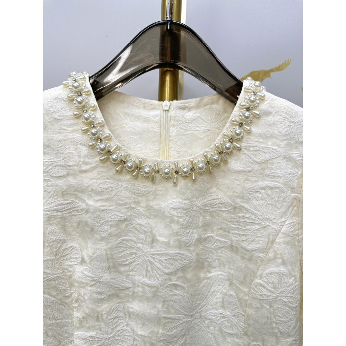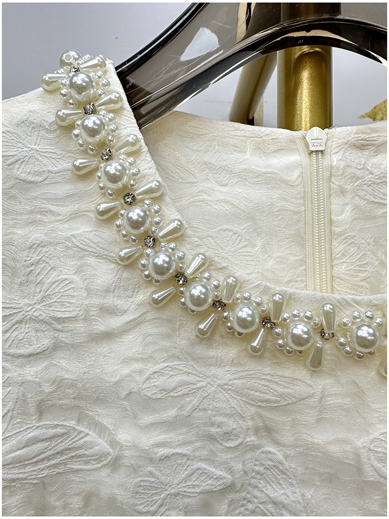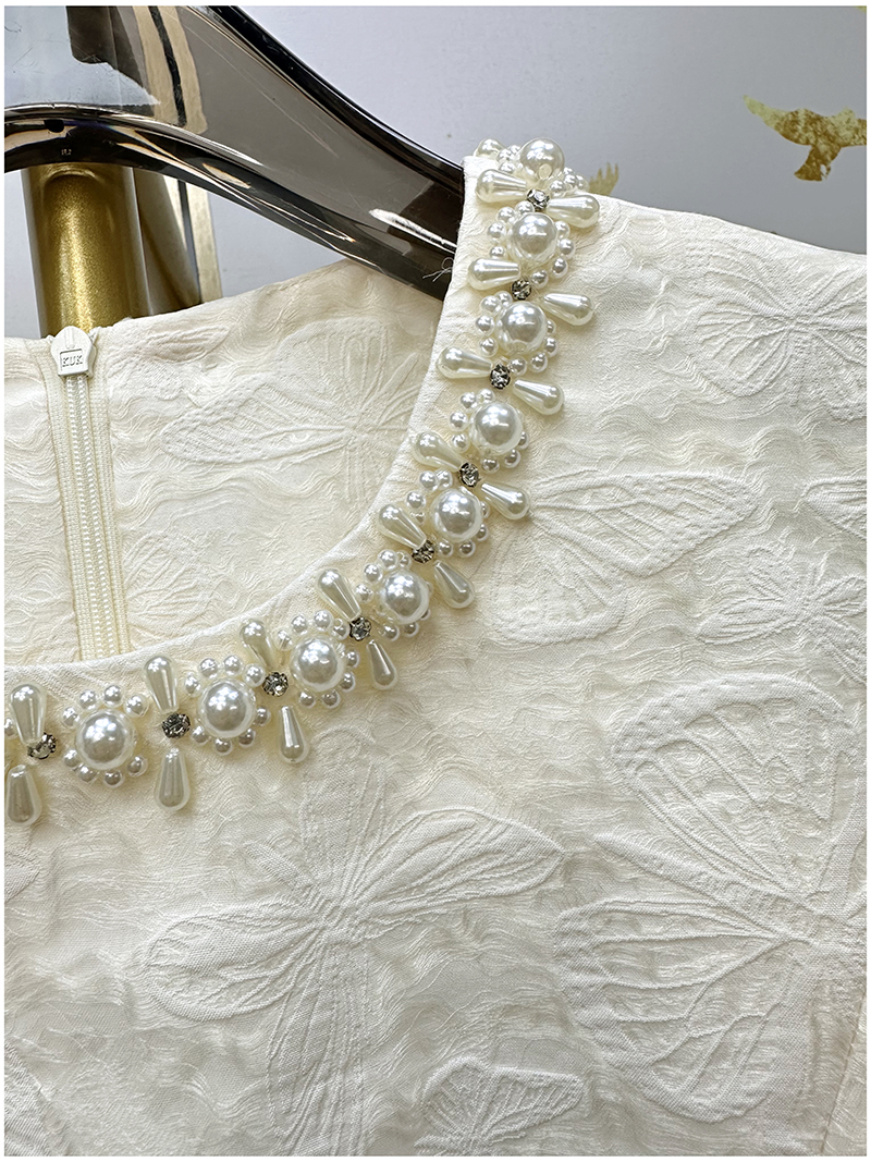 名媛通勤~進口天絲棉絨線刺綉釘珠圓領短袖a字裙高級感輕奢連衣裙