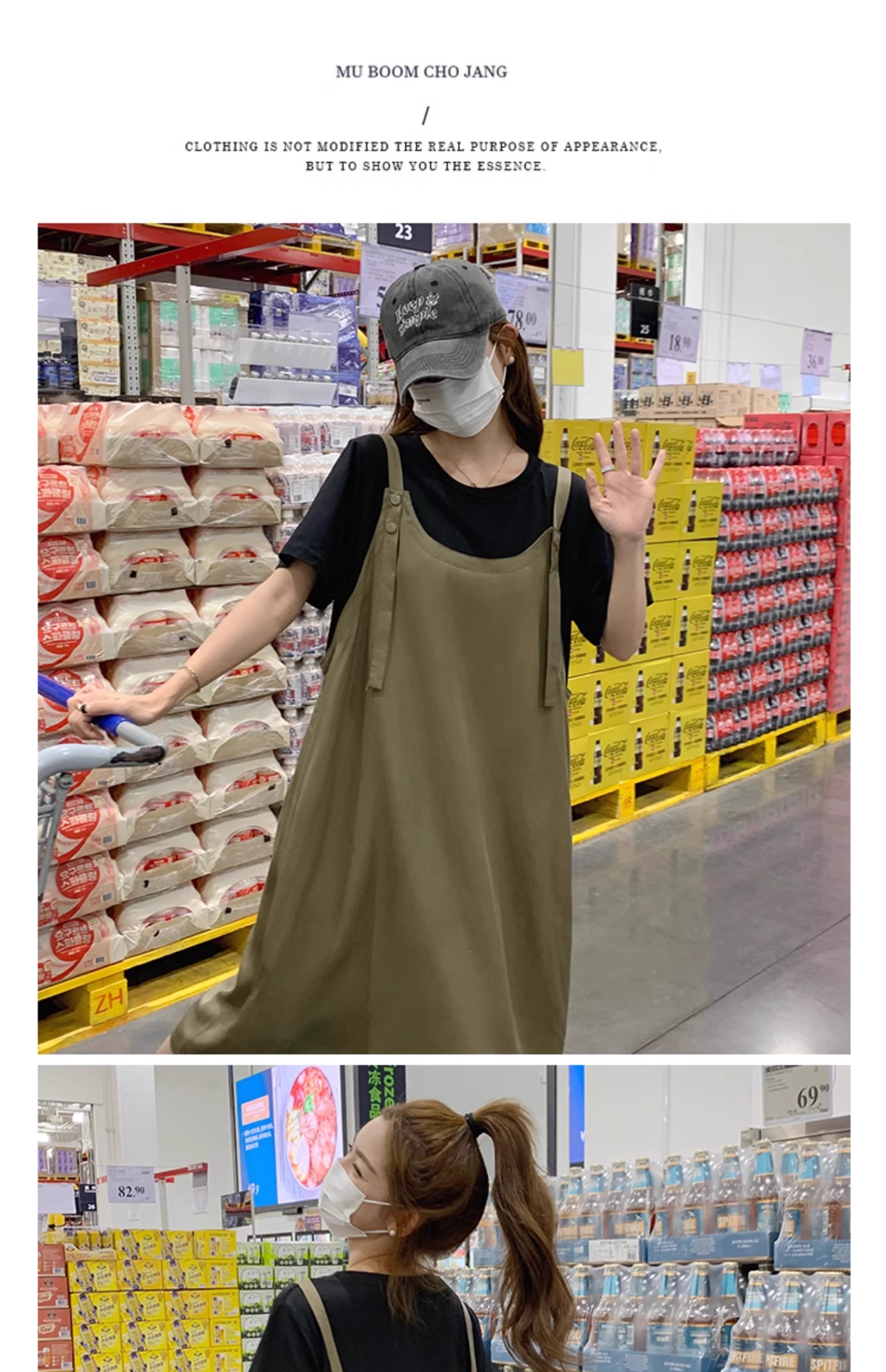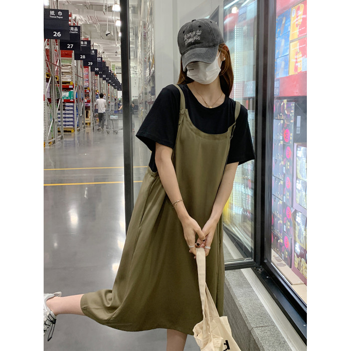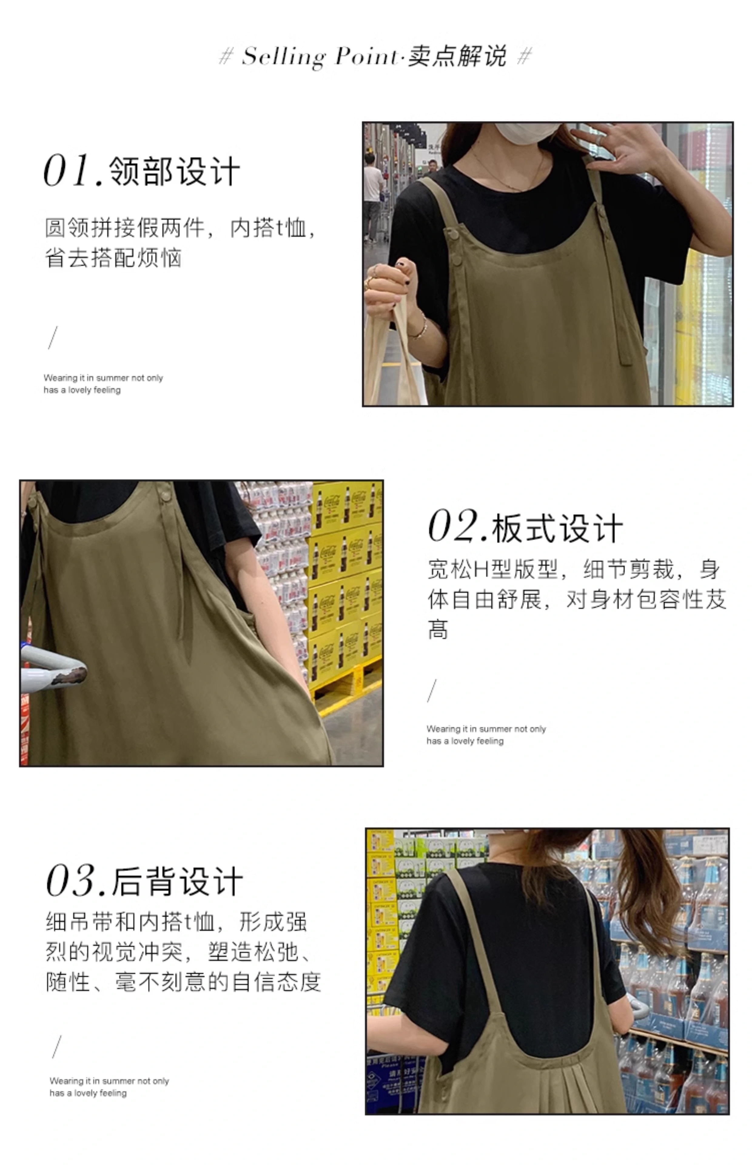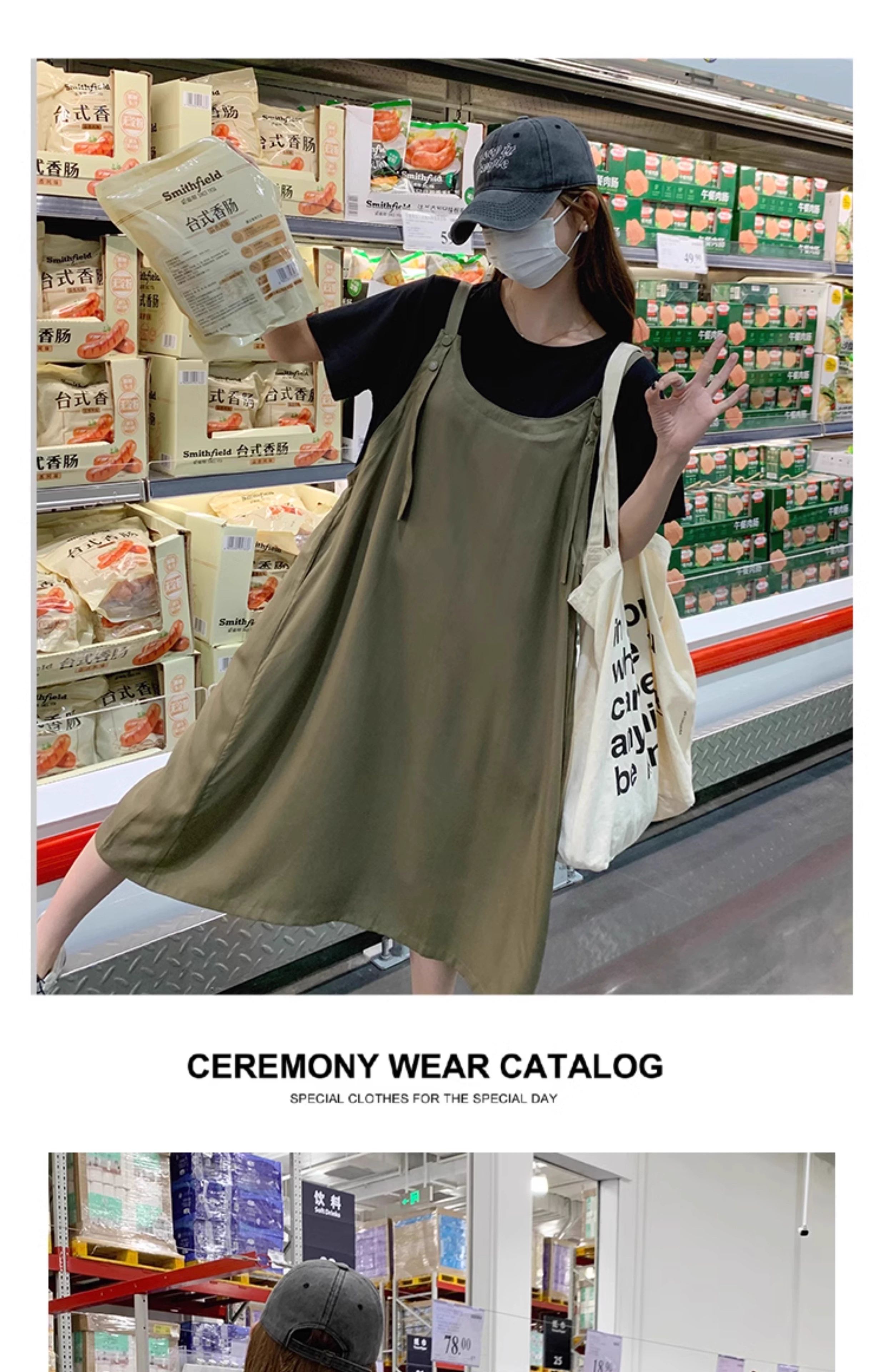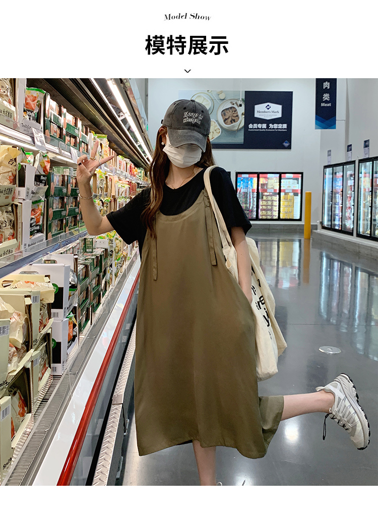 假兩件連衣裙女夏季寬松大碼微胖mm孕婦遮肚子減齡顯瘦中長背帶裙