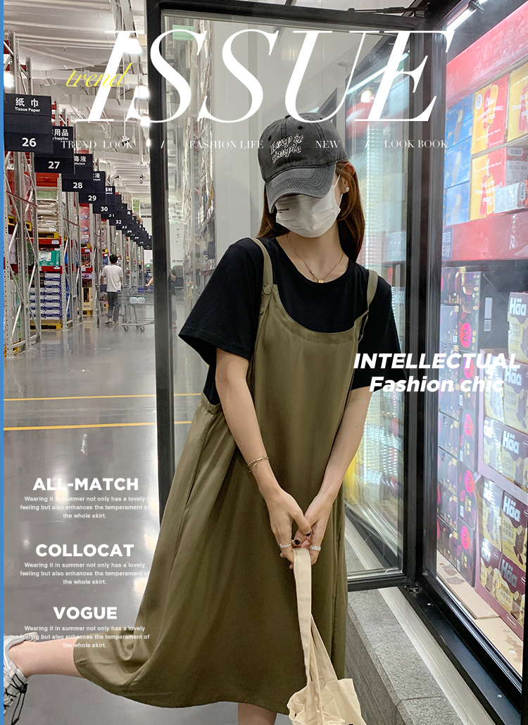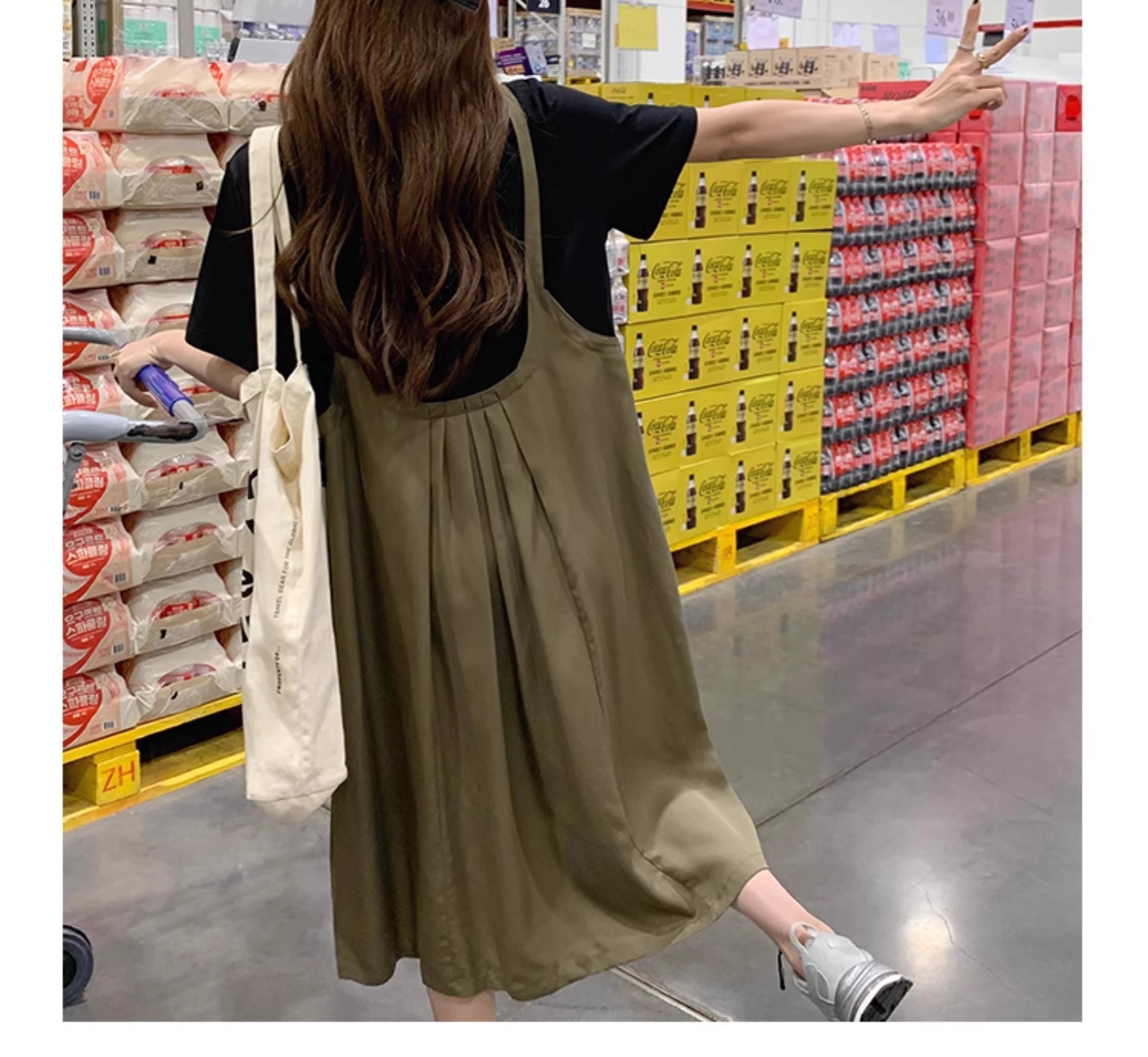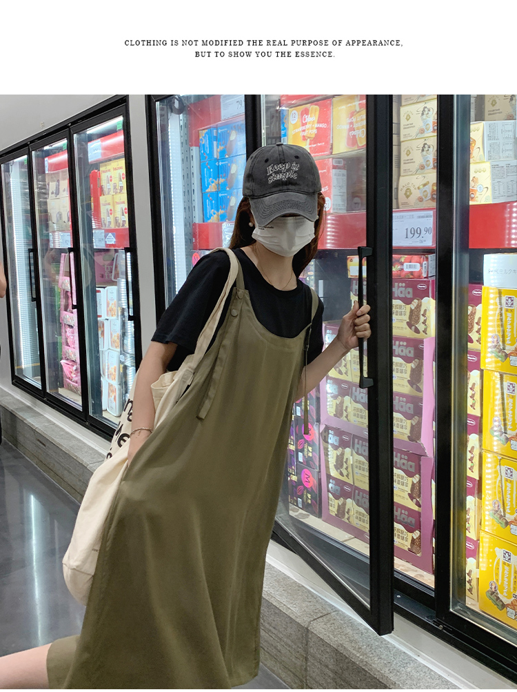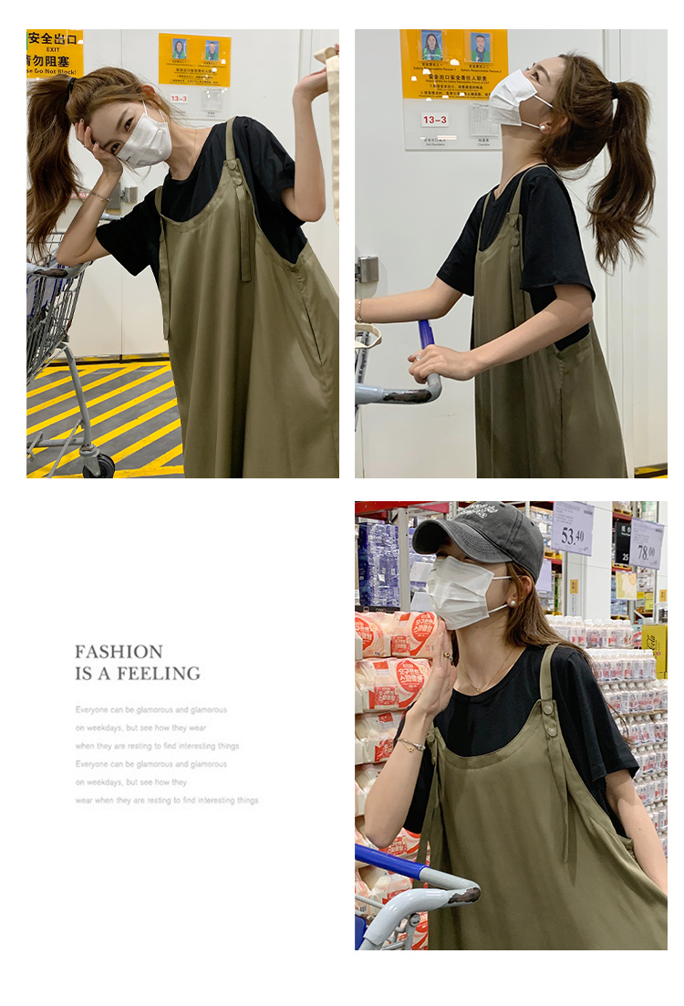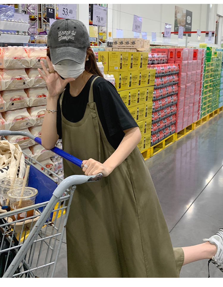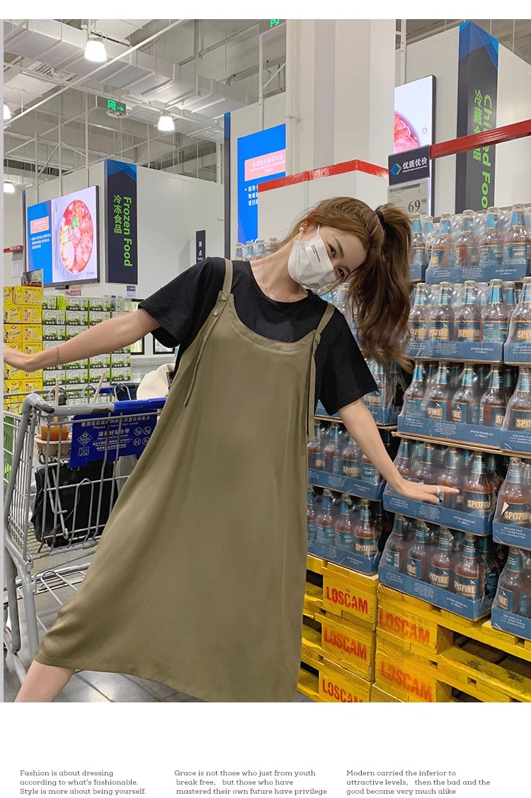 假兩件連衣裙女夏季寬松大碼微胖mm孕婦遮肚子減齡顯瘦中長背帶裙