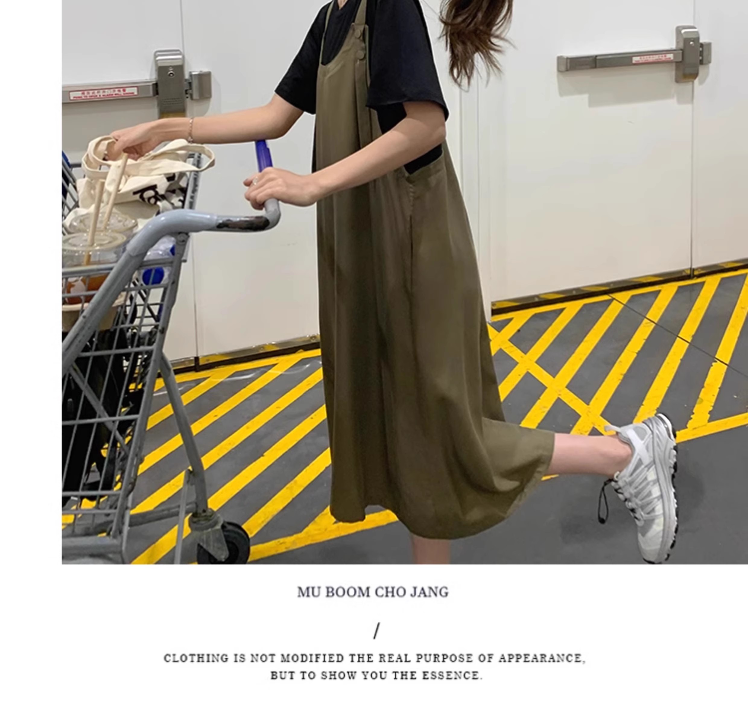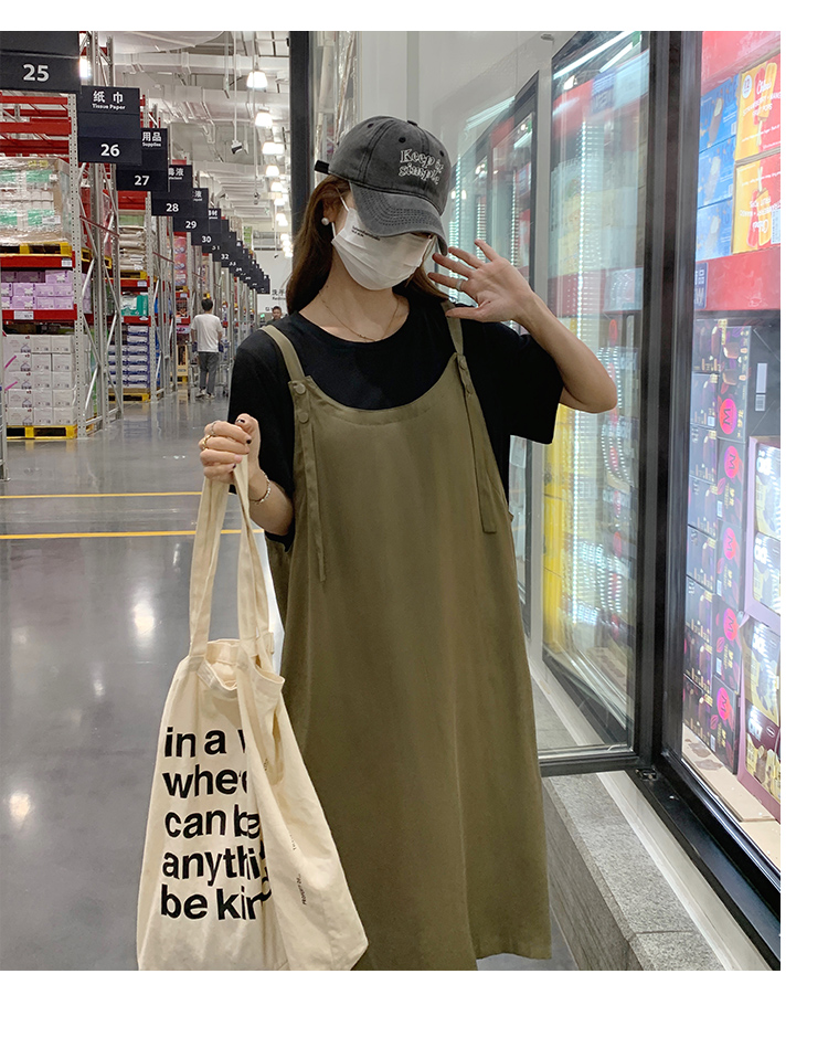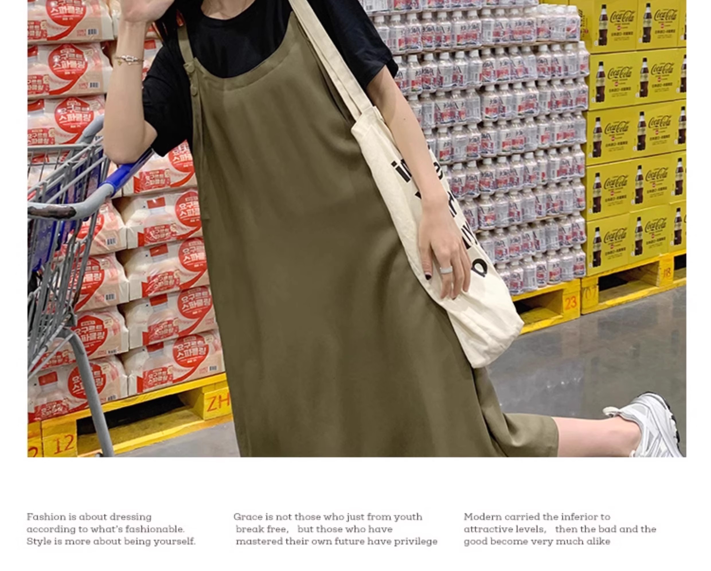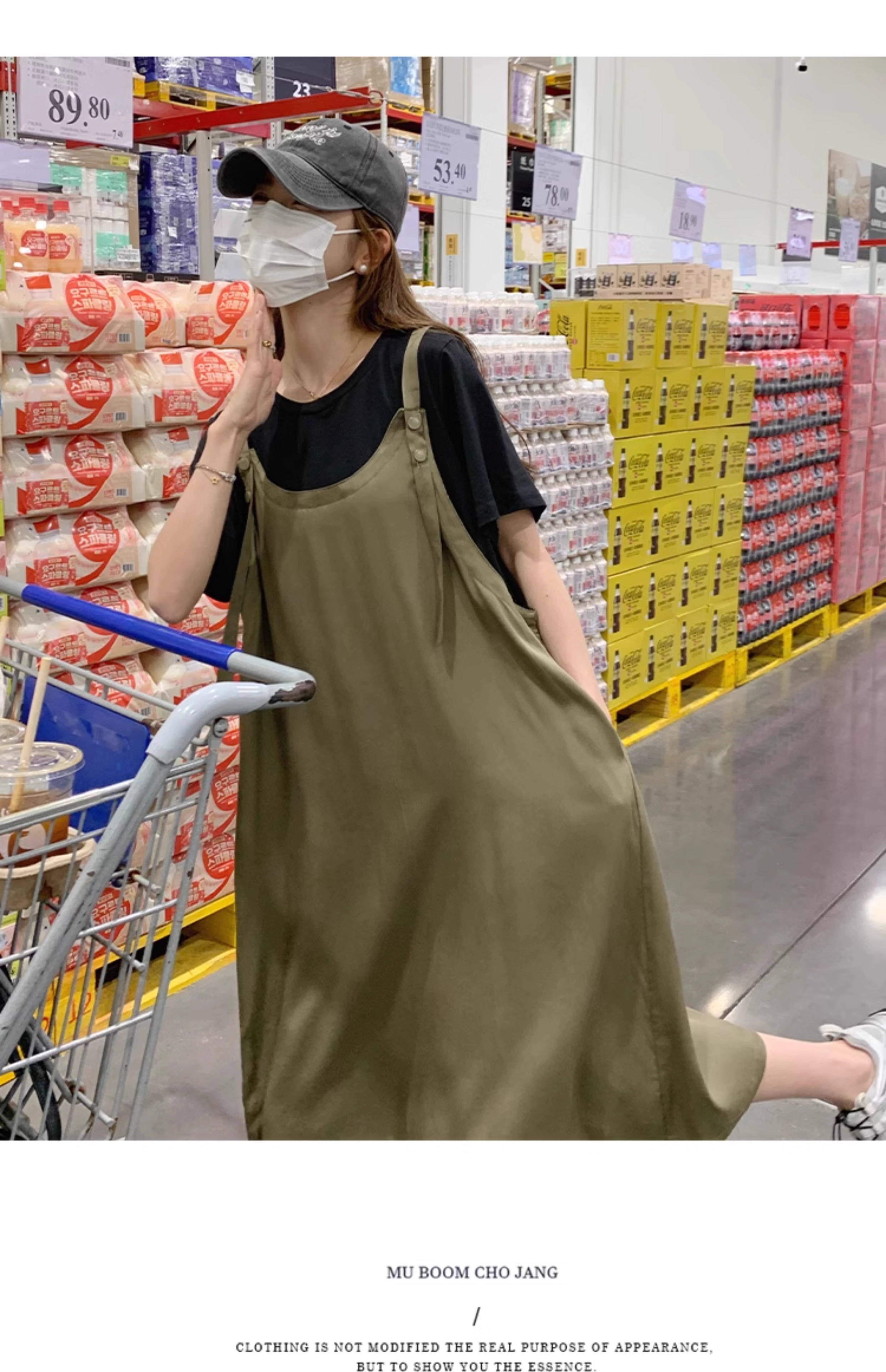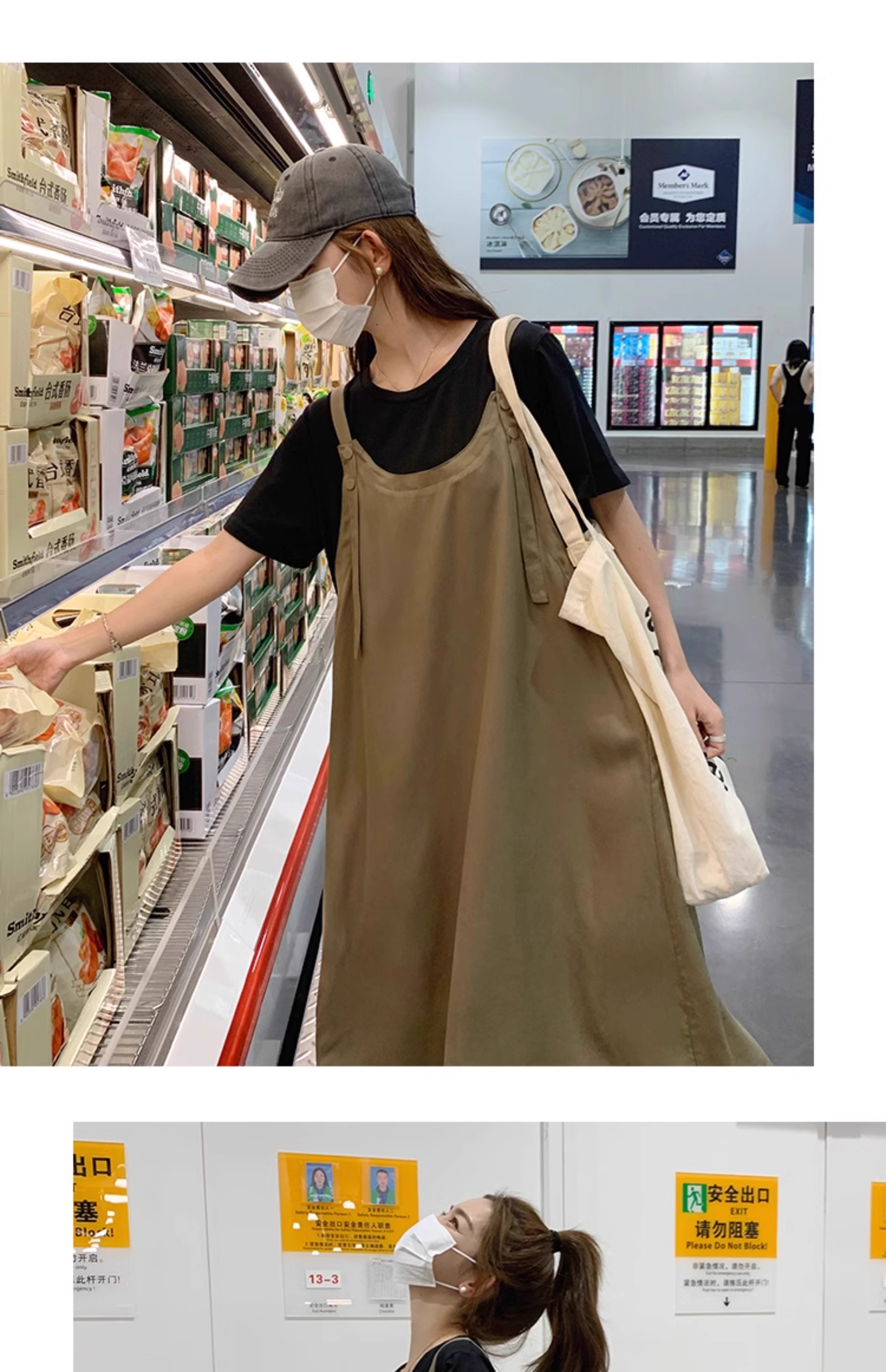 假兩件連衣裙女夏季寬松大碼微胖mm孕婦遮肚子減齡顯瘦中長背帶裙