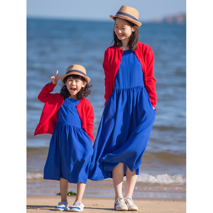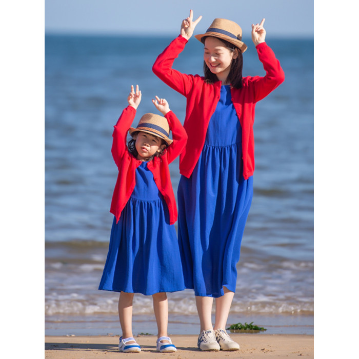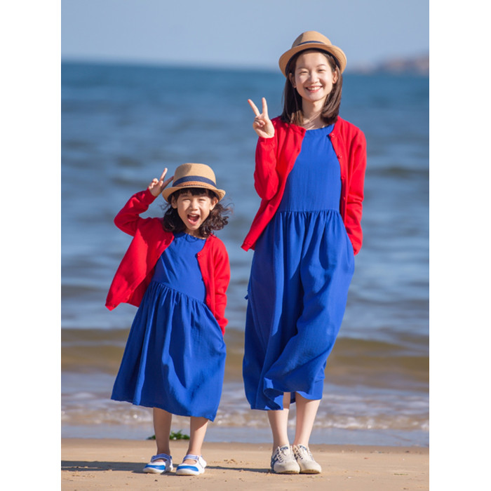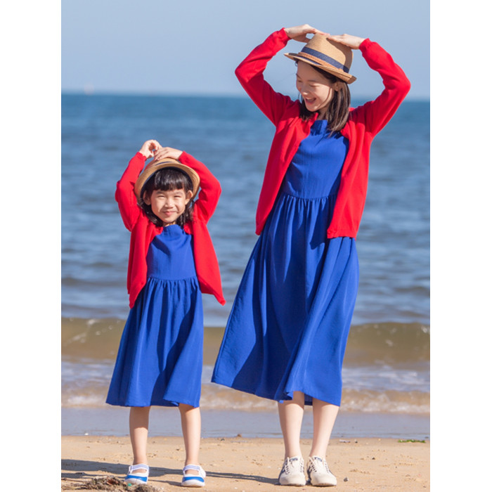 小樂往原創親子裝145課 春秋大紅色棉開衫草原海邊度假母女穿搭