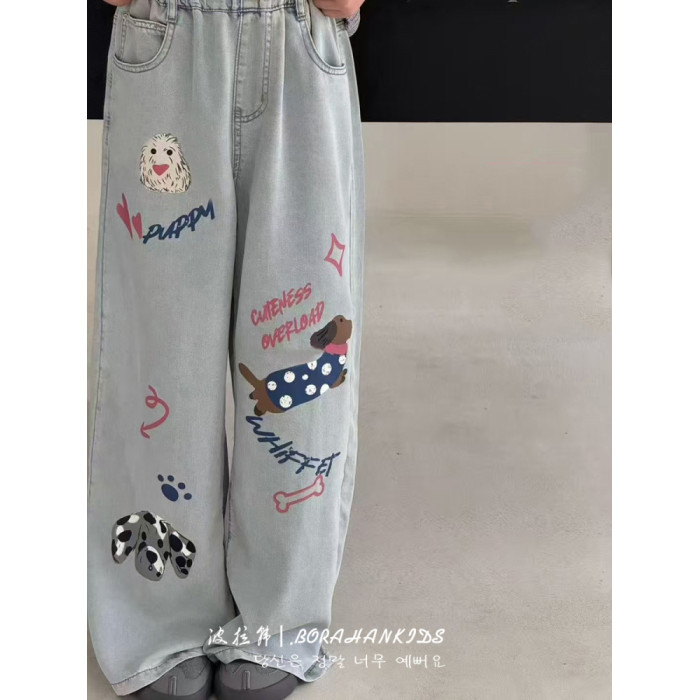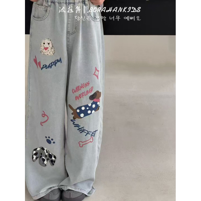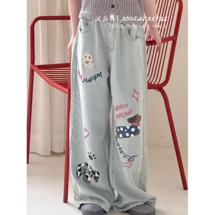 波拉韓女童夏季超薄天絲牛仔褲兒童褲子2025中大童垂感塗鴉直筒褲