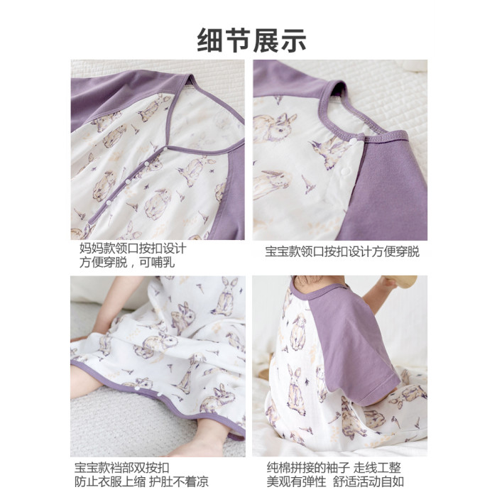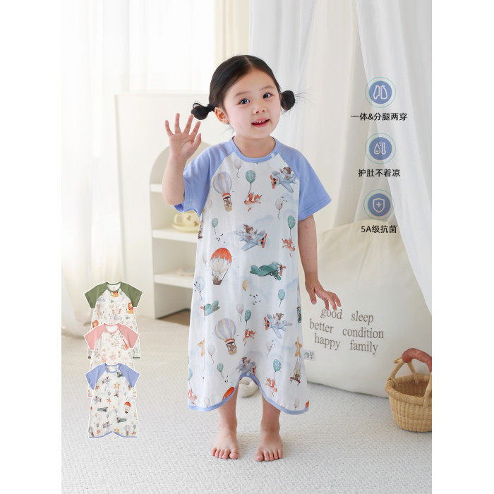 夏季雙層竹棉紗布連體睡衣寶寶家居服嬰兒睡袋兒童短袖睡裙親子裝