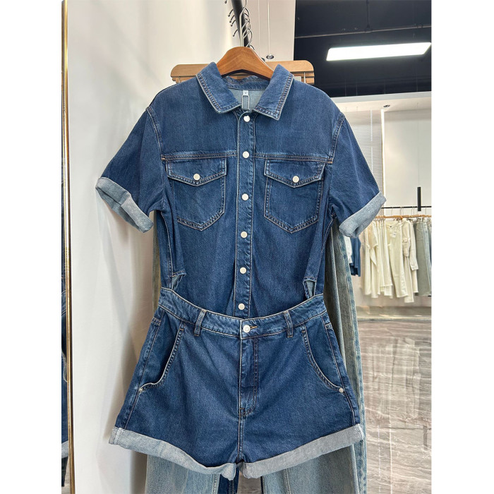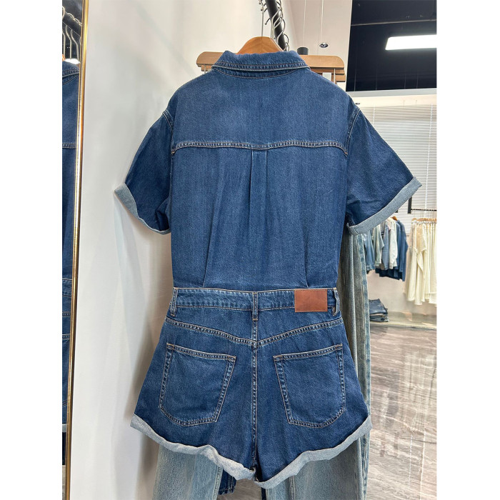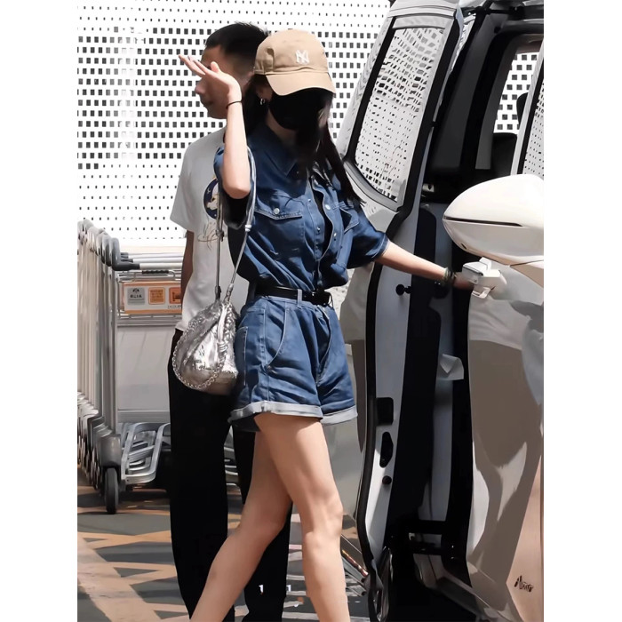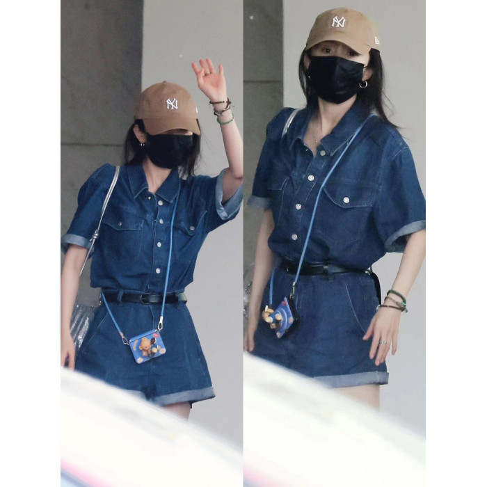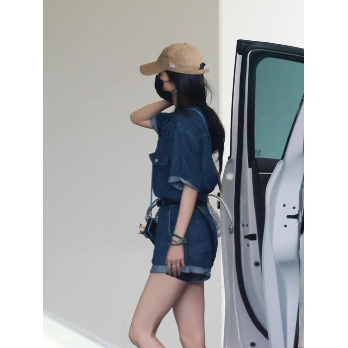 高腰港風冪冪同款深藍色牛仔連體衣女天絲漢麻牛仔短袖連體短褲夏
