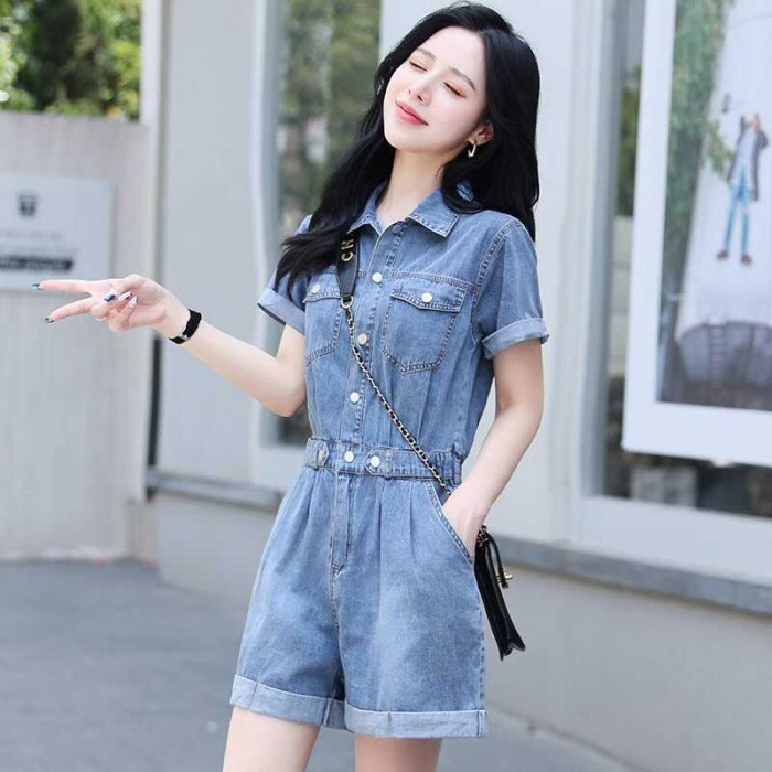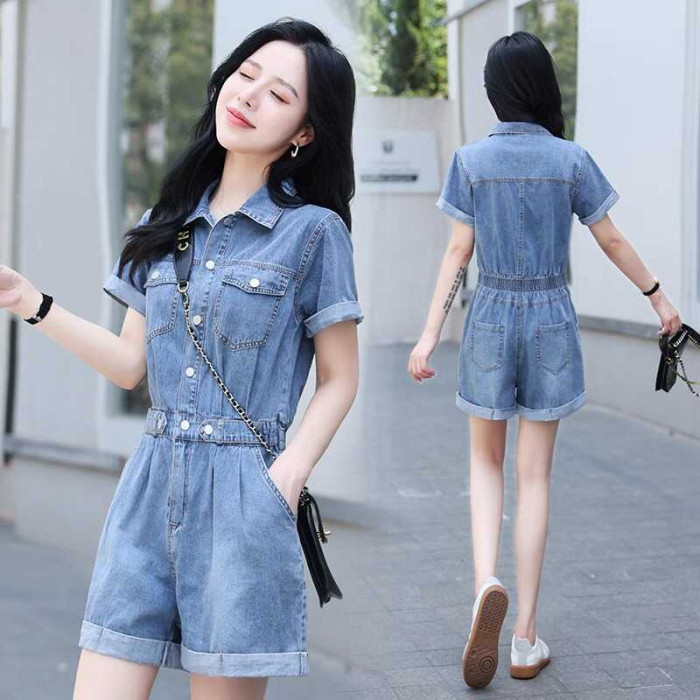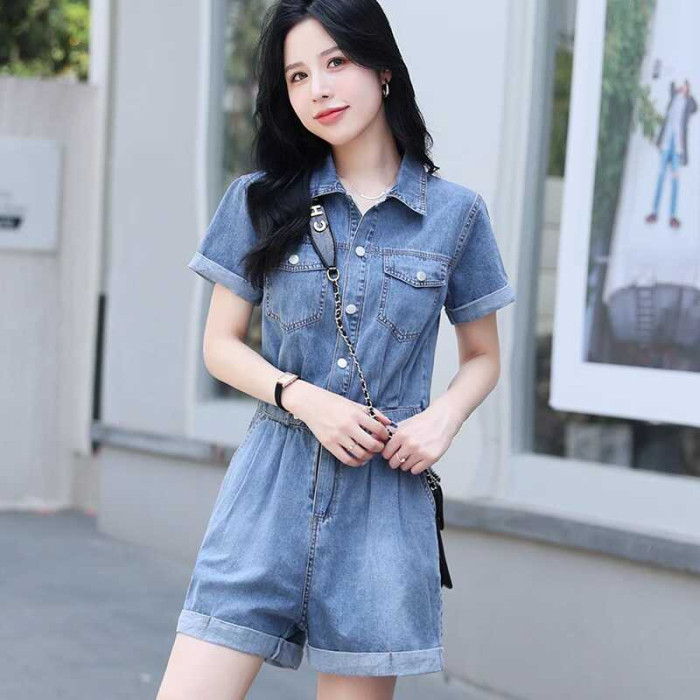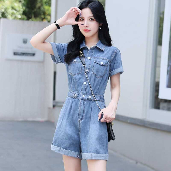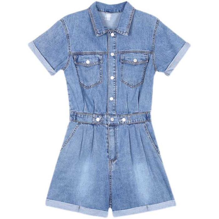 牛仔連體衣褲女夏季薄款2025新款小個子洋氣減齡短袖濶腿連體短褲
