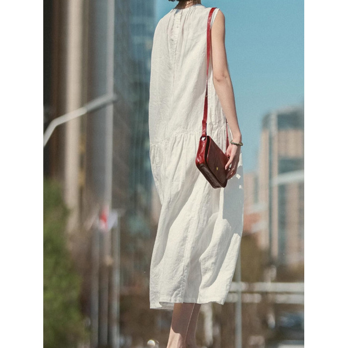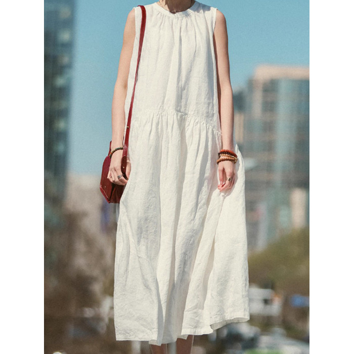 素媗全亞麻酵素洗軟乾爽透氣a字無袖連衣裙女長薄款夏季
