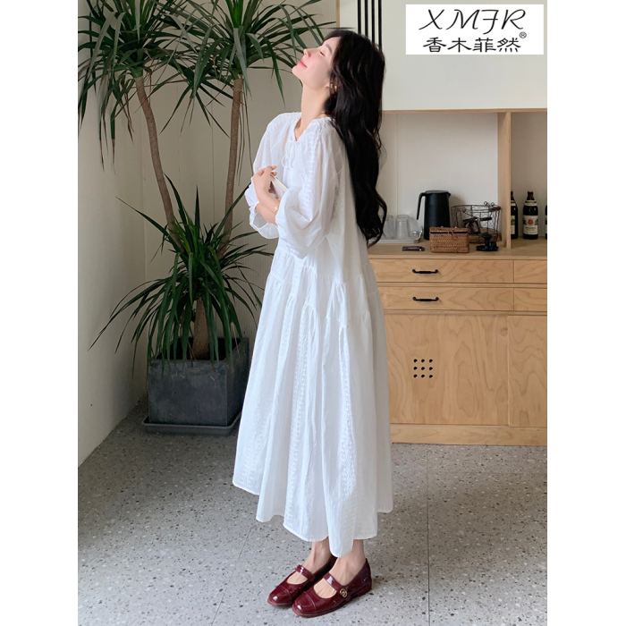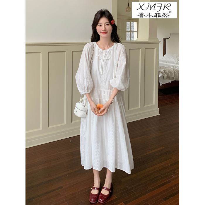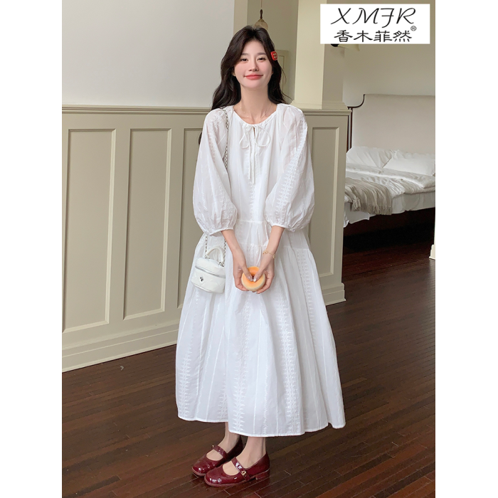 香木菲然港風法式白色連衣裙女夏季高級絕美寬松泡泡袖溫柔風長裙