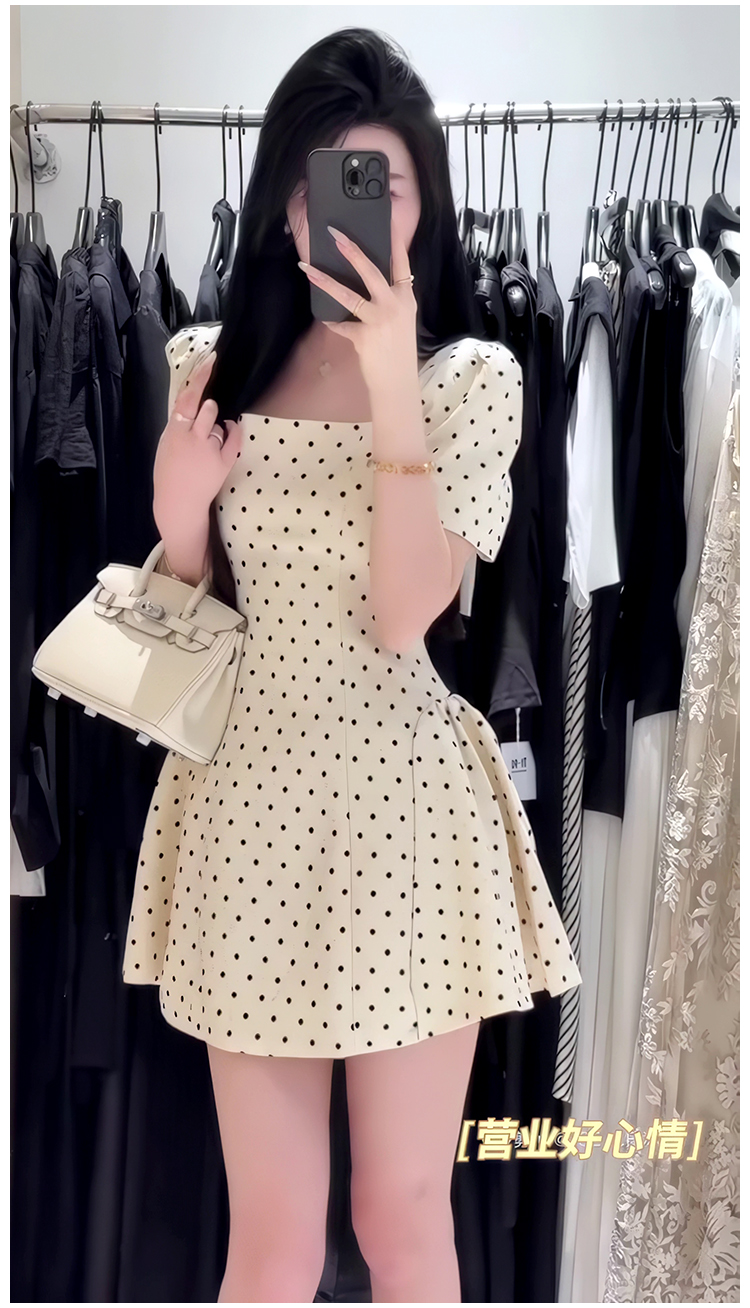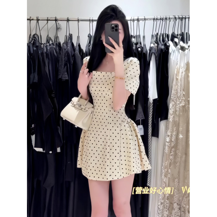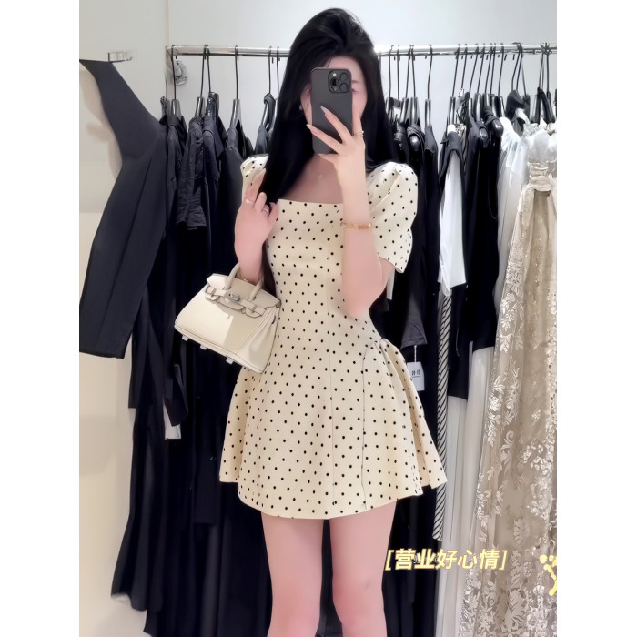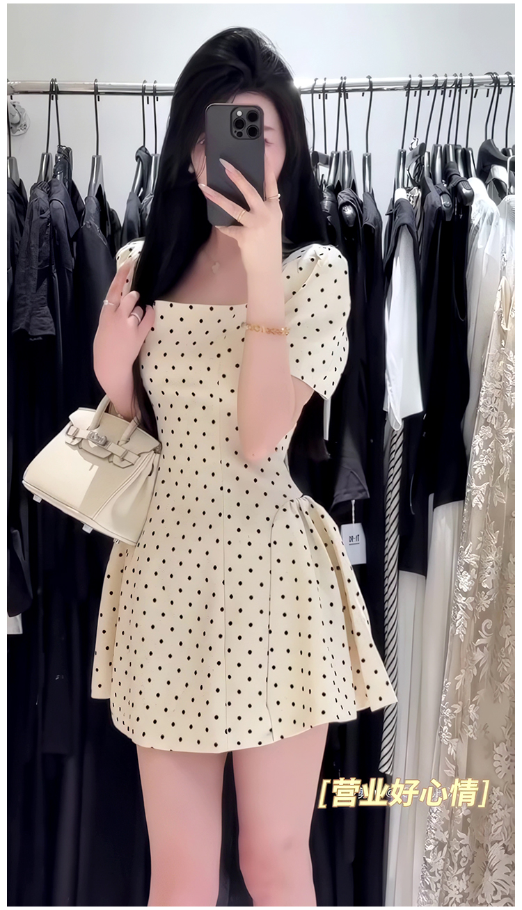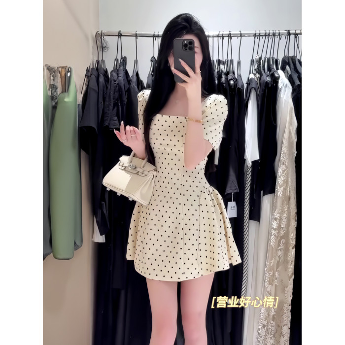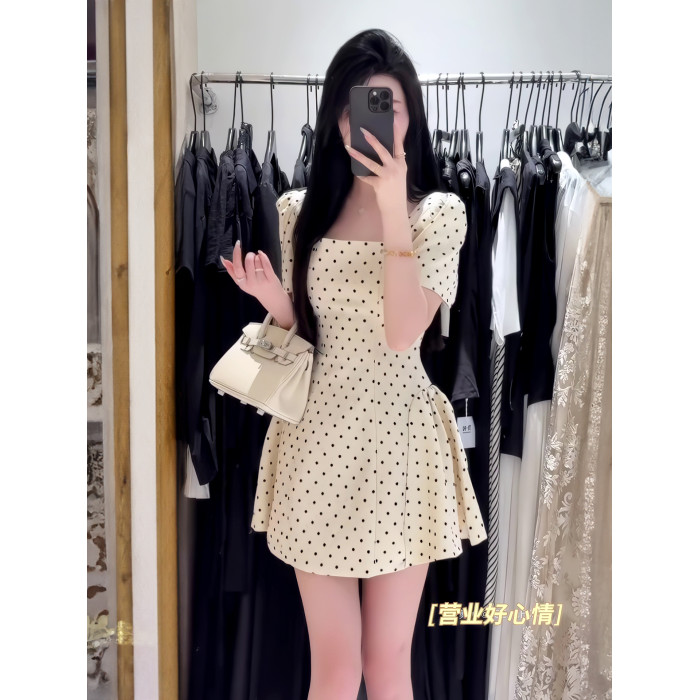 法式氣質方領高級感波點連衣裙女春夏季溫柔甜美收腰顯瘦a字短裙