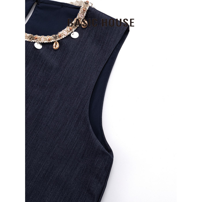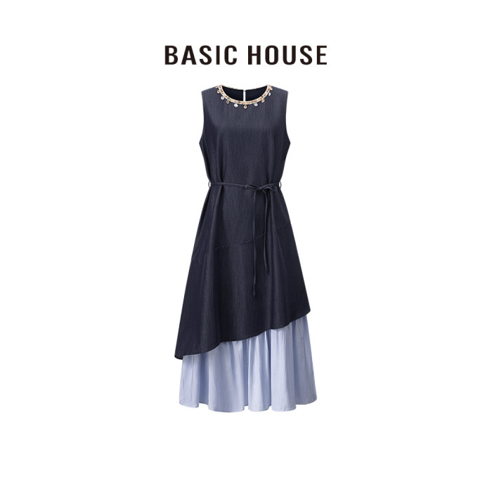 百家好/Basic House25年春季掛件圓領撞色拼接假兩件背心連衣裙
