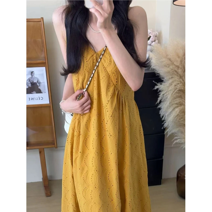 薑黃色連衣裙【單件】【今年流行的漂亮裙子/裙子女夏/今年流行爆款/巨好看/夏日絕美小裙子/法式/海邊度假】