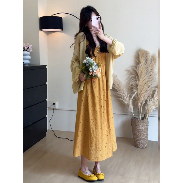 嬭黃色開衫+薑黃色連衣裙【巨好看的夏裝一整套/2025超火兩件套夏裝/一整套ootd穿搭減齡/辣妹/裙子套裝】