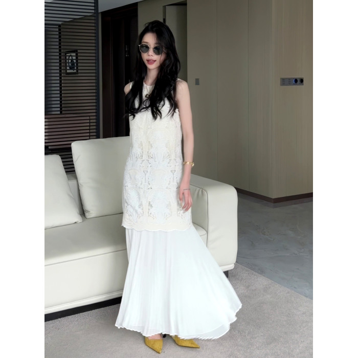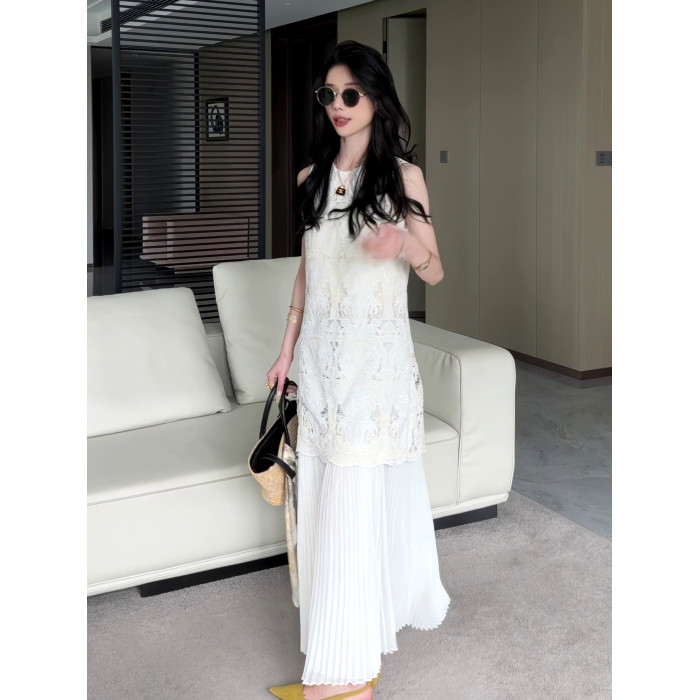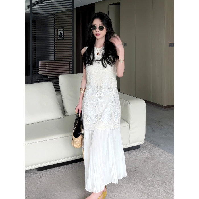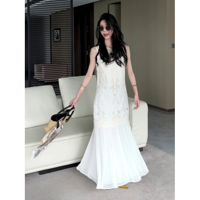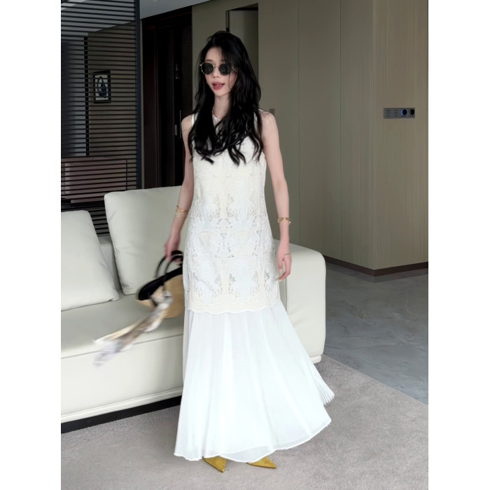 重工蕾絲鉤花假兩件無袖背心連衣裙女夏季新款高級設計感氣質長裙
