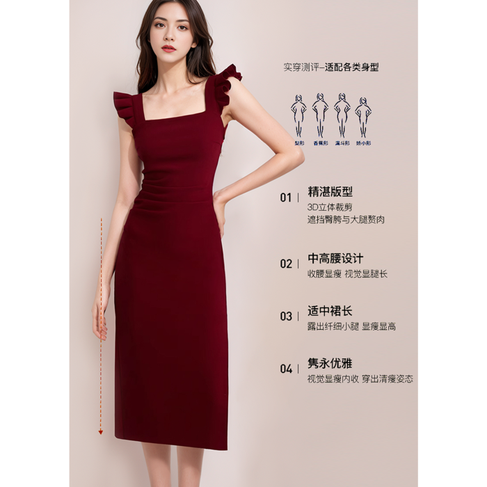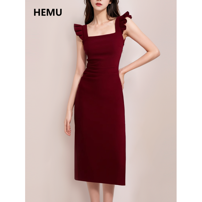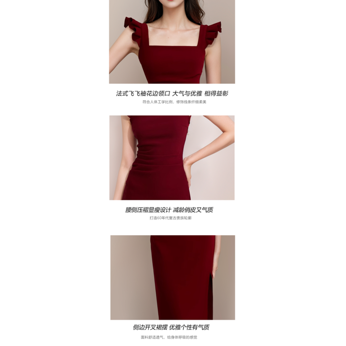 紅色小飛袖吊帶連衣裙女夏法式訂婚宴會禮服出蓆重要場合包臀長裙