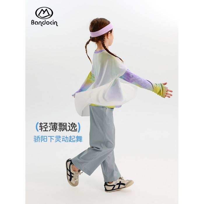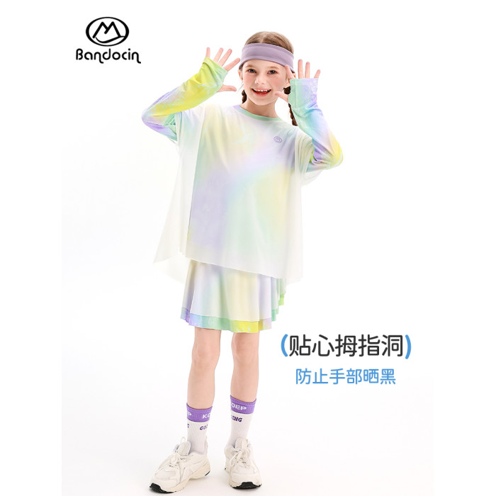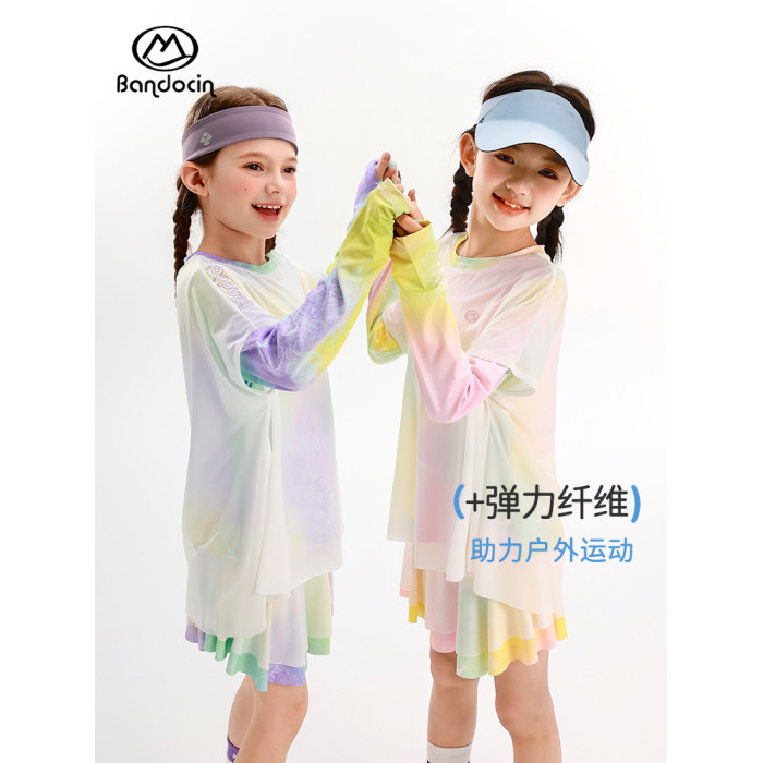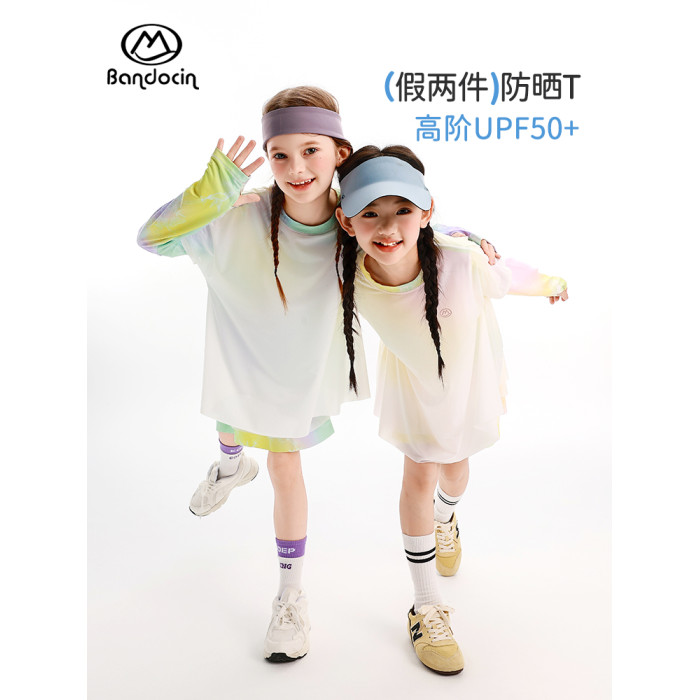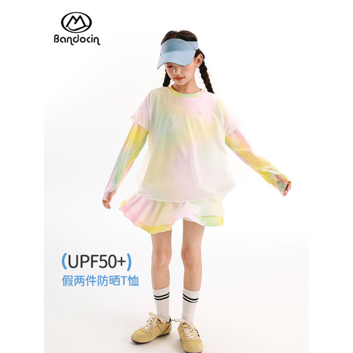 半度閒女童夏裝防曬假兩件長袖t恤薄款透氣2025新款兒童夏季上衣T