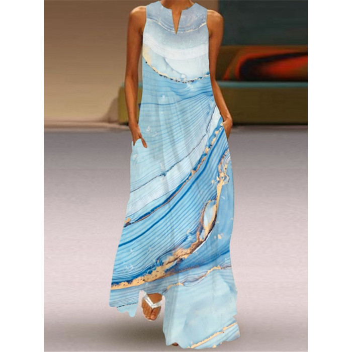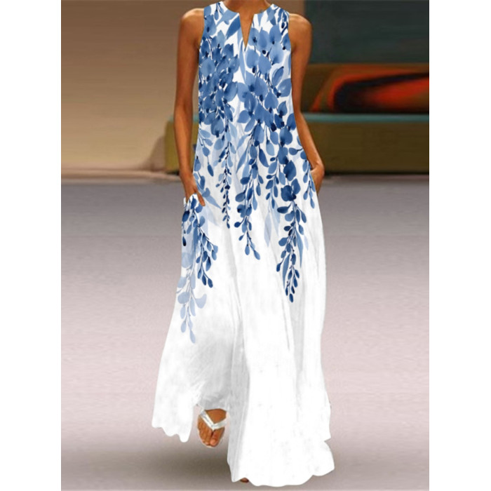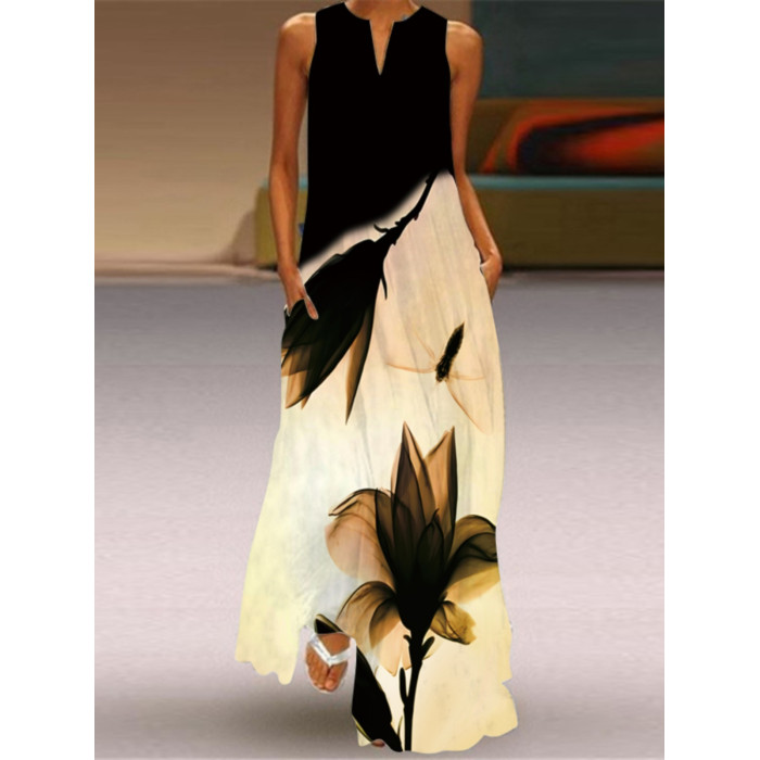 夏季薄款大碼女裝 新中式3D印花時尚V領插兜長裙 大擺無袖連衣裙