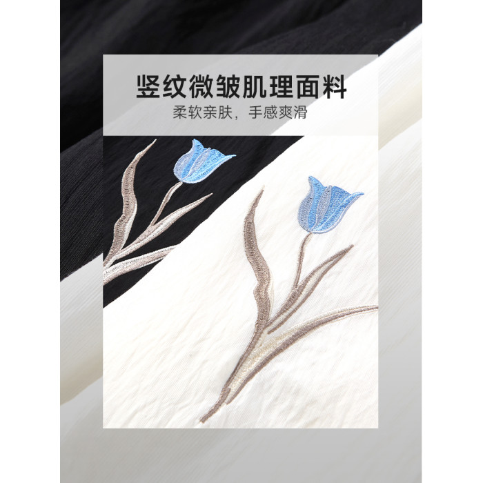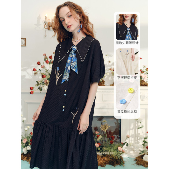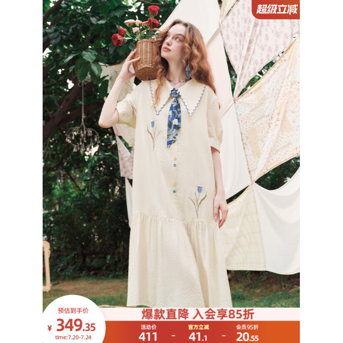 兩三事法式襯衫連衣裙2025新款夏季印花刺綉寬松短袖長裙濃情香鬱