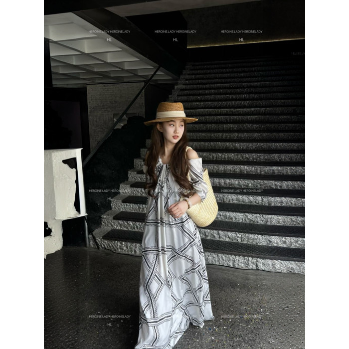 【桂馥蘭香】HL棉綢夏季高級氣質顯瘦露肩系繩寬松短袖長款連衣裙