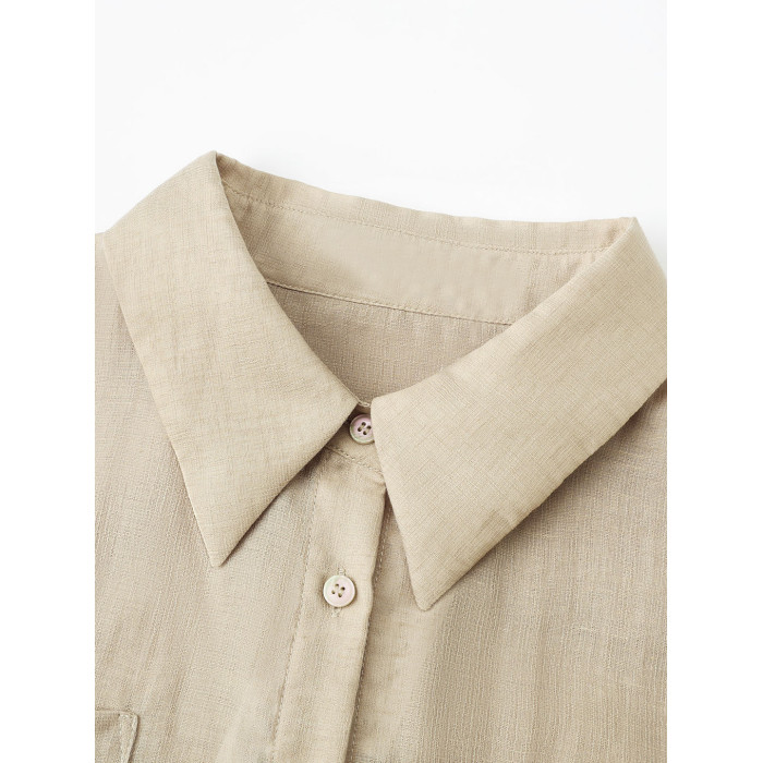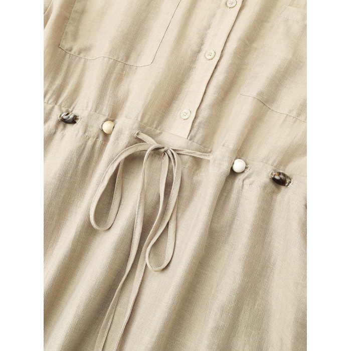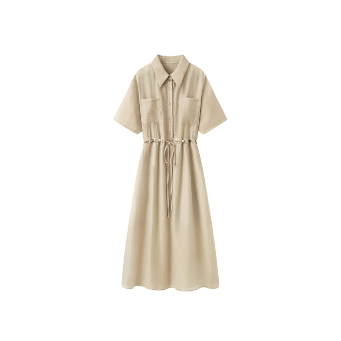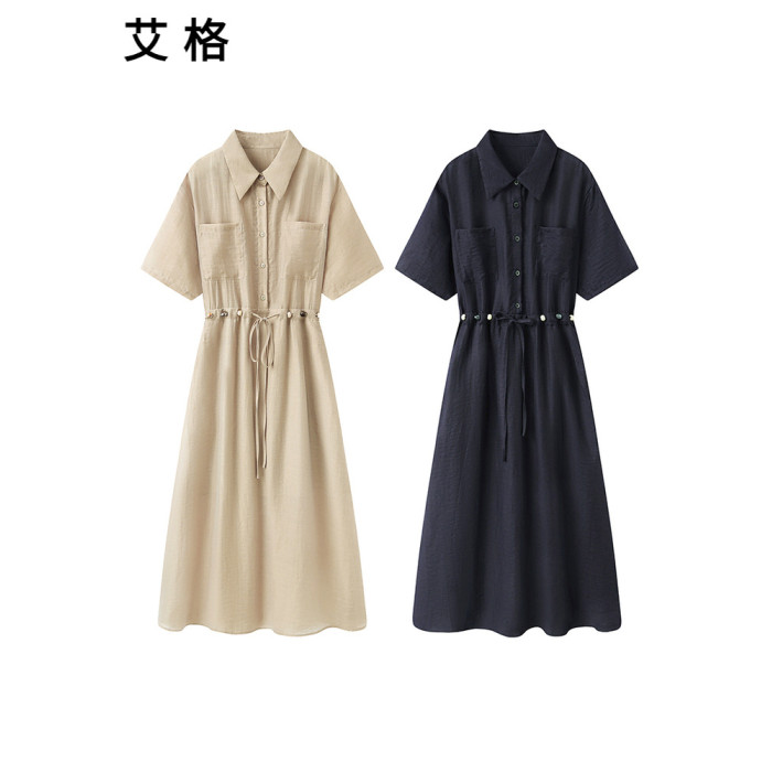 艾格2025夏季款通勤百搭休閒短袖襯衫裙萊賽爾天絲亞麻串珠連衣裙