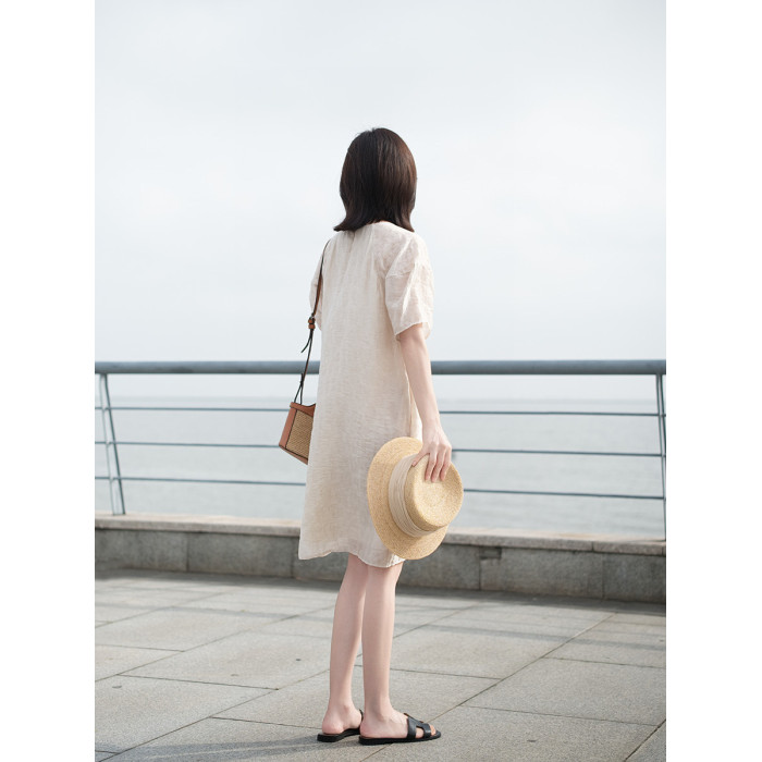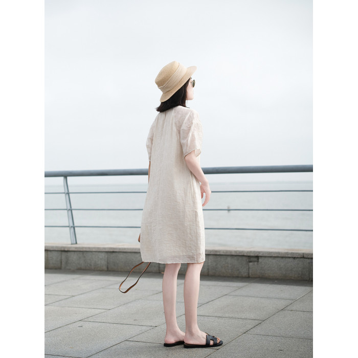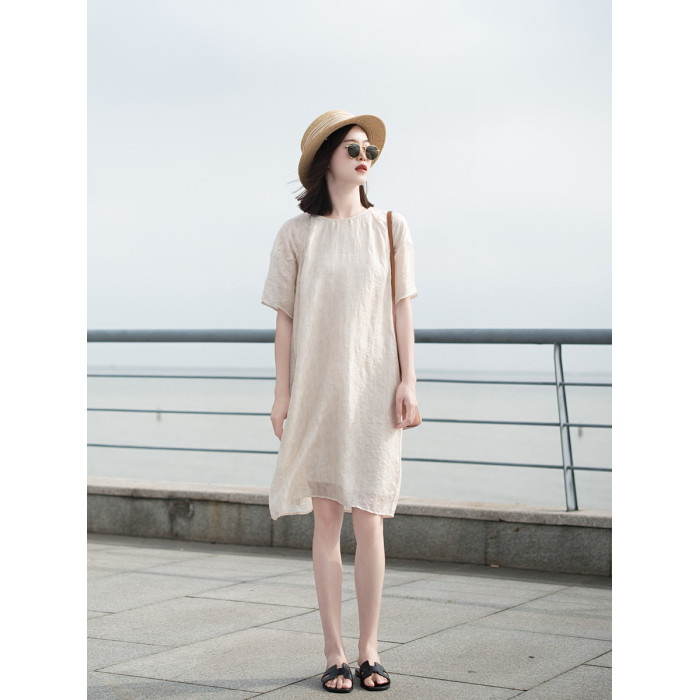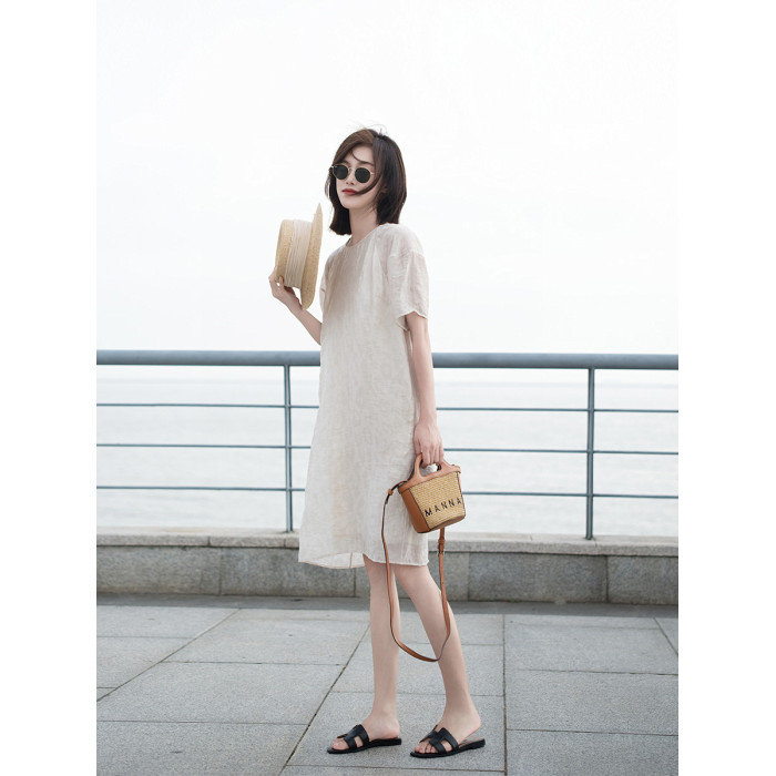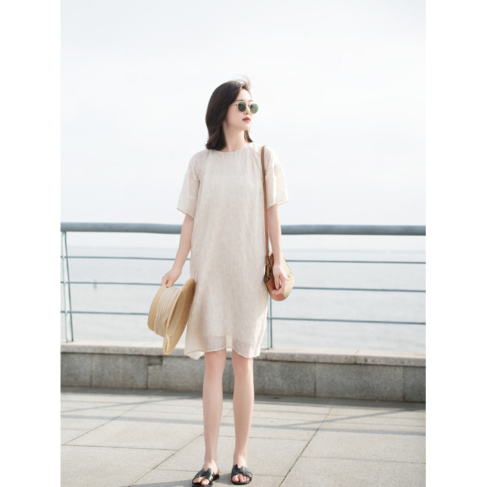 2025夏季新款寬松大碼中長款連衣裙女米白色天絲短袖裙遮肉顯瘦
