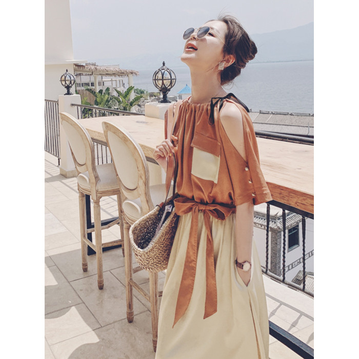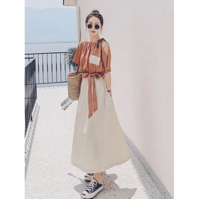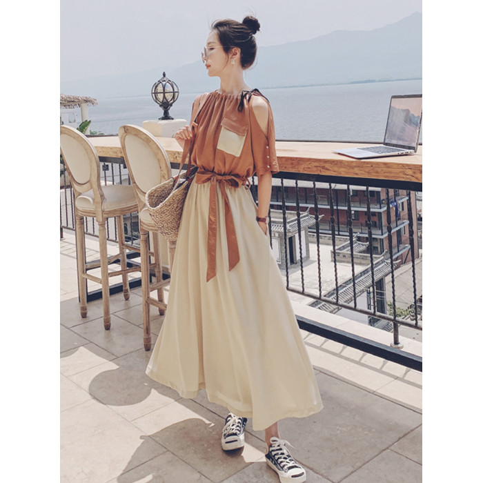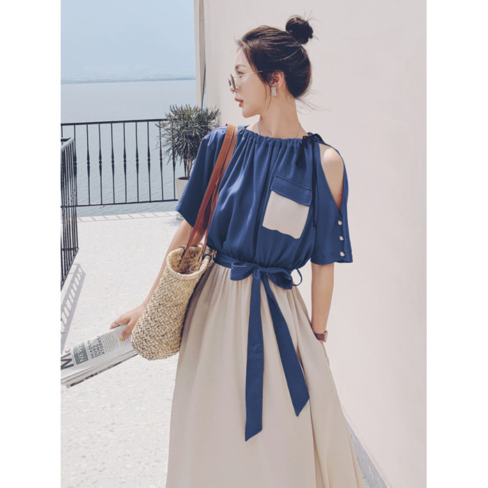 藍色假兩件連衣裙女2025夏季新款法式氣質設計感小衆到及腳踝長裙