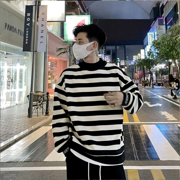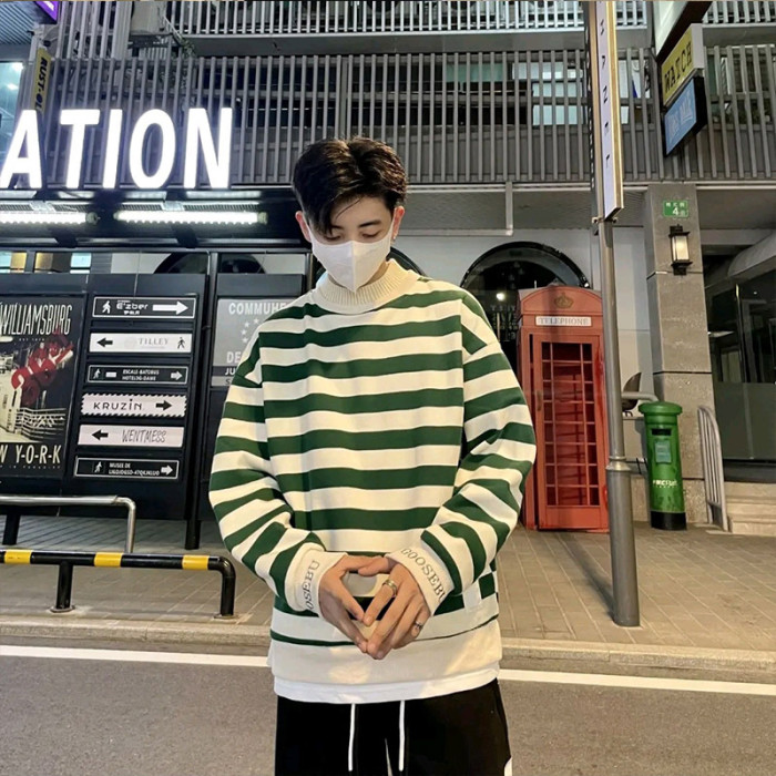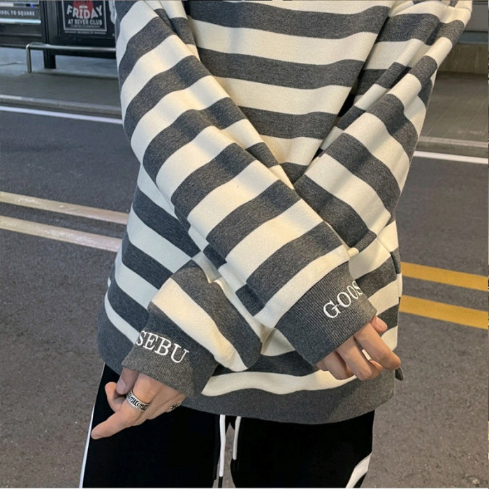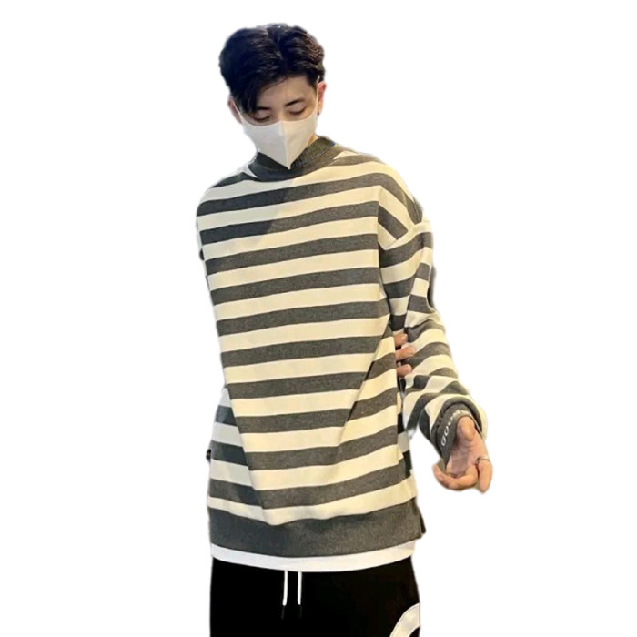 YOA秋冬新款潮牌加絨加厚保暖圓領條紋假兩件百搭長袖衛衣打底衫