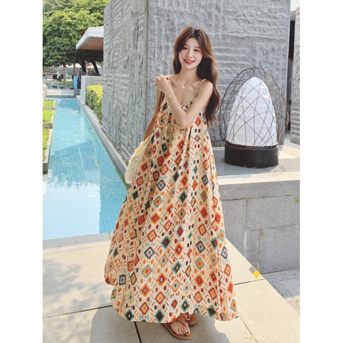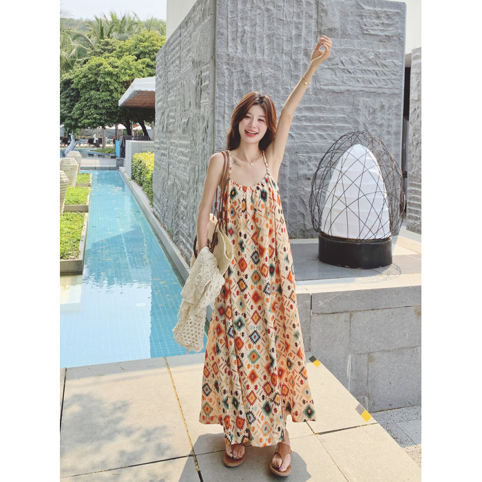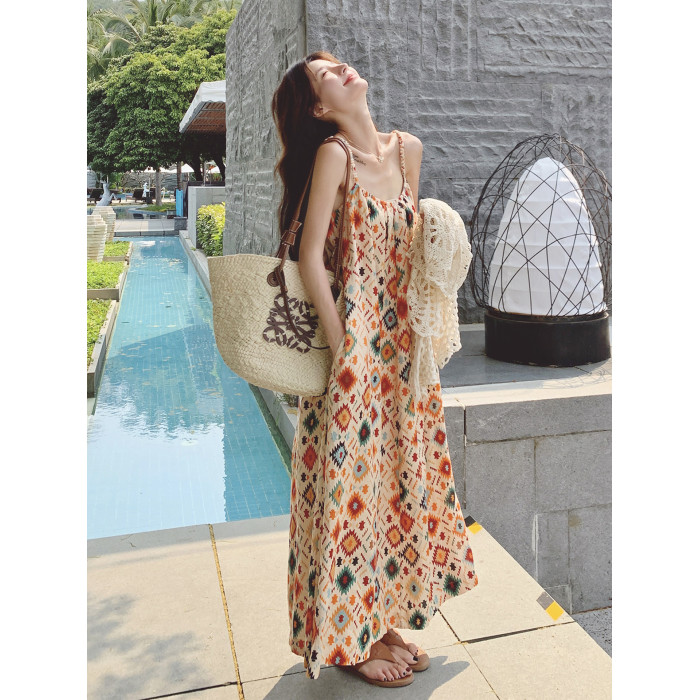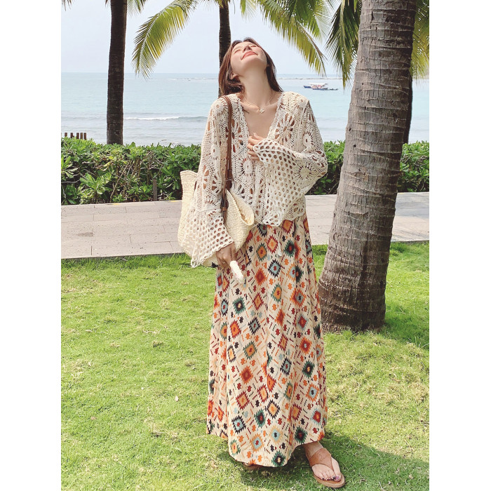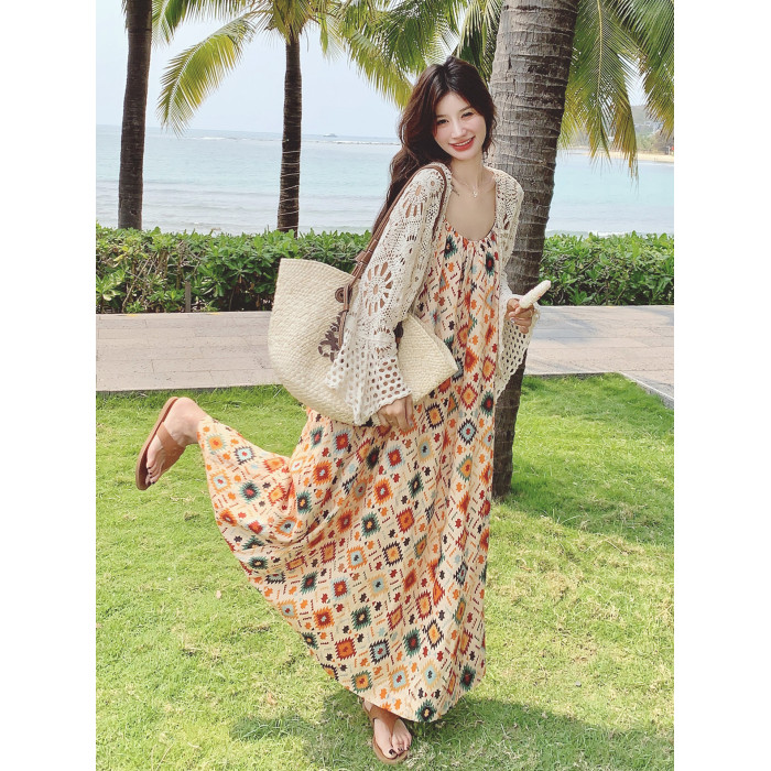 波西米亞風印花吊帶連衣裙套裝女2025夏季新款鏤空開衫長裙兩件套
