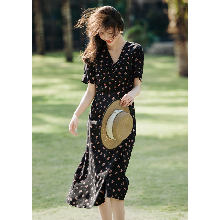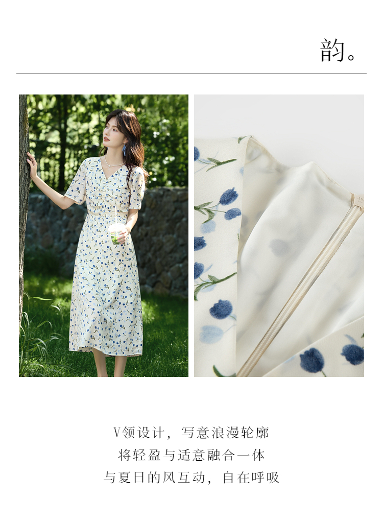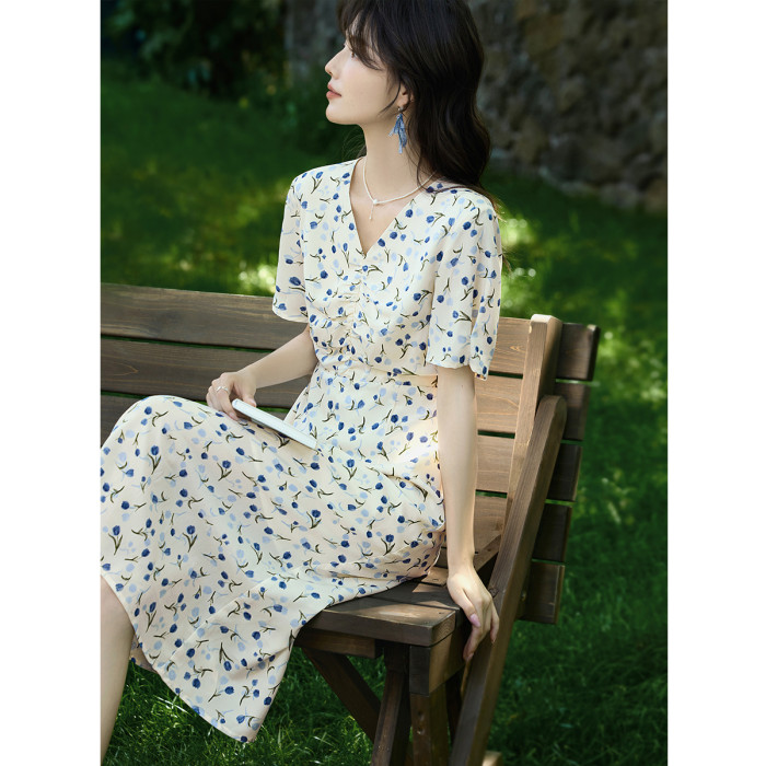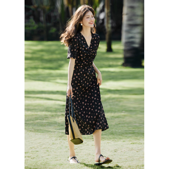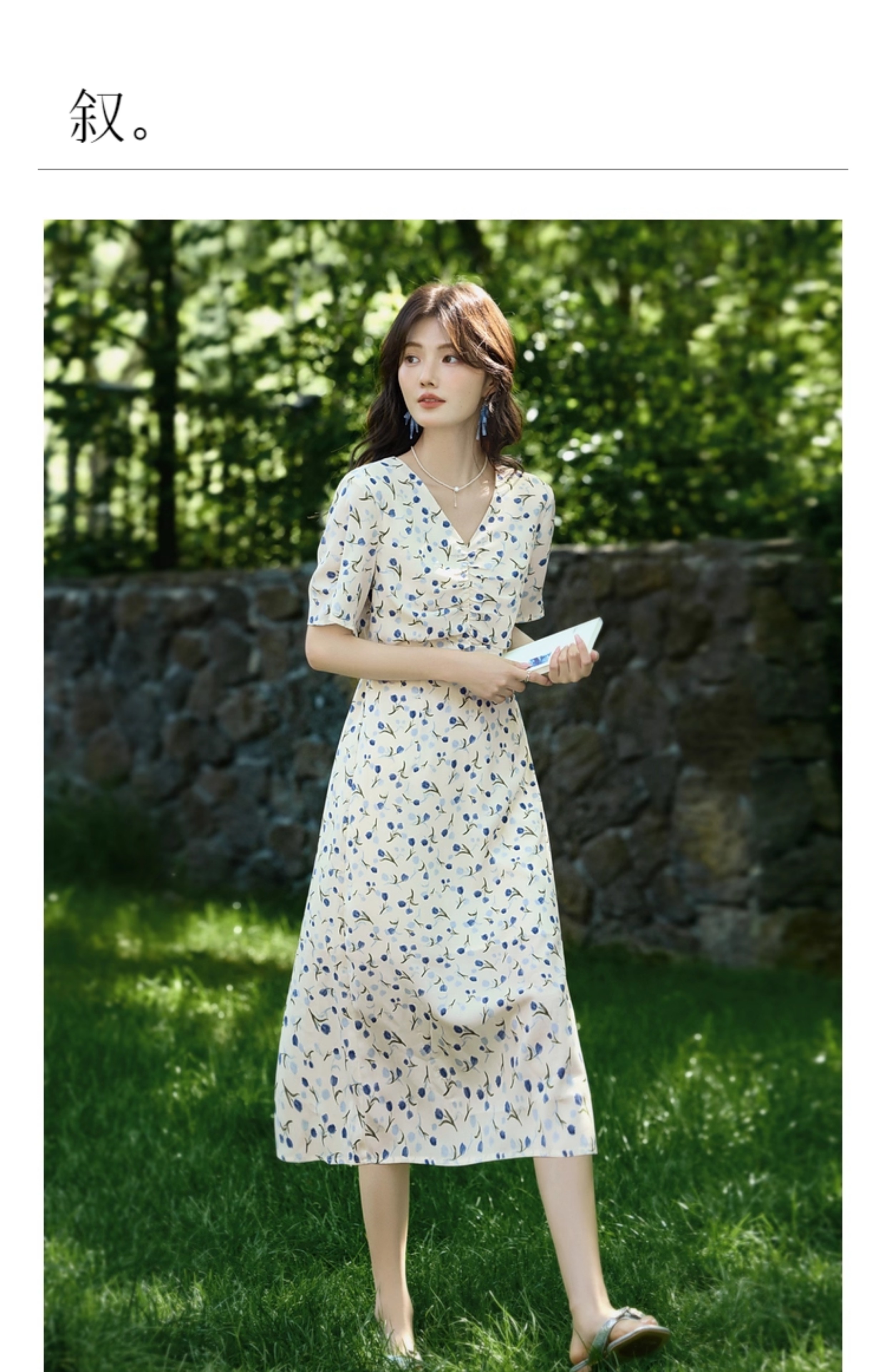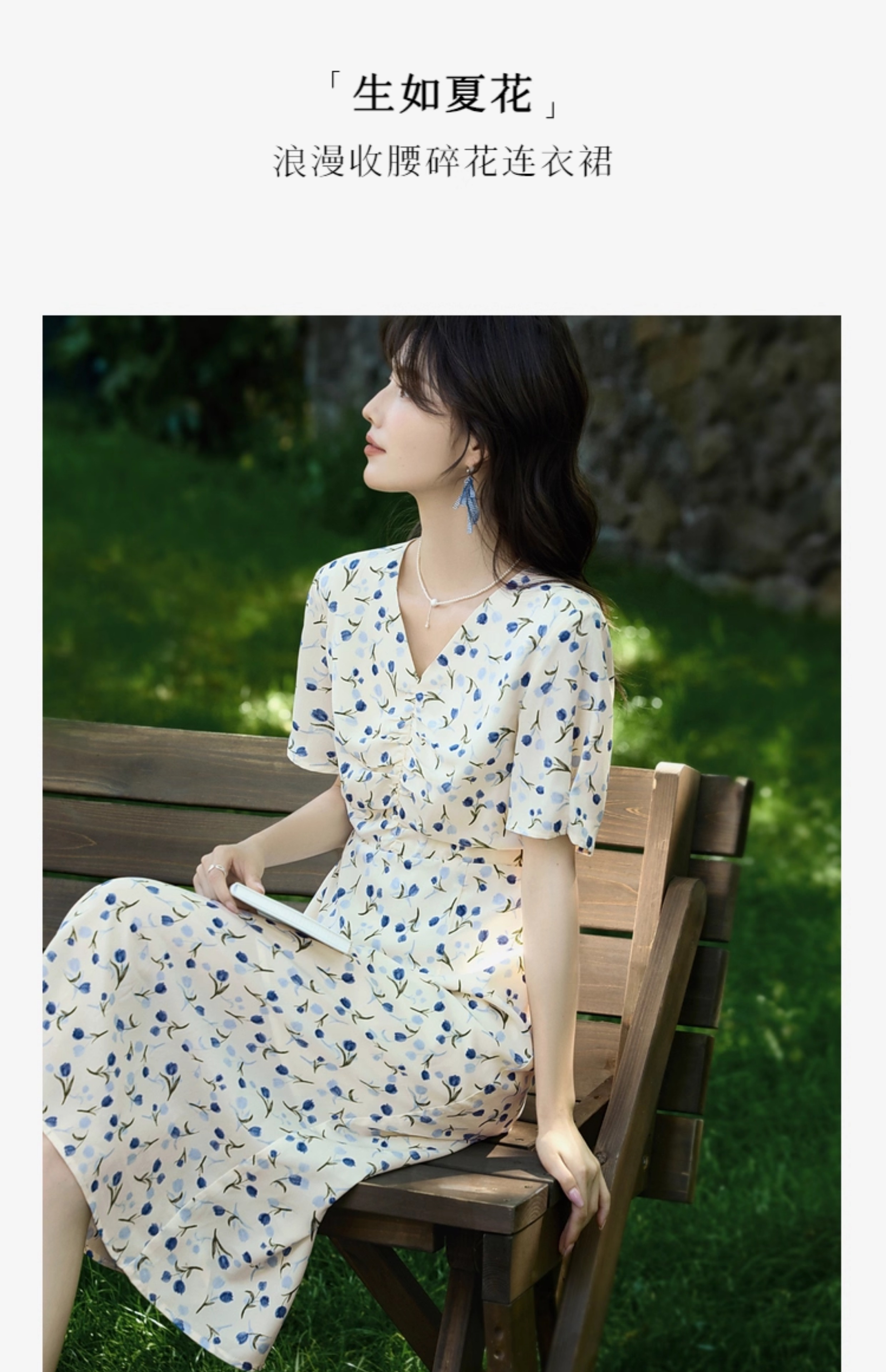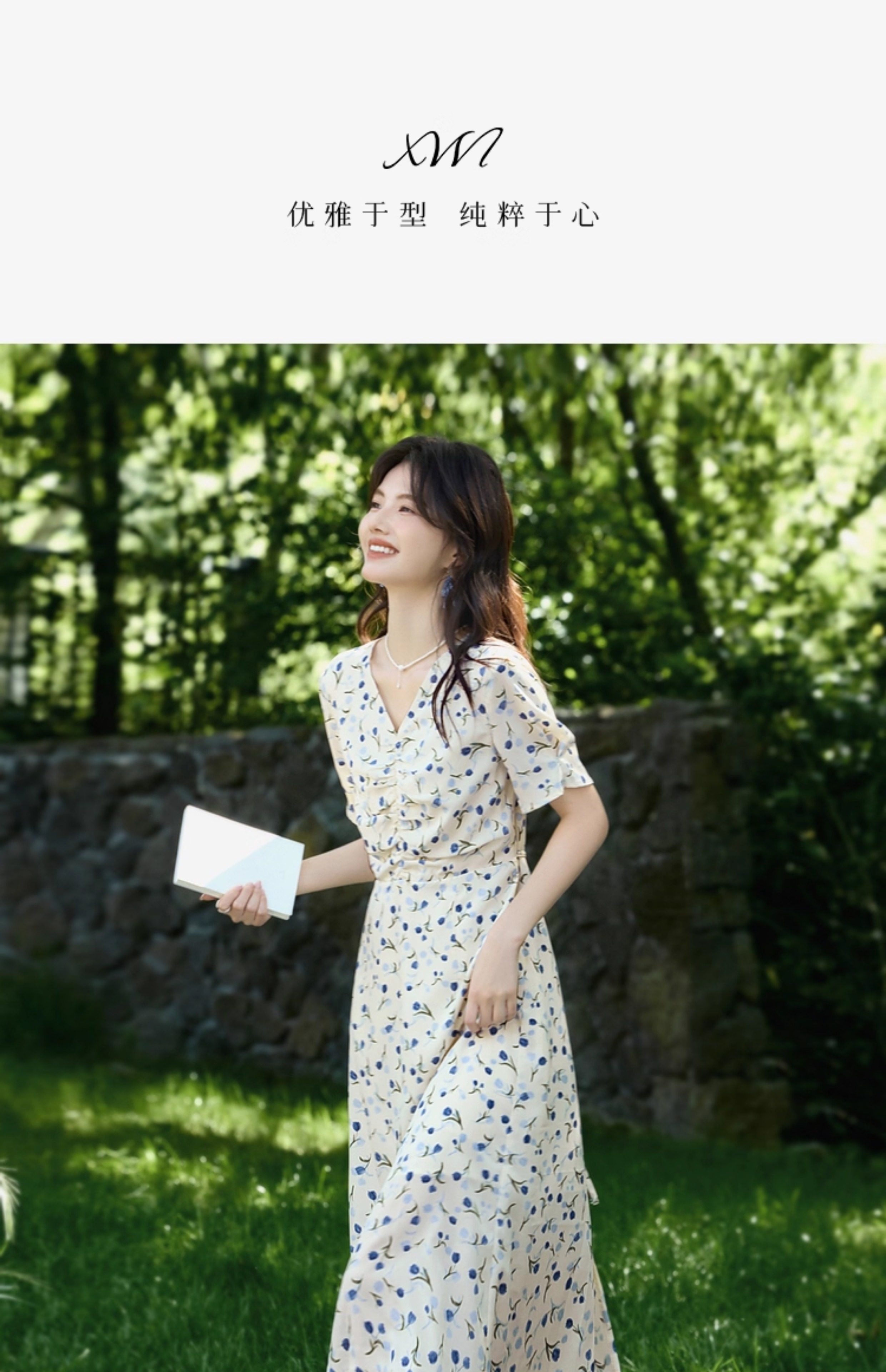 XWI訢未法式優雅V領碎花連衣裙女夏海邊度假風穿搭掐腰氣質茶歇裙