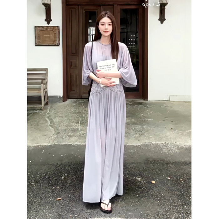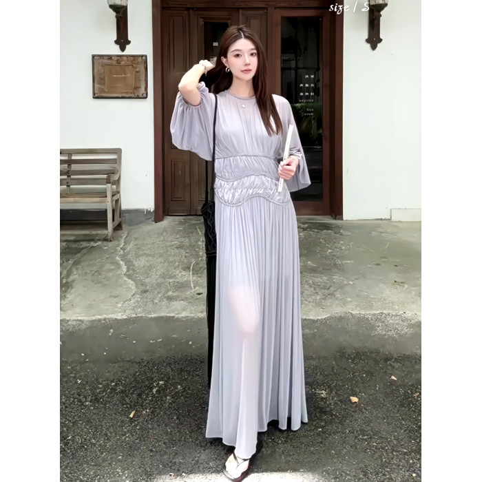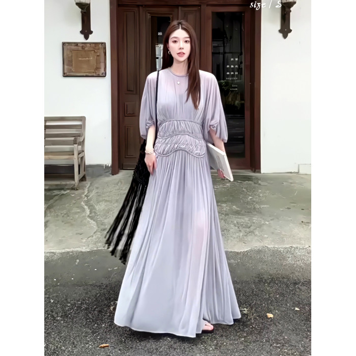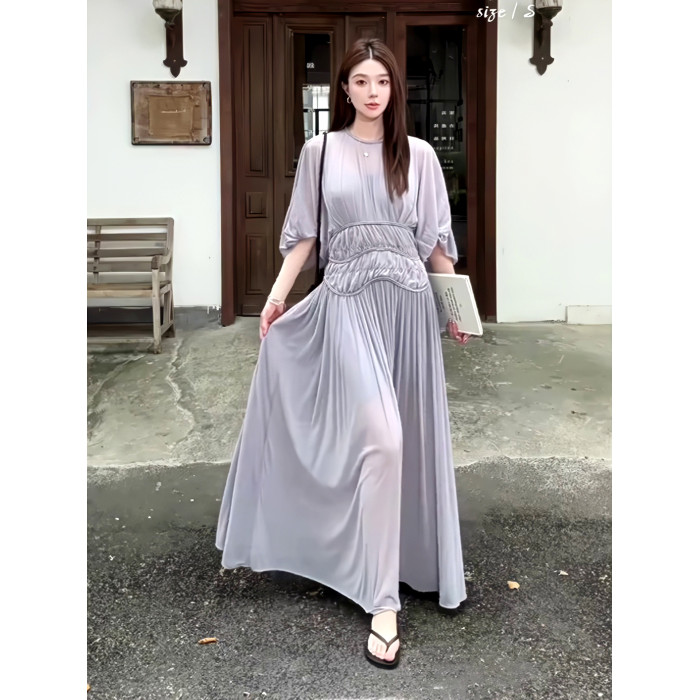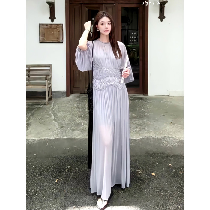 2025夏季 復古氣質長款燈籠袖薄款收腰連衣裙高級感紗絲腰封長裙