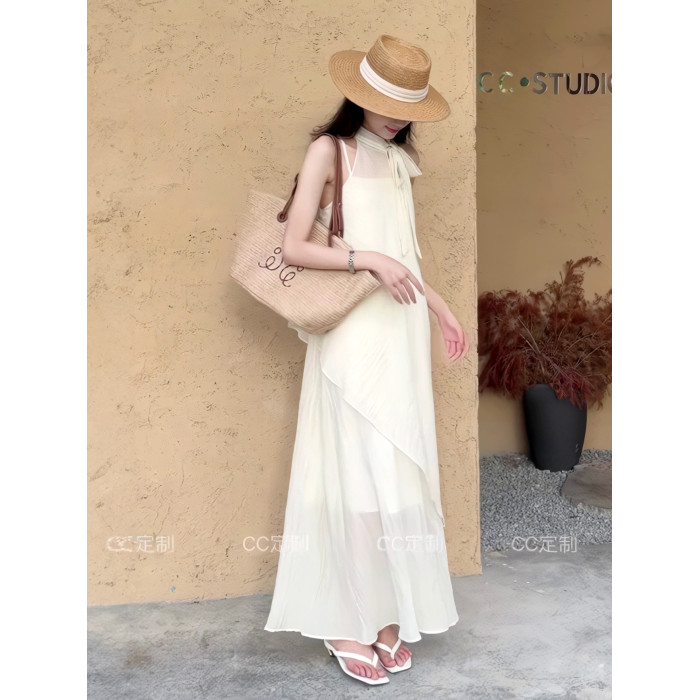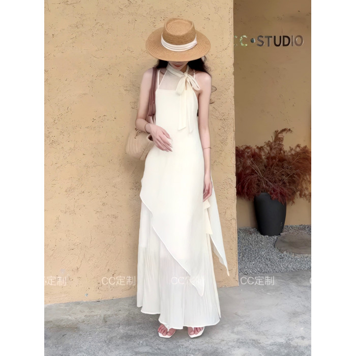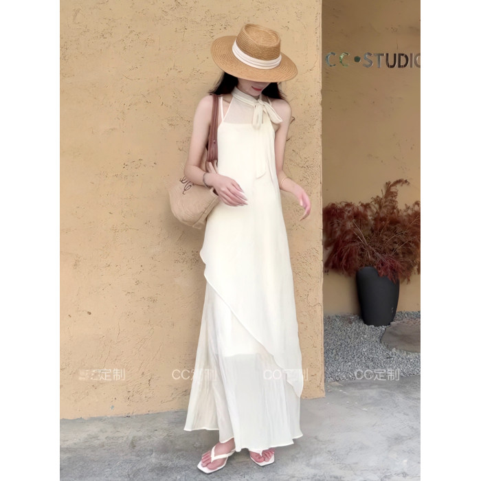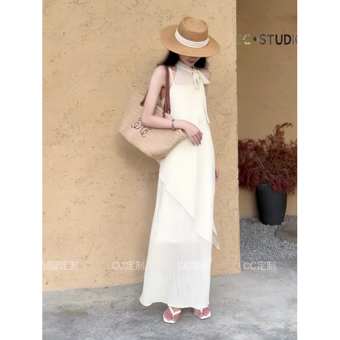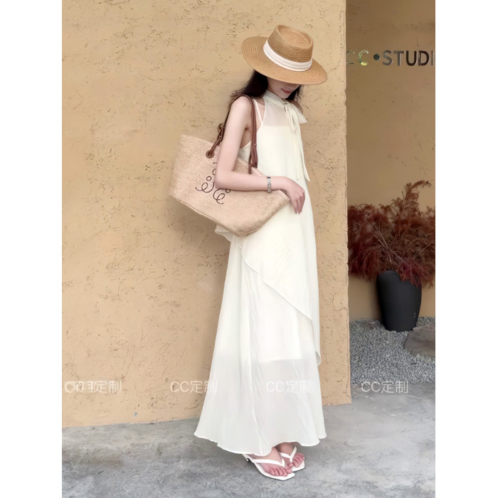 溫柔度假風吊帶連衣裙兩件套女夏季亞麻肌理感不規則掛脖上衣套裝