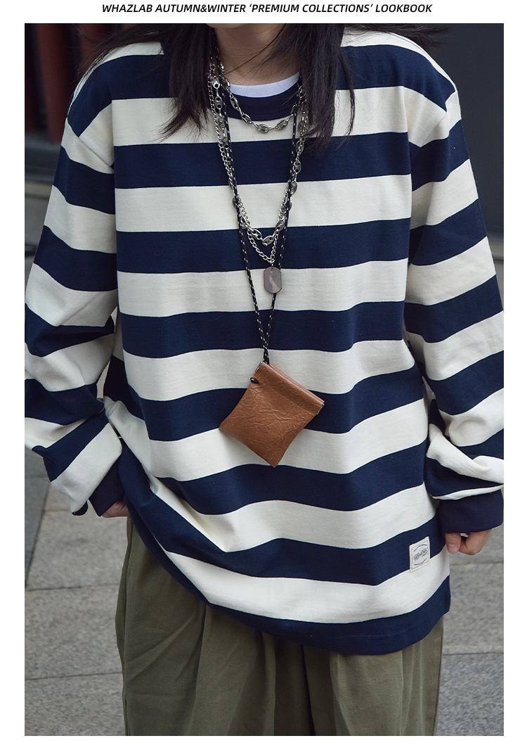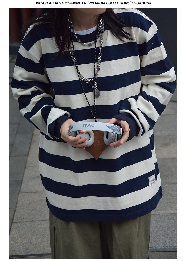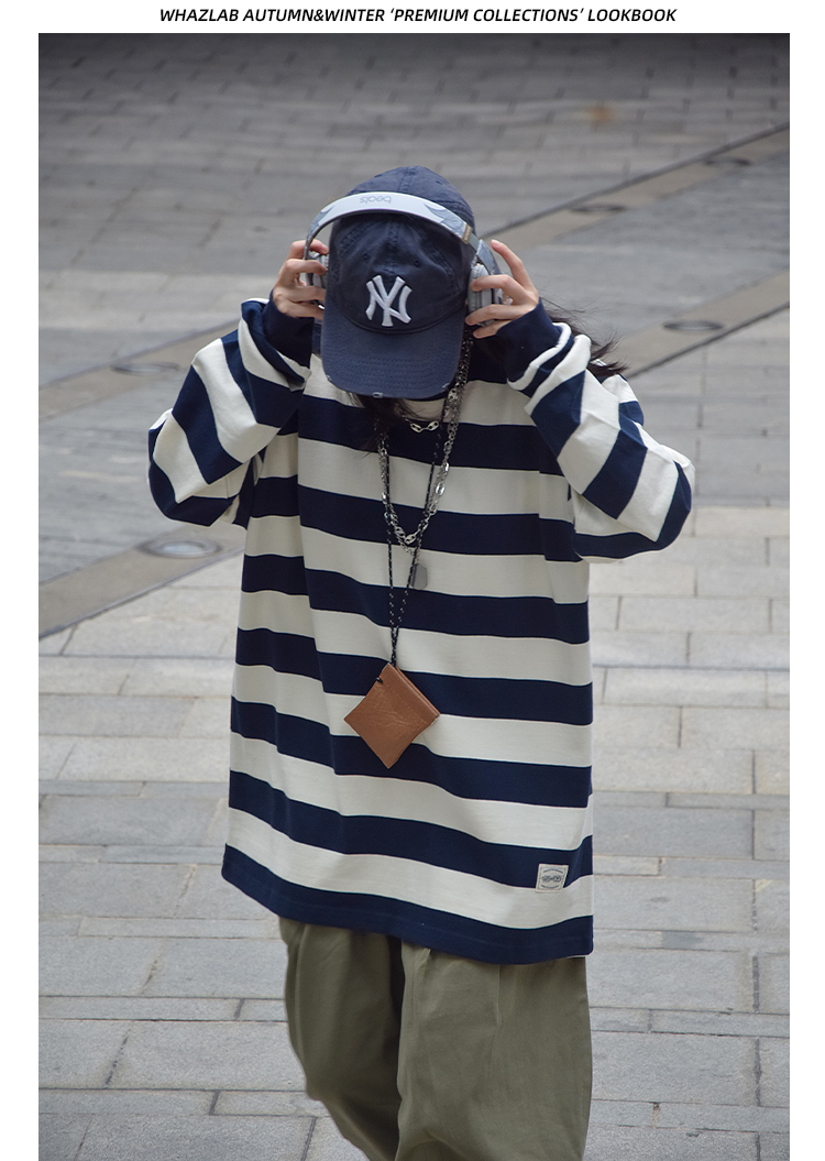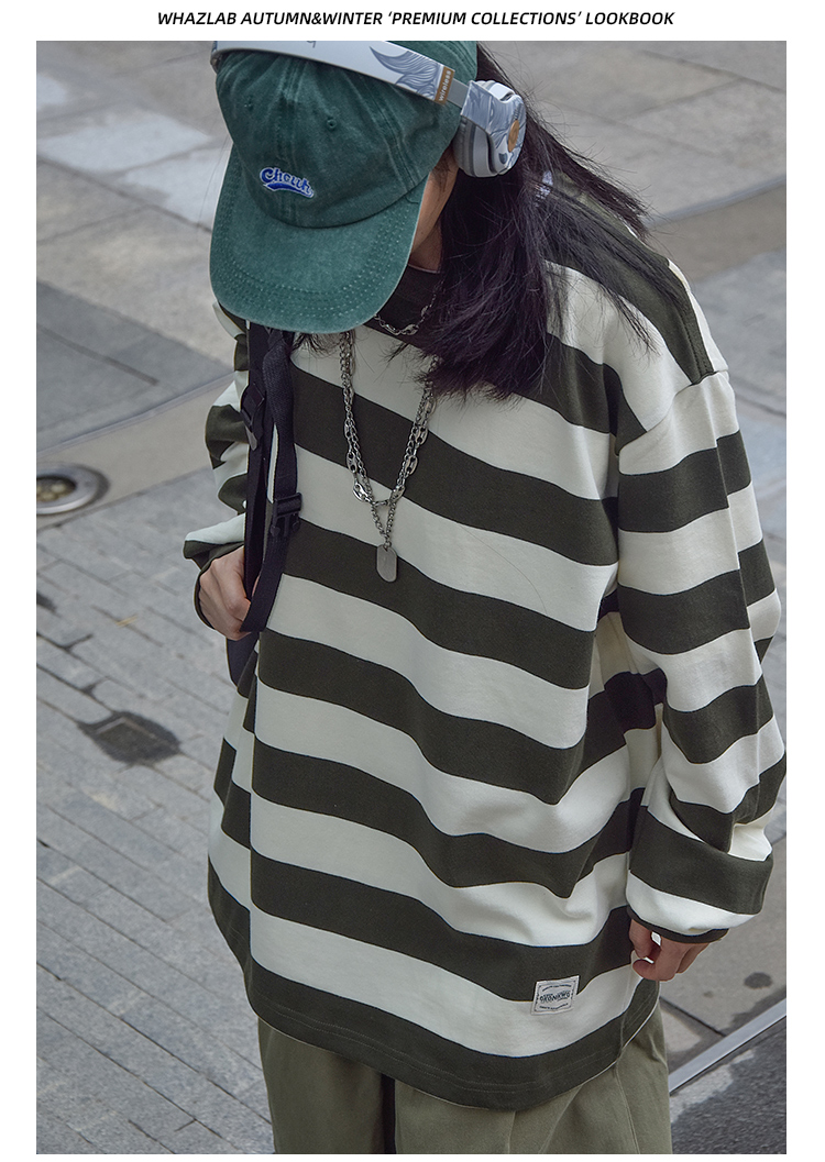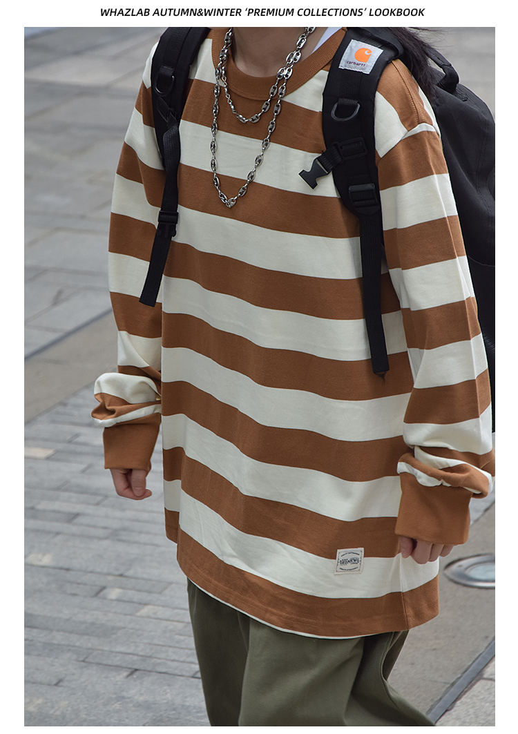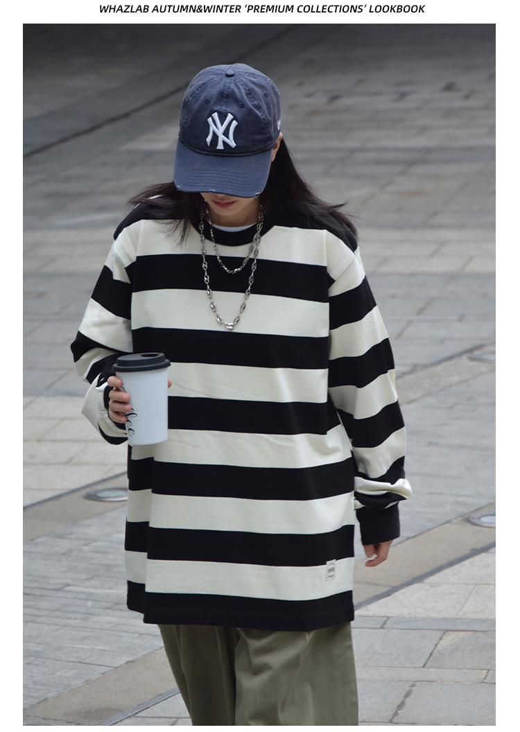 WHAZLAB|日系復古條紋重磅長袖打底衫衛衣寬松cityboy男女情侶潮