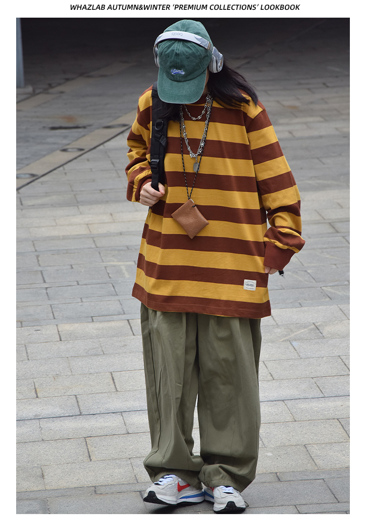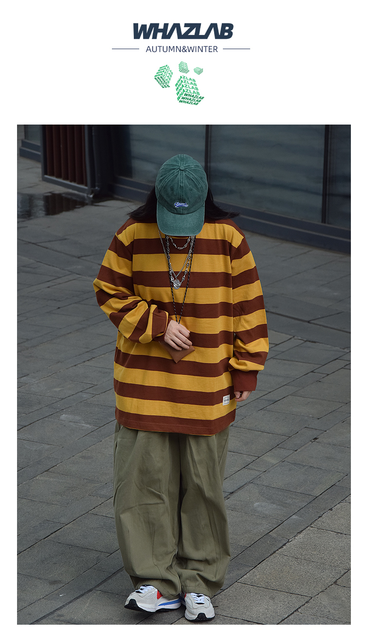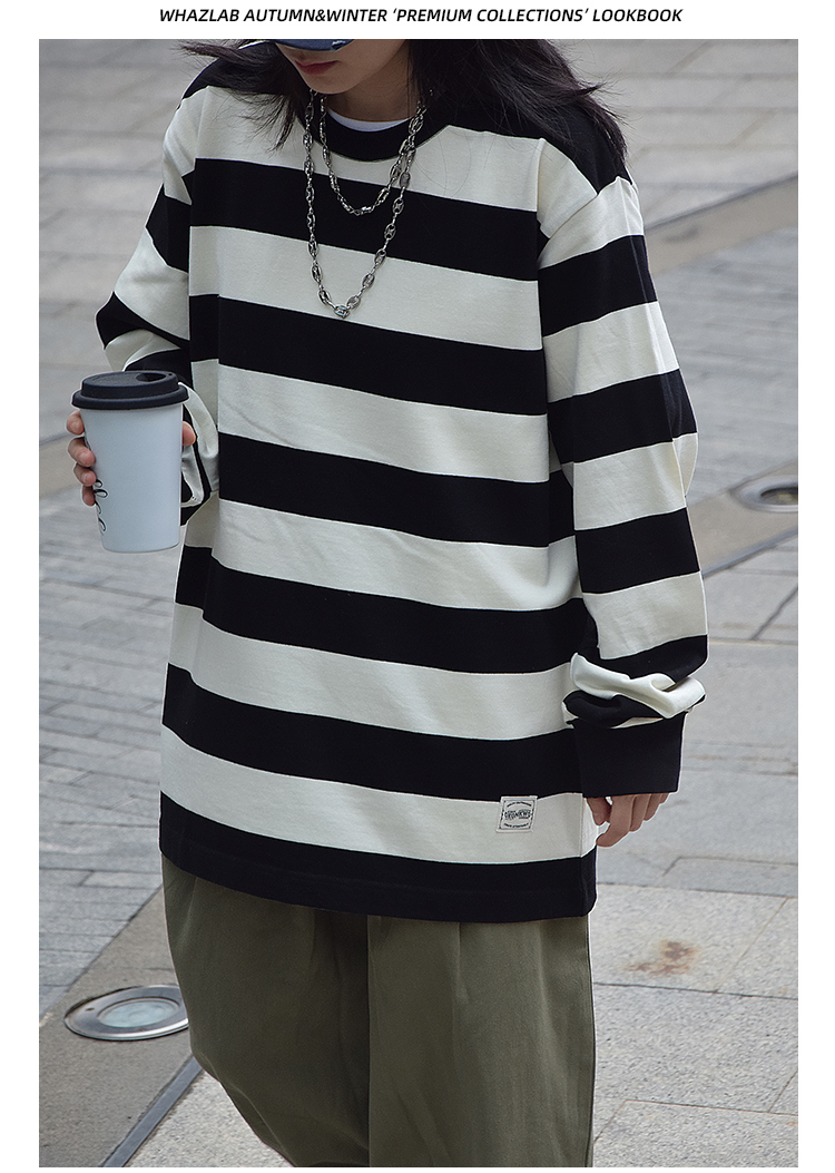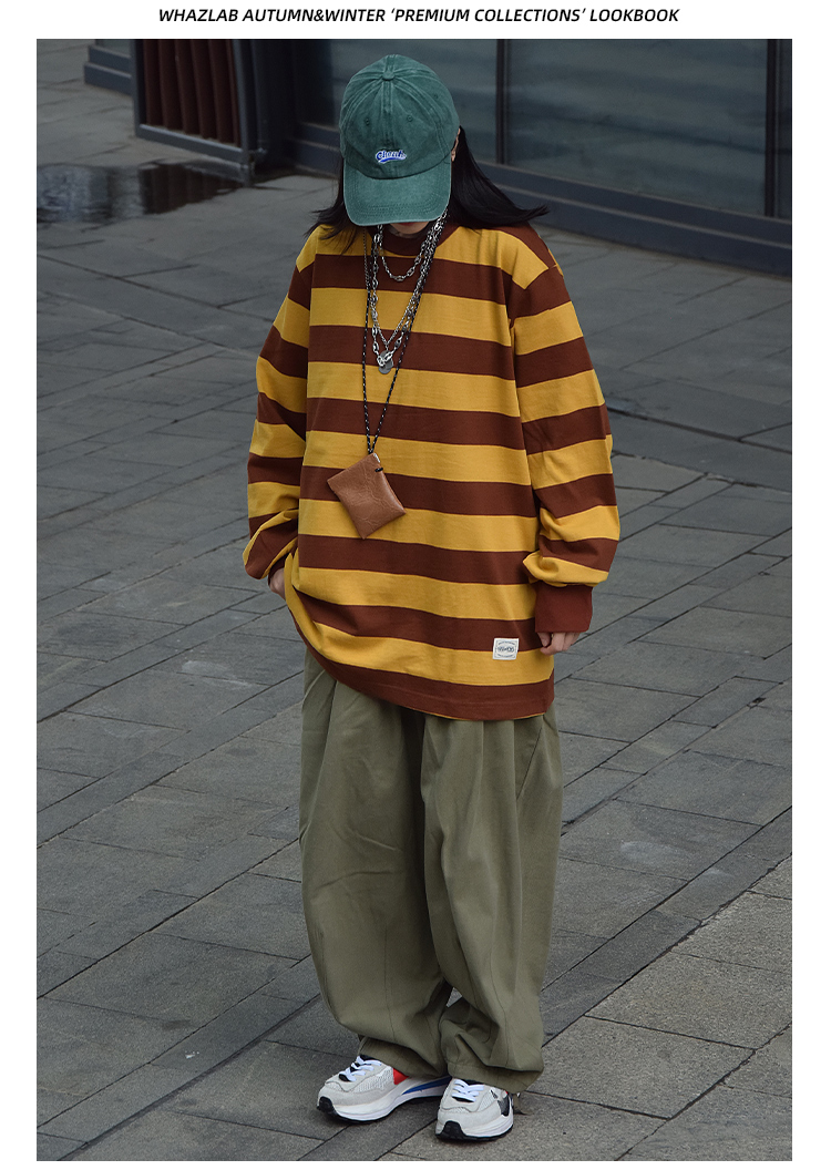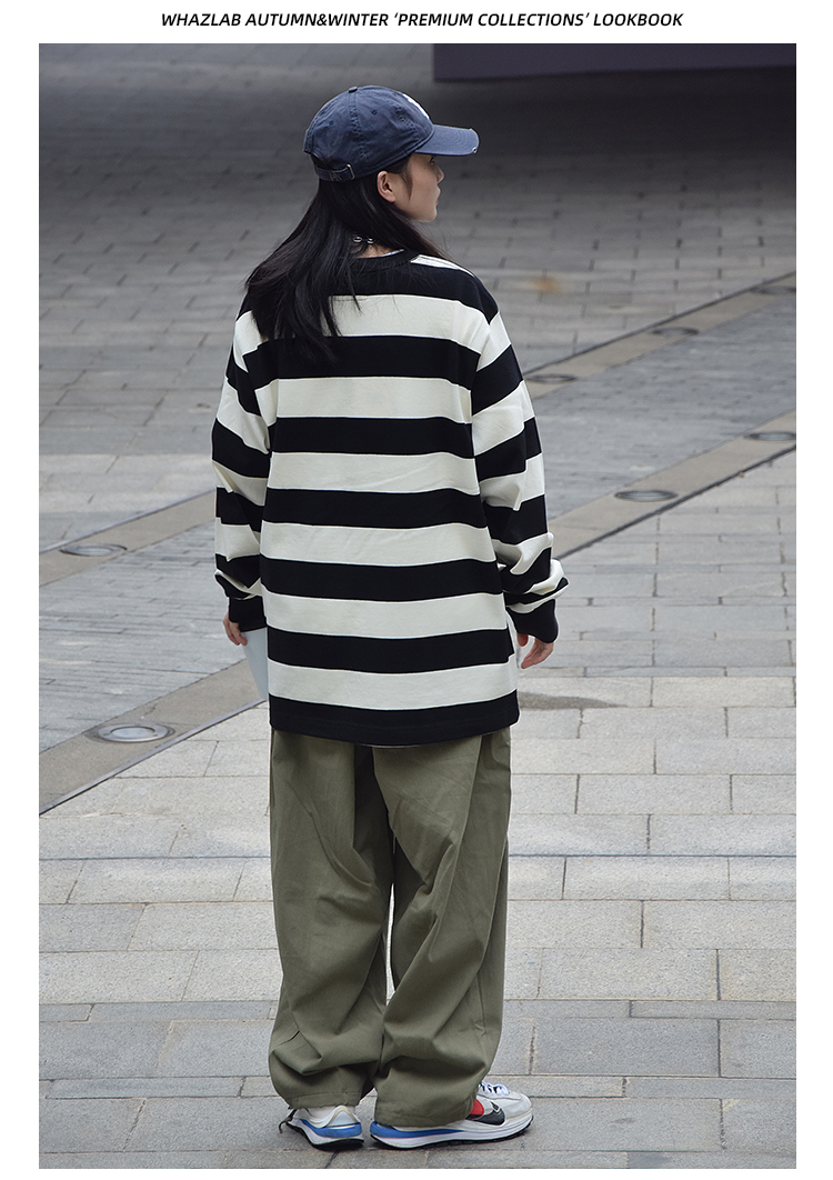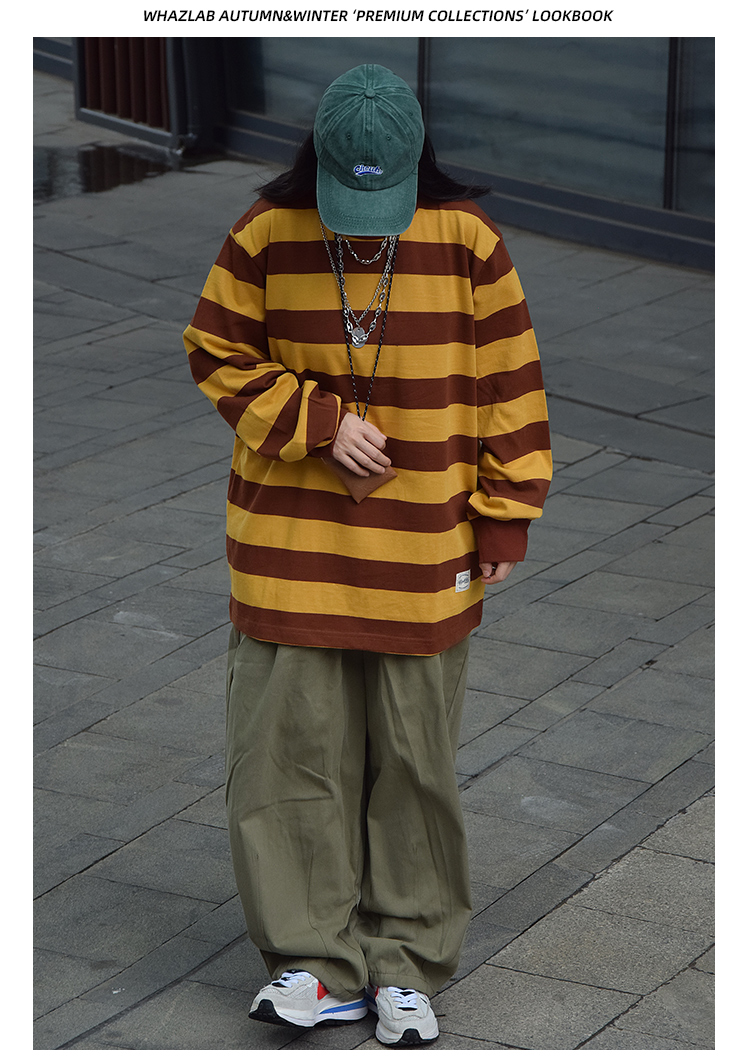 WHAZLAB|日系復古條紋重磅長袖打底衫衛衣寬松cityboy男女情侶潮