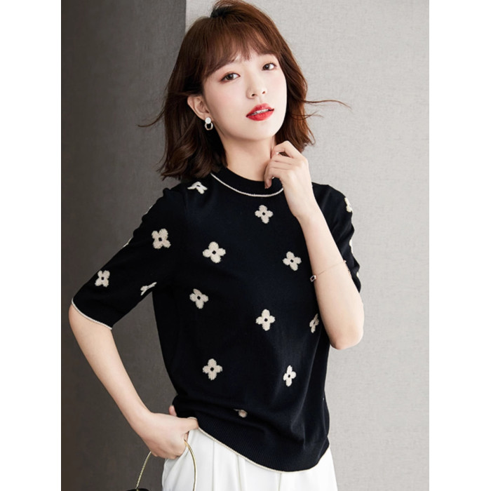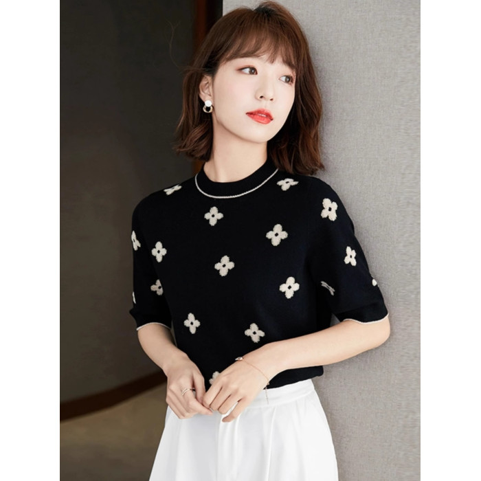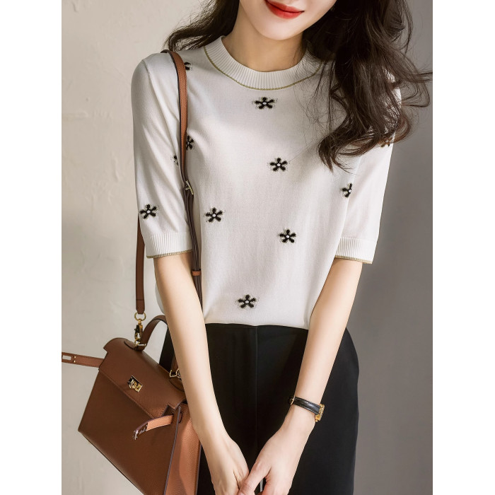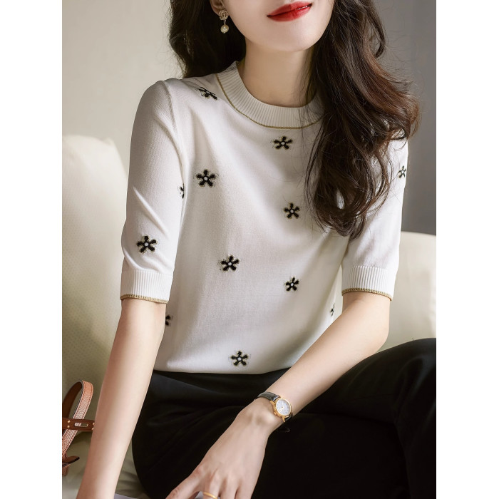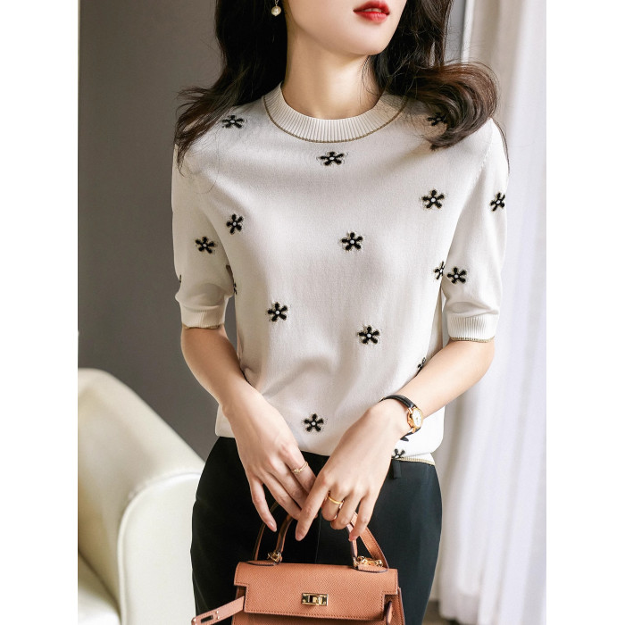 冰絲針織衫女夏2025新款寬松百搭顯瘦時尚洋氣圓領短袖打底衫上衣