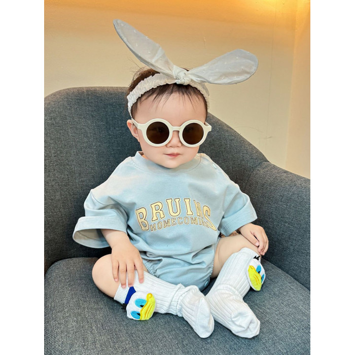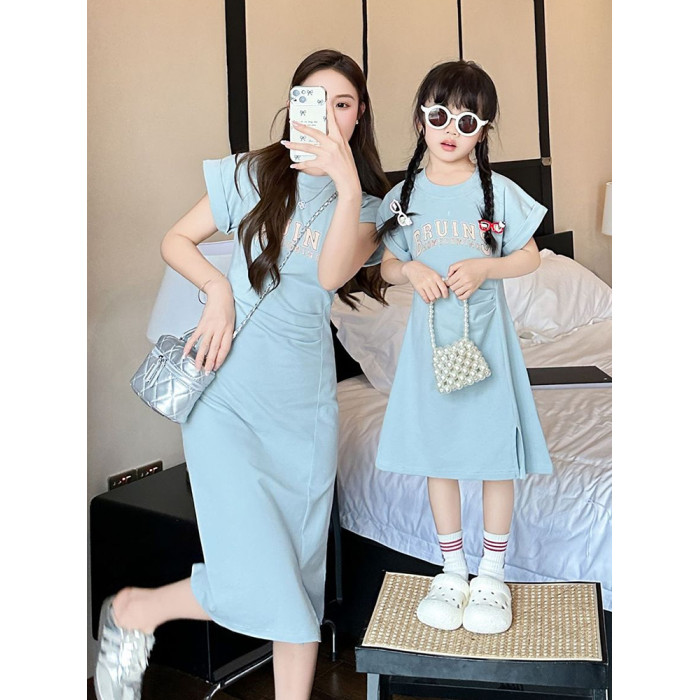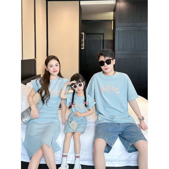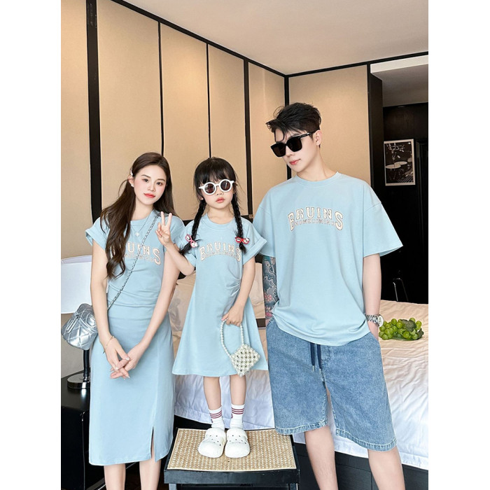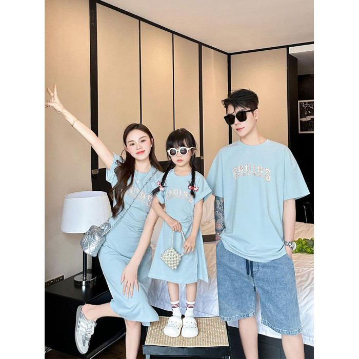 小月齡親子裝一家三四口 顯瘦母子母女嬰兒裝字母藍色連衣裙T恤
