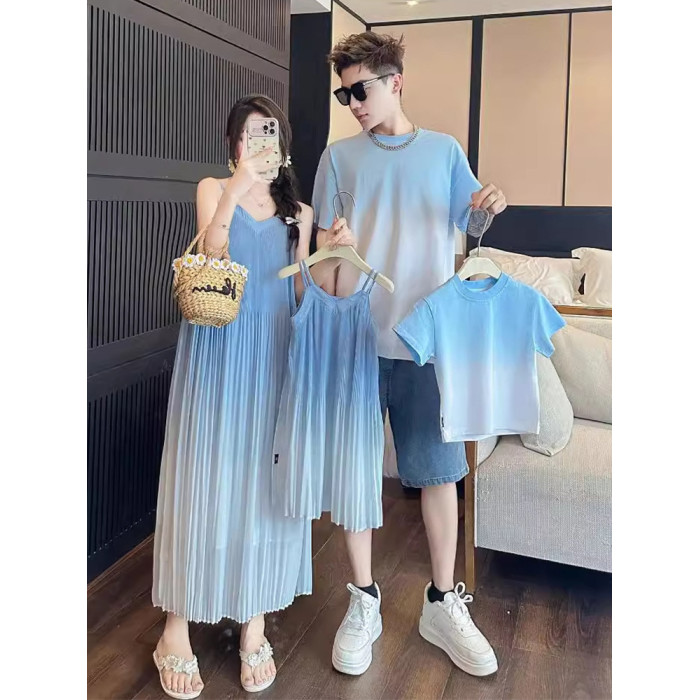 海邊度假親子裝母女裝2025新款藍色漸變夏一家三口沙灘T恤 連衣裙